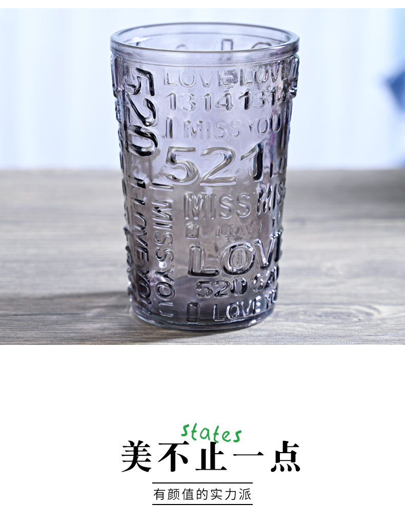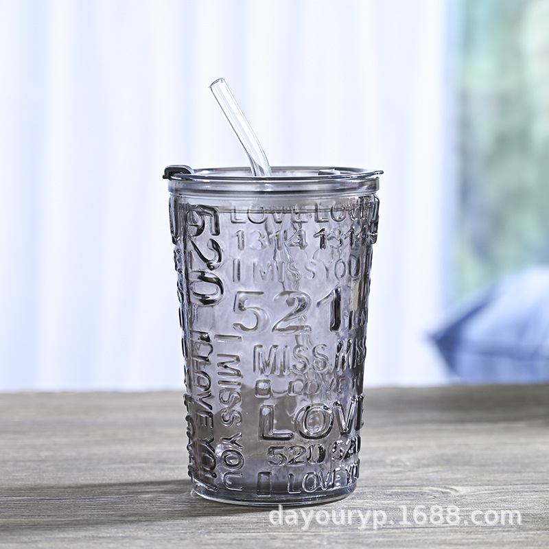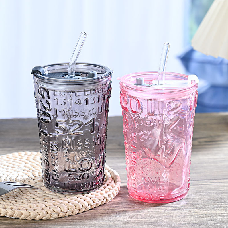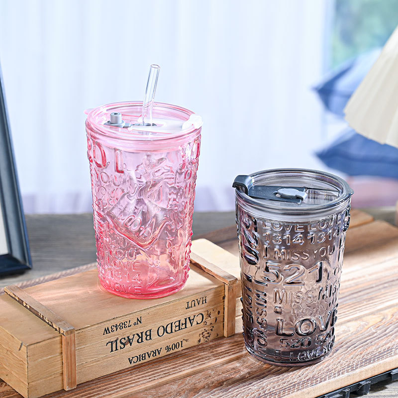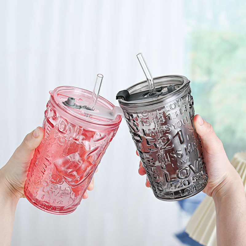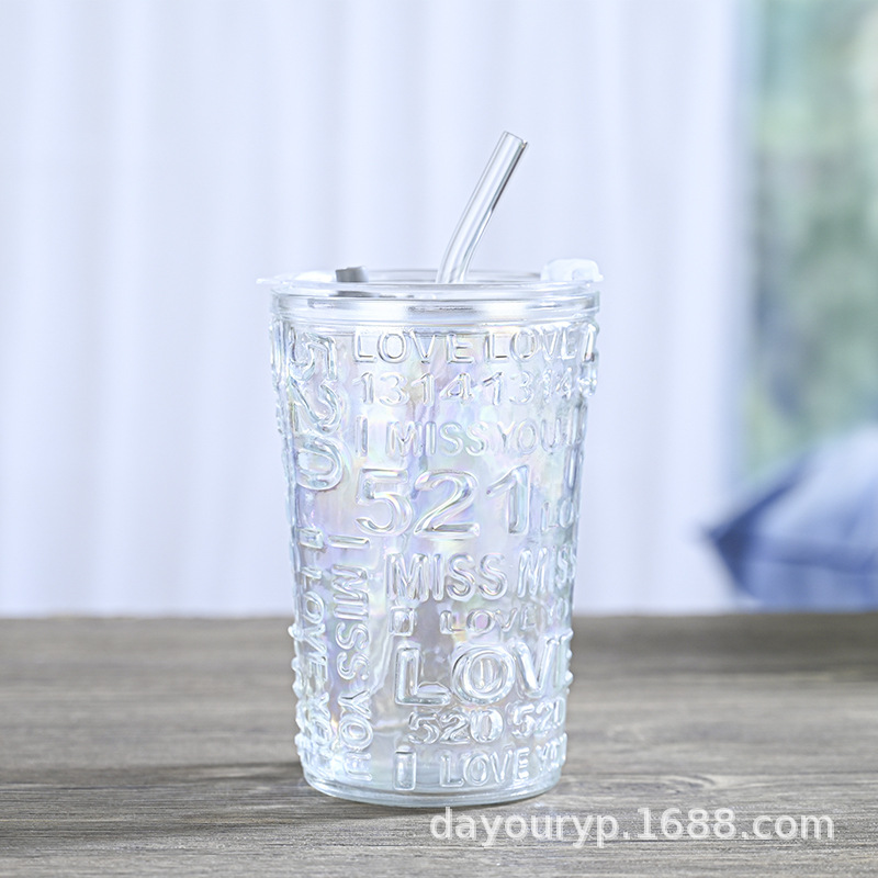 高颜值情侣比心杯浮雕带盖玻璃吸管杯ins风奶茶炫彩极光果汁杯女