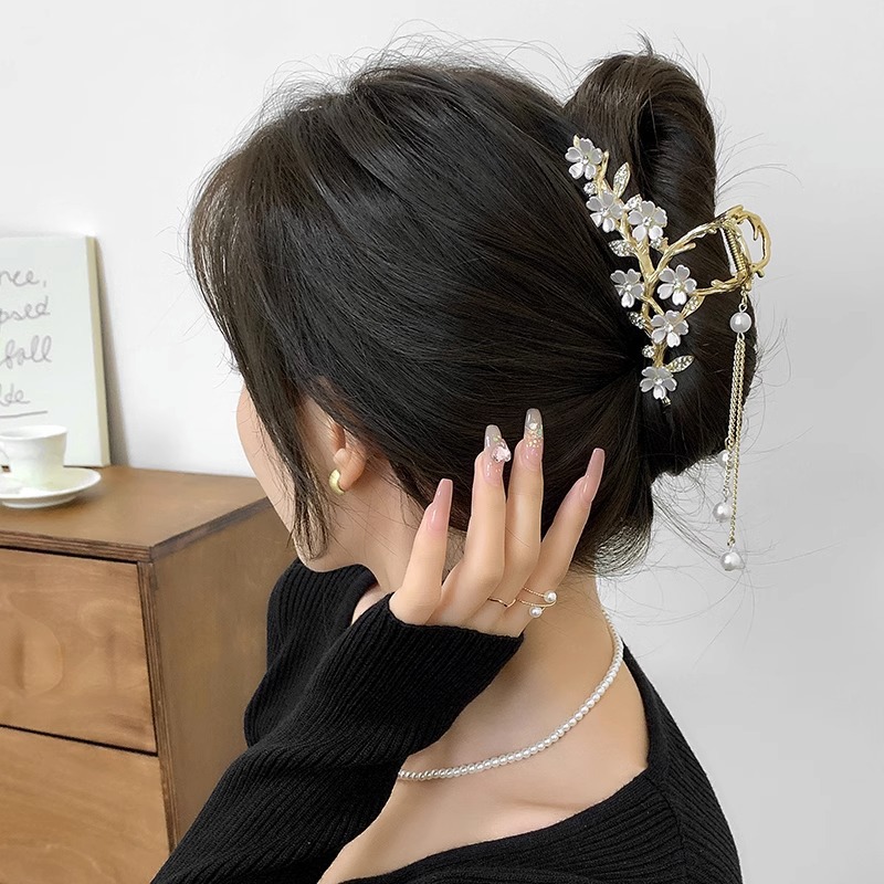 古风汉服流苏发夹女高级感后脑勺盘发抓夹花朵鲨鱼夹子发卡头饰夏