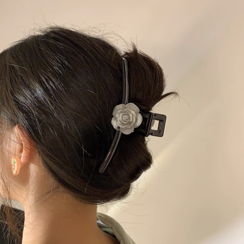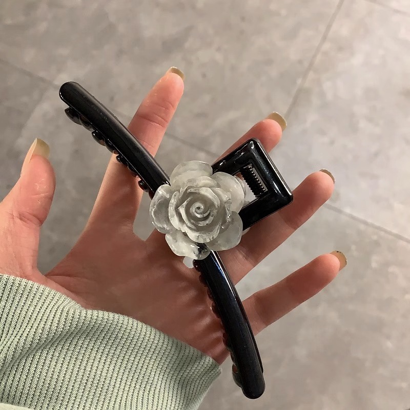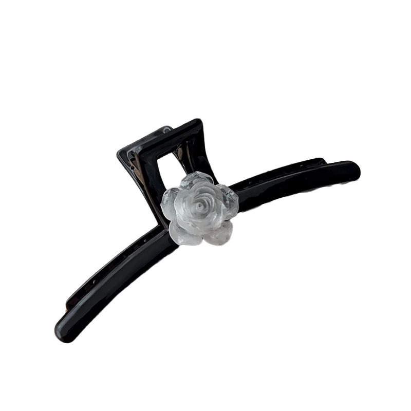 新中式黑色高级感山茶花抓夹女后脑勺盘发鲨鱼夹白雾花朵发夹发饰