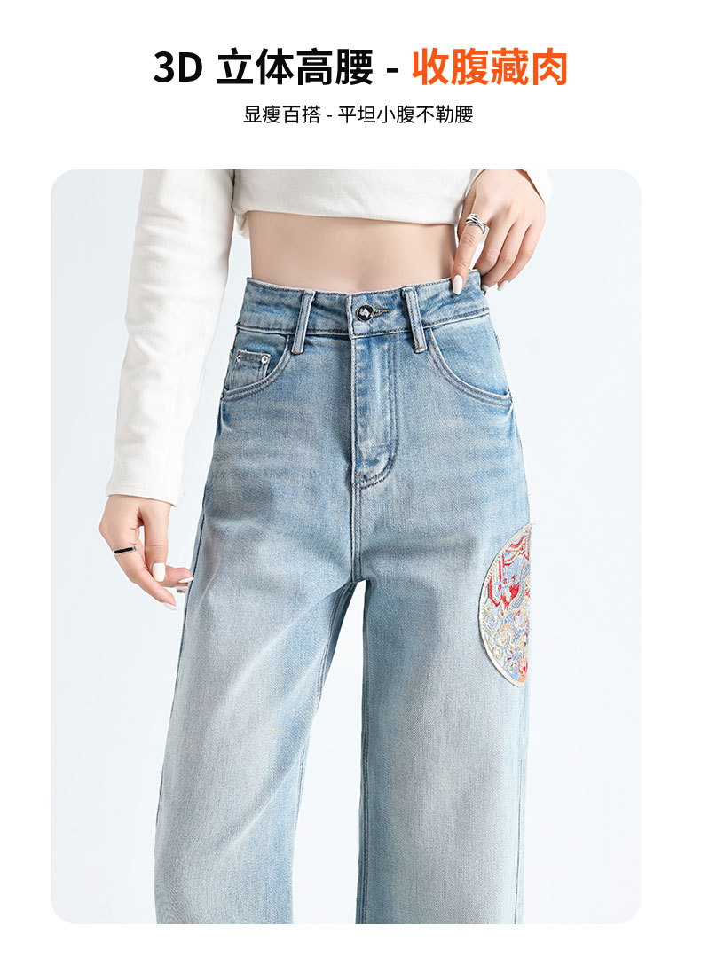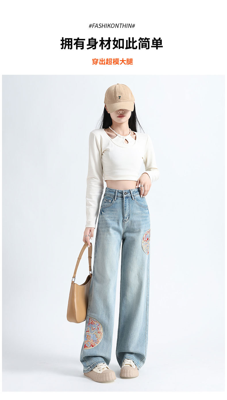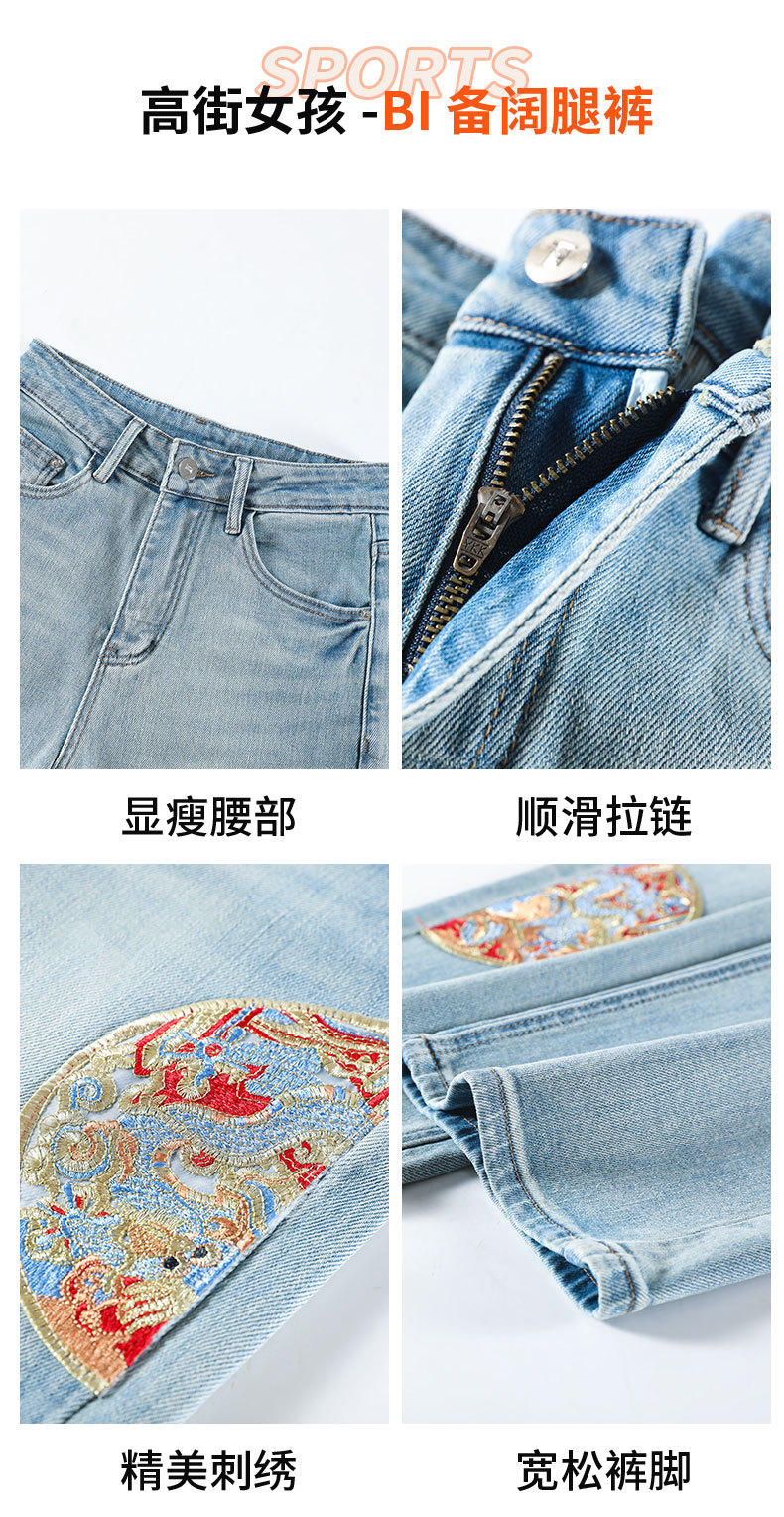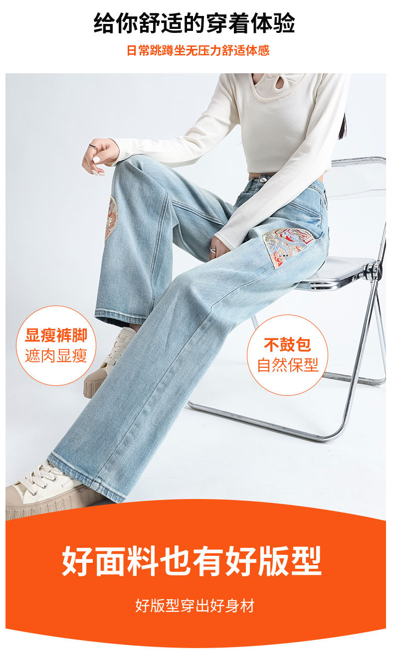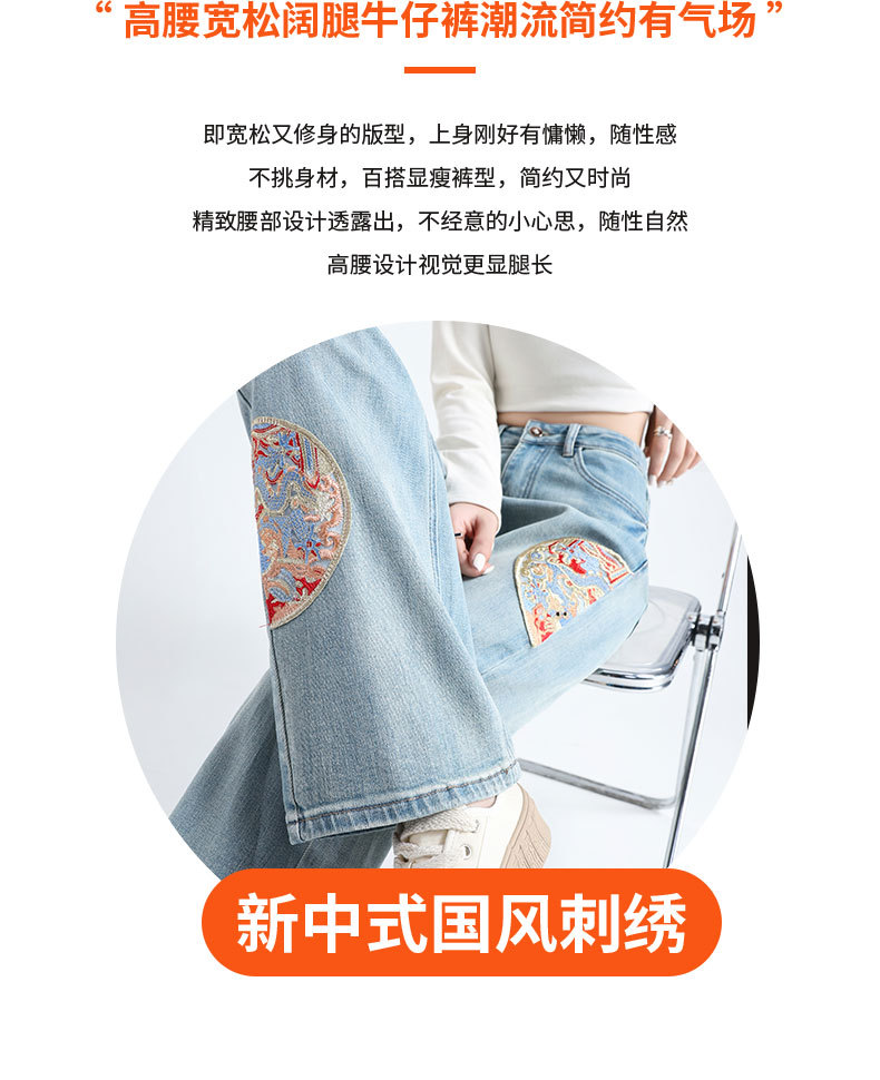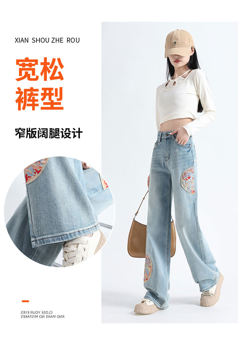 实拍国风直筒牛仔裤2024早春款高级品质刺绣设计感百搭宽松裤子潮