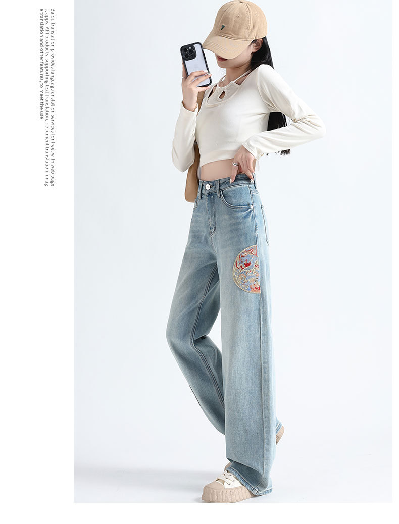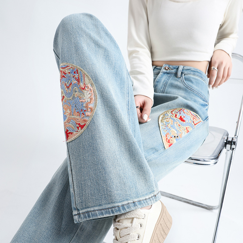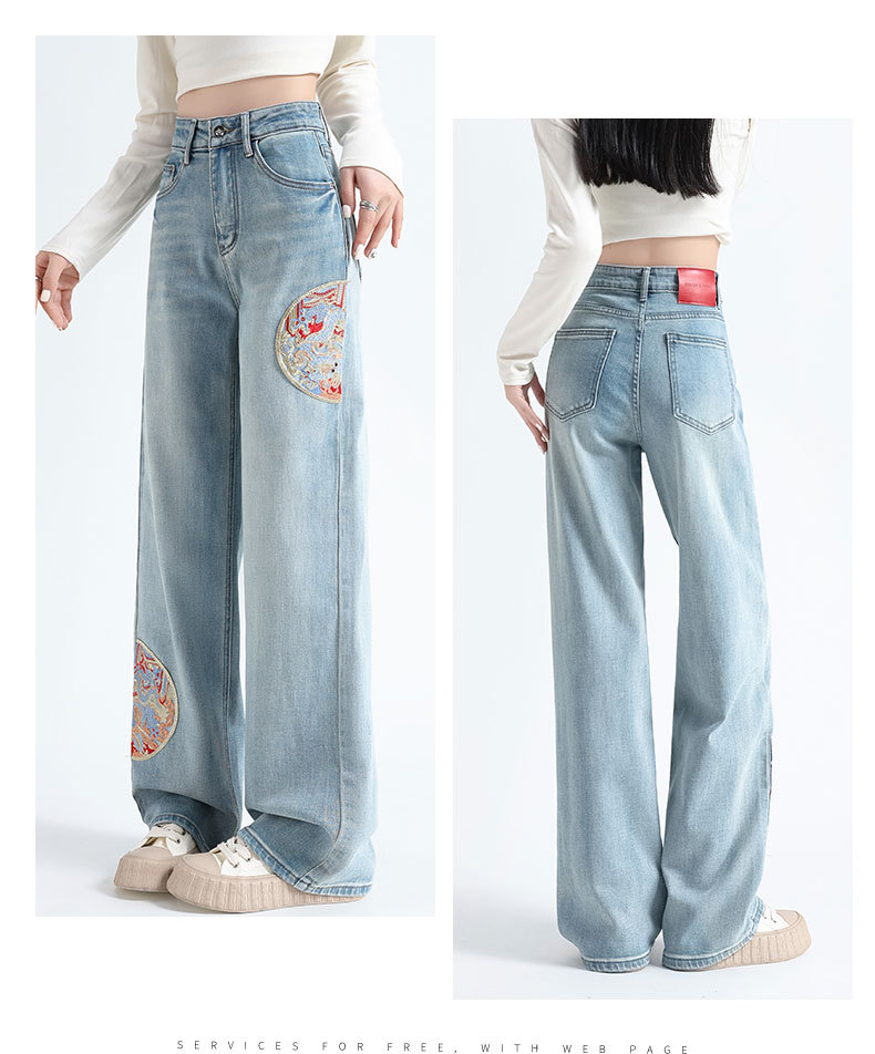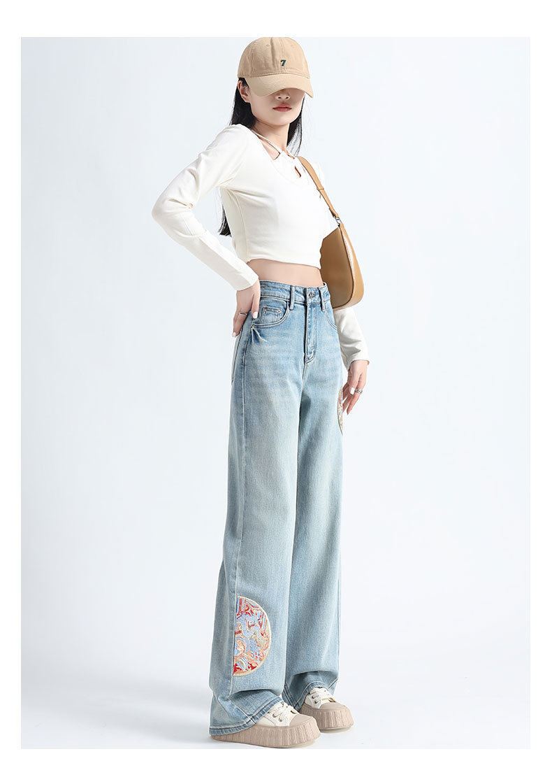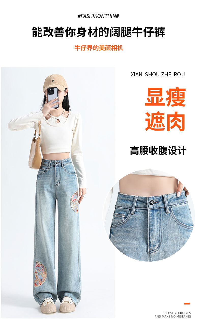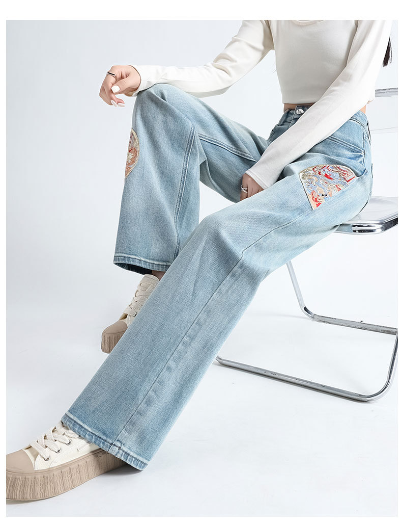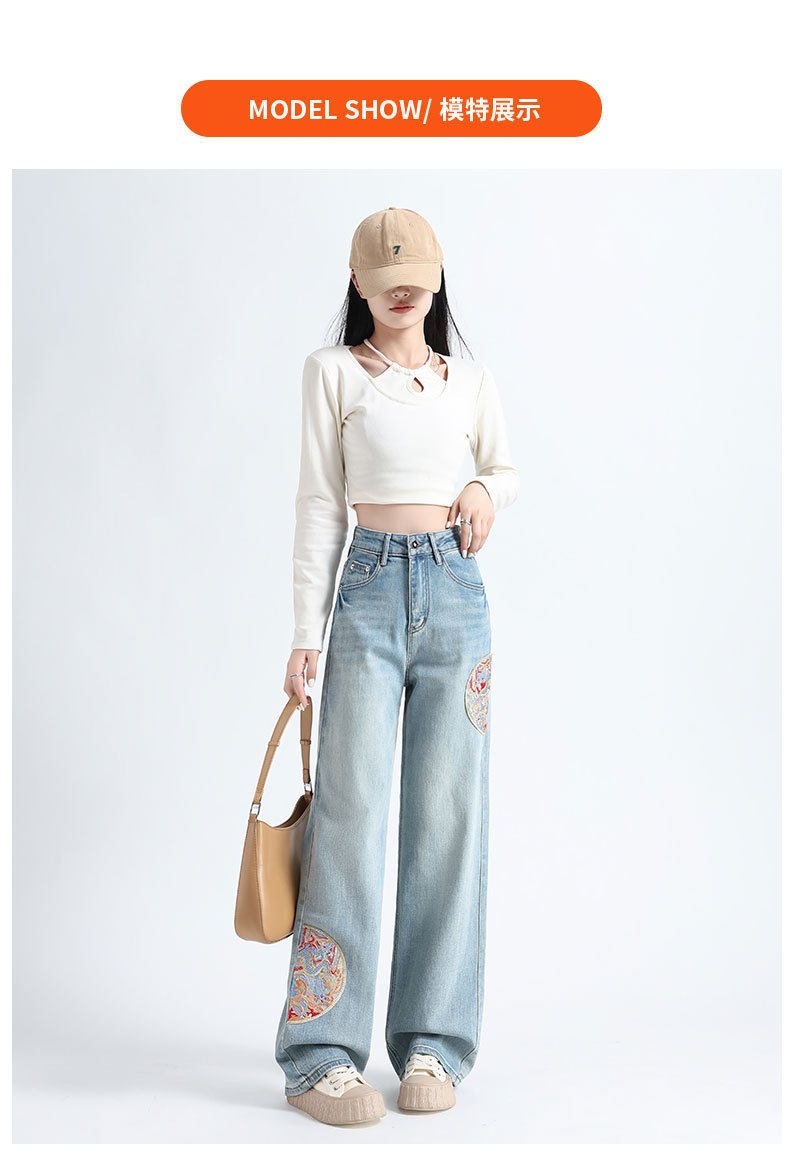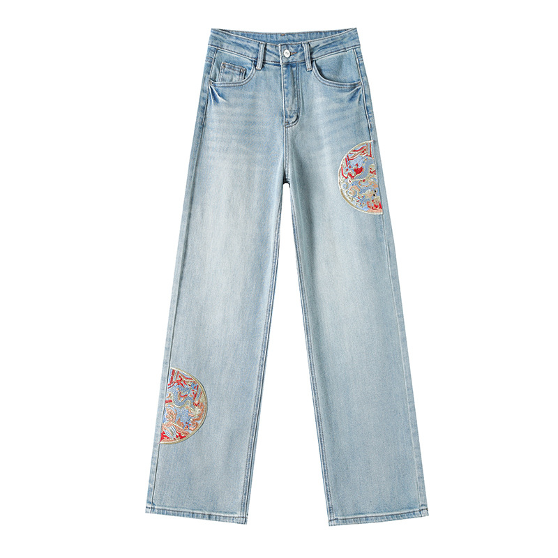 实拍国风直筒牛仔裤2024早春款高级品质刺绣设计感百搭宽松裤子潮