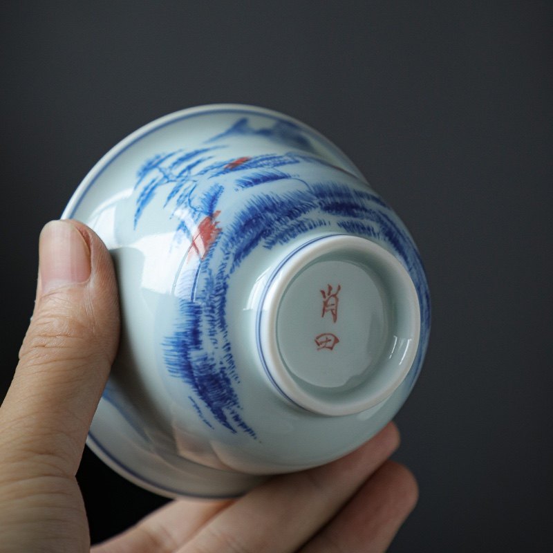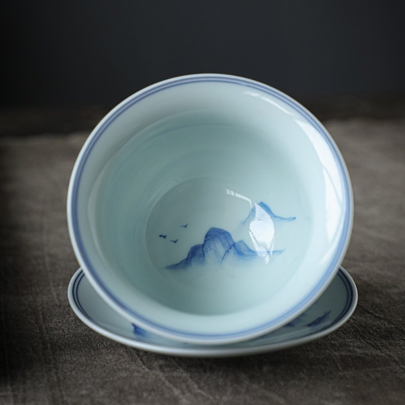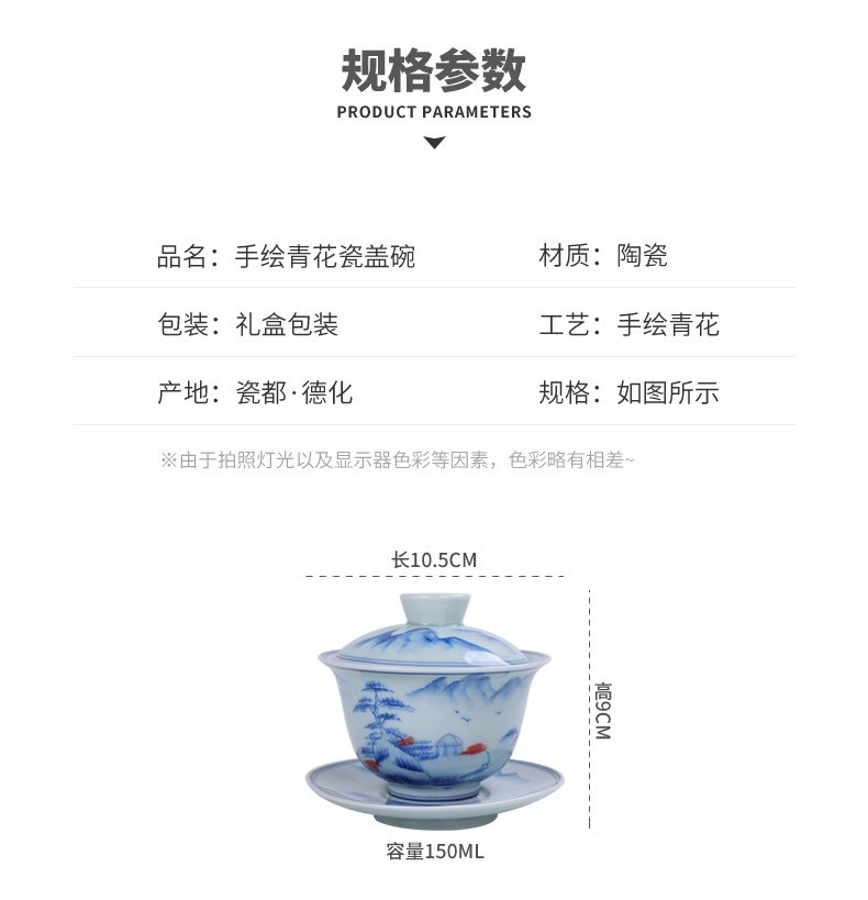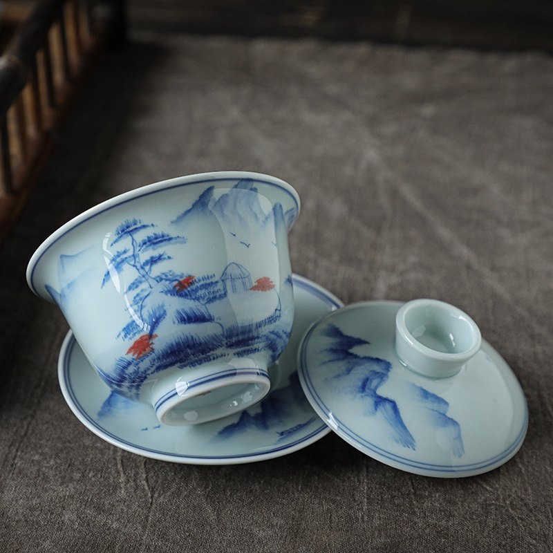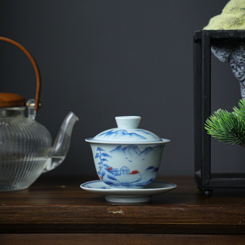 复古青花手绘釉下彩三才盖碗陶瓷大号家用泡茶碗单个茶杯功夫茶具