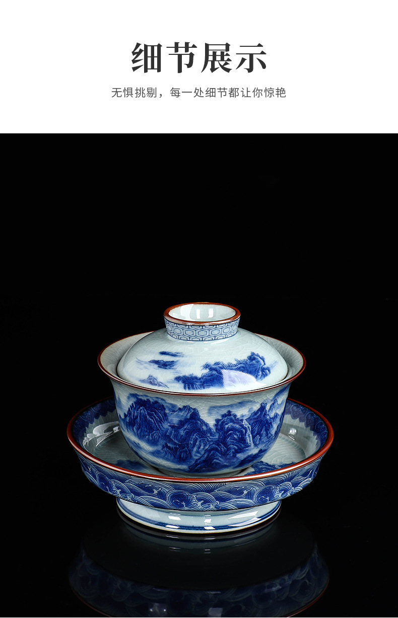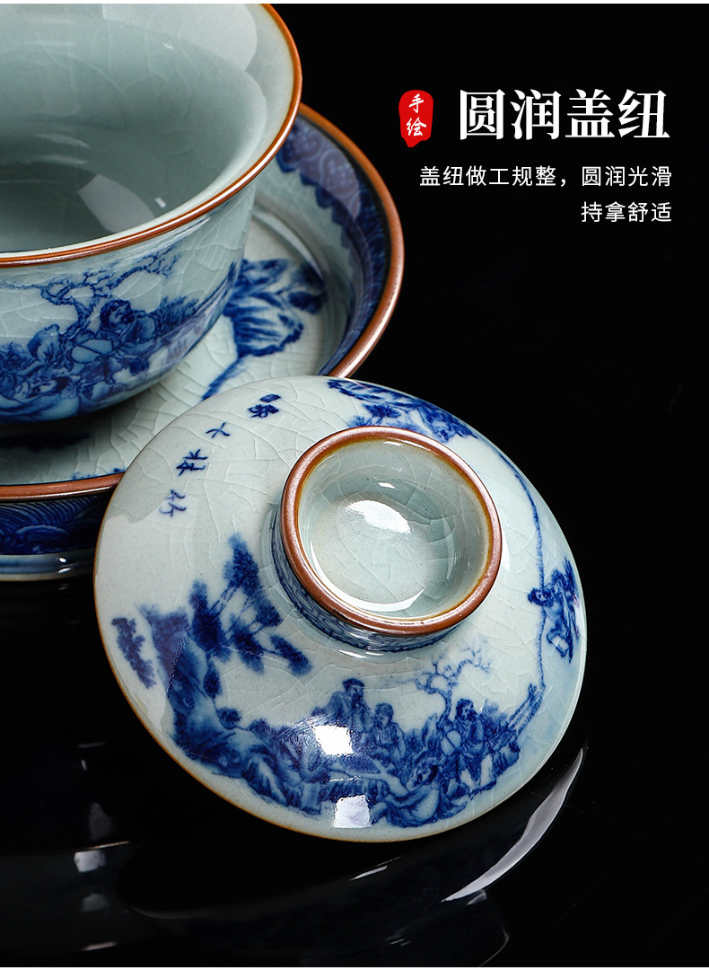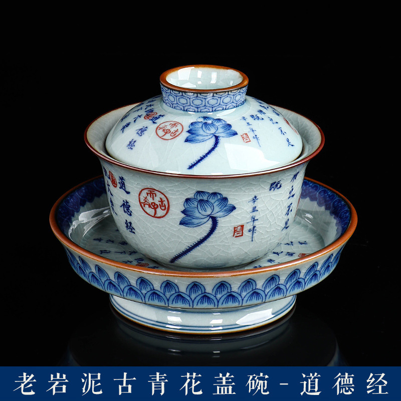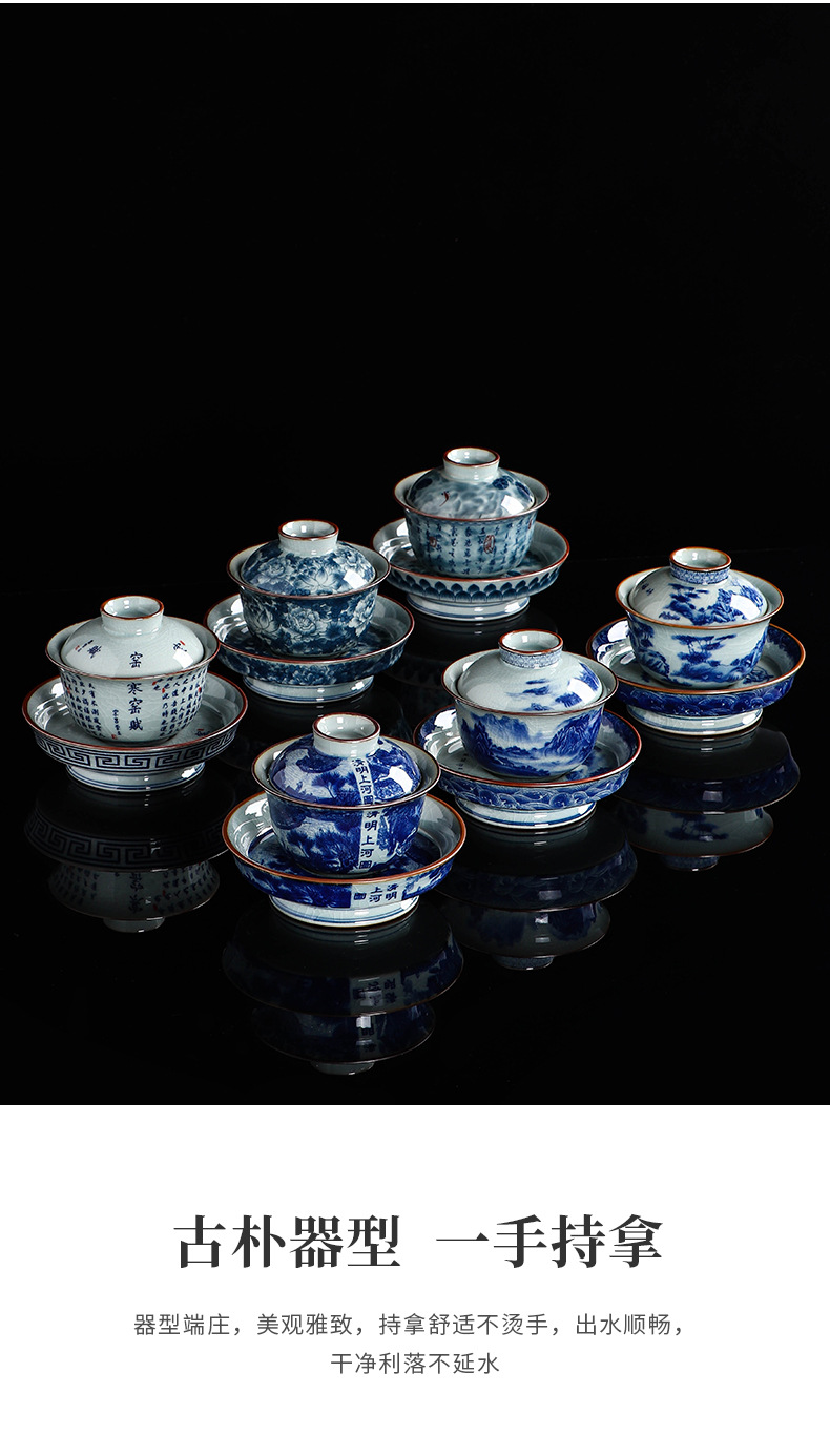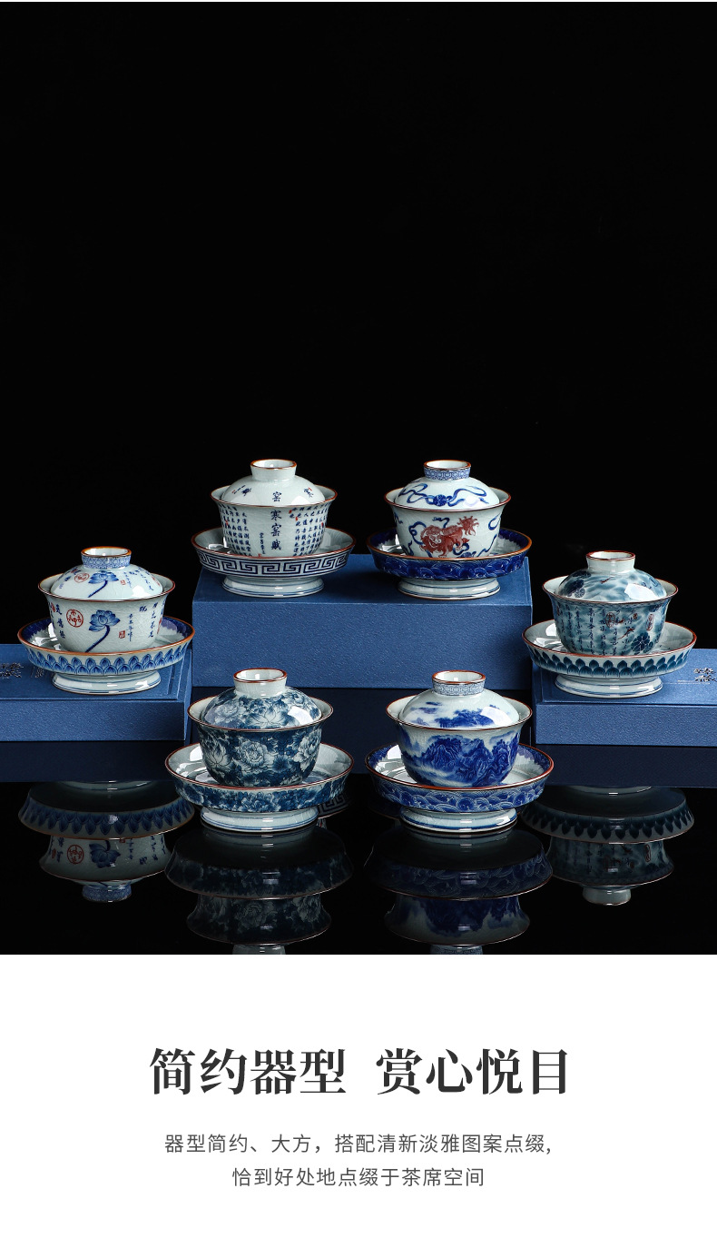 复古老陶泥青花三才盖碗简约陶瓷泡茶器茶备公司活动节庆礼品制定