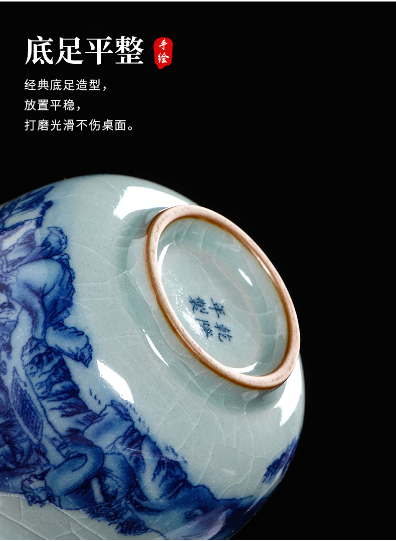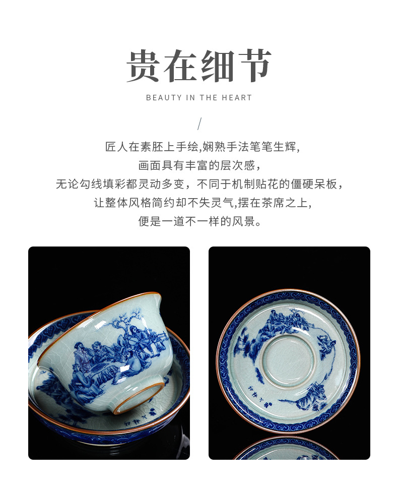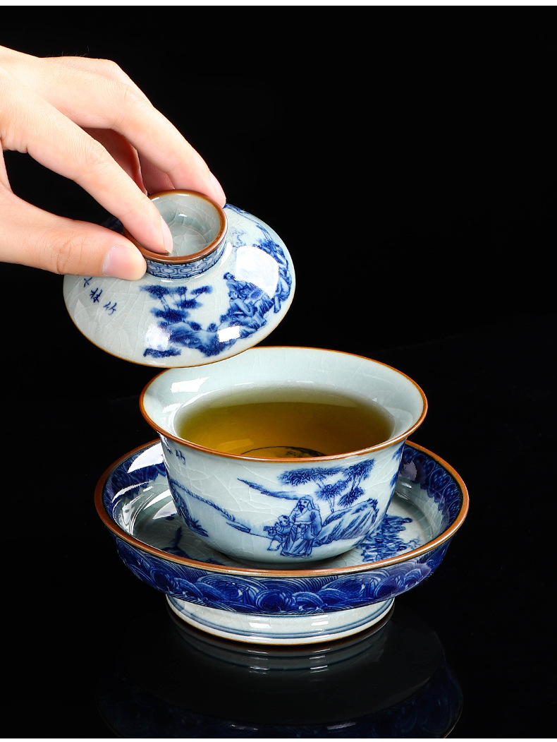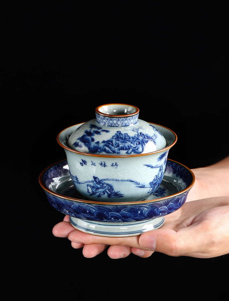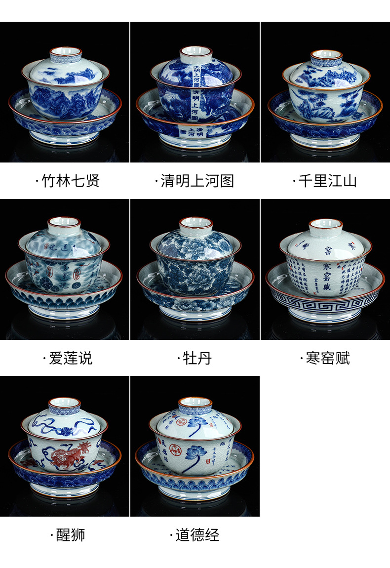 复古老陶泥青花三才盖碗简约陶瓷泡茶器茶备公司活动节庆礼品制定