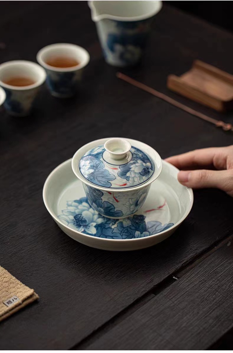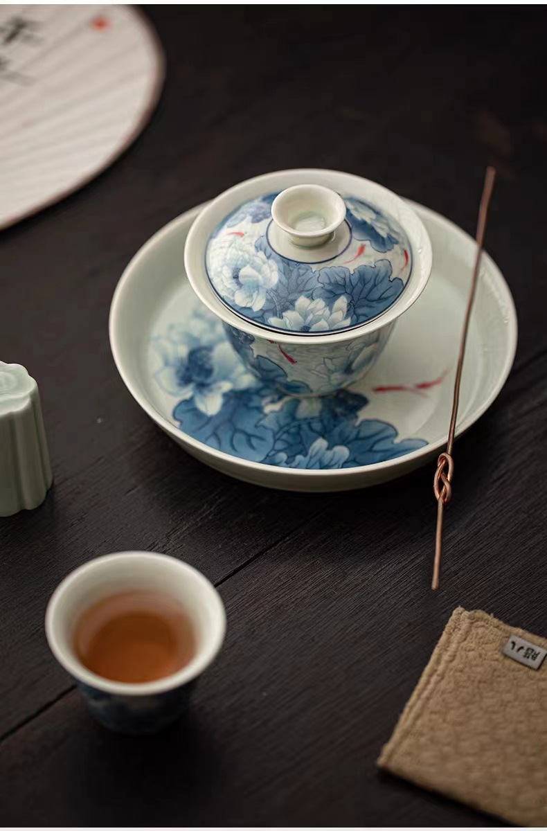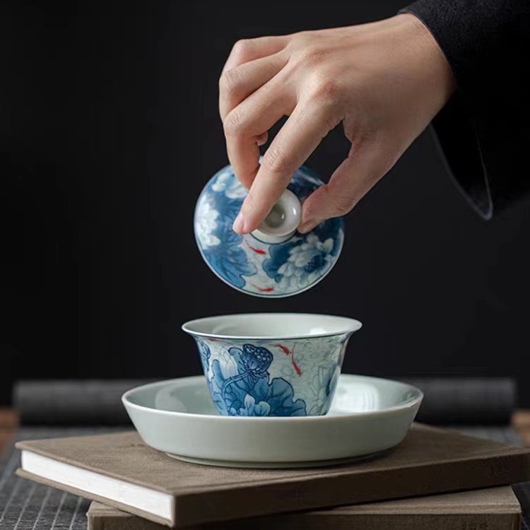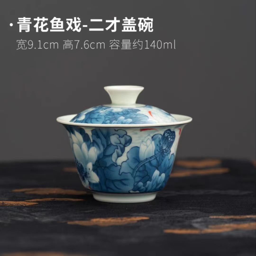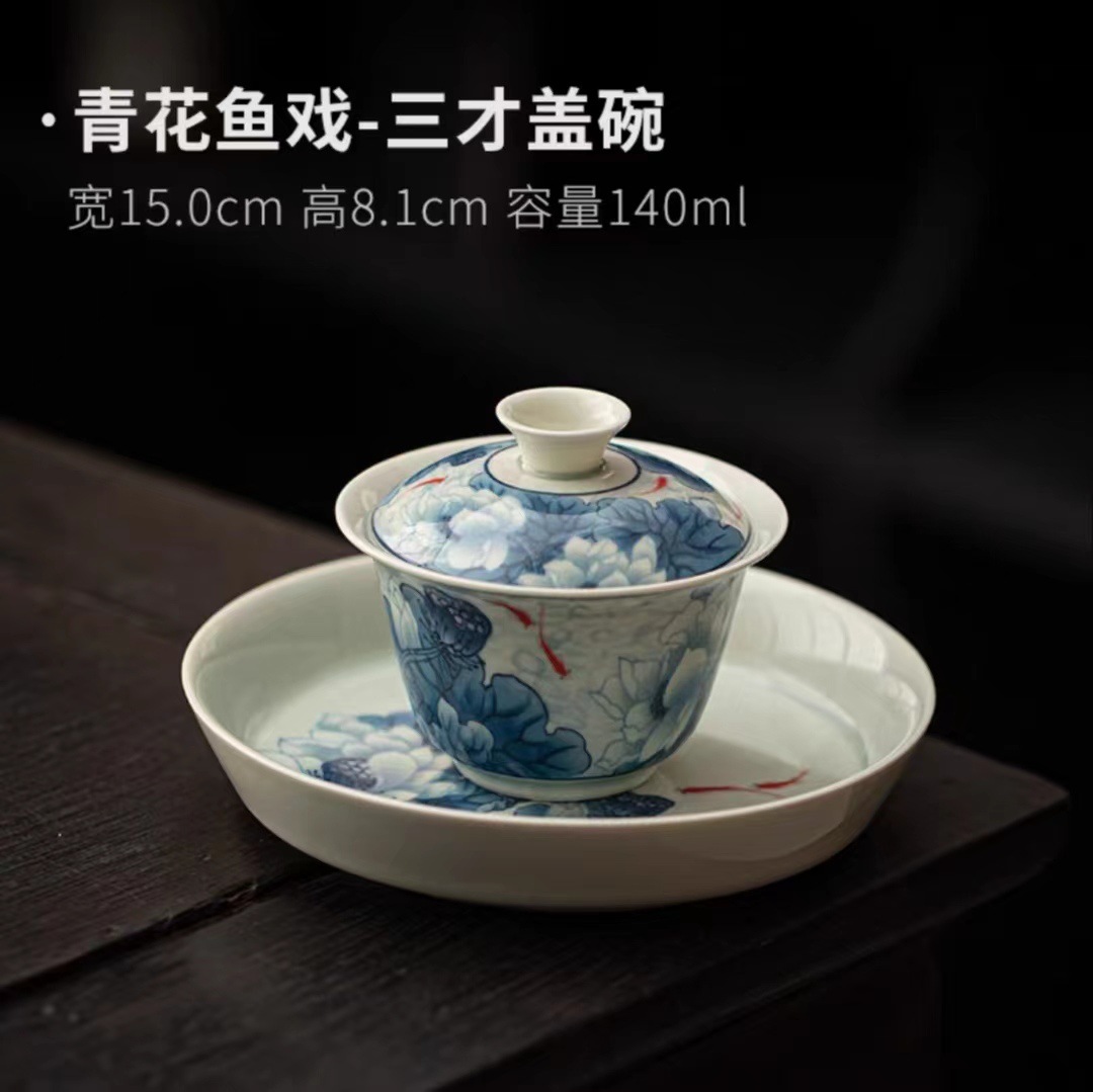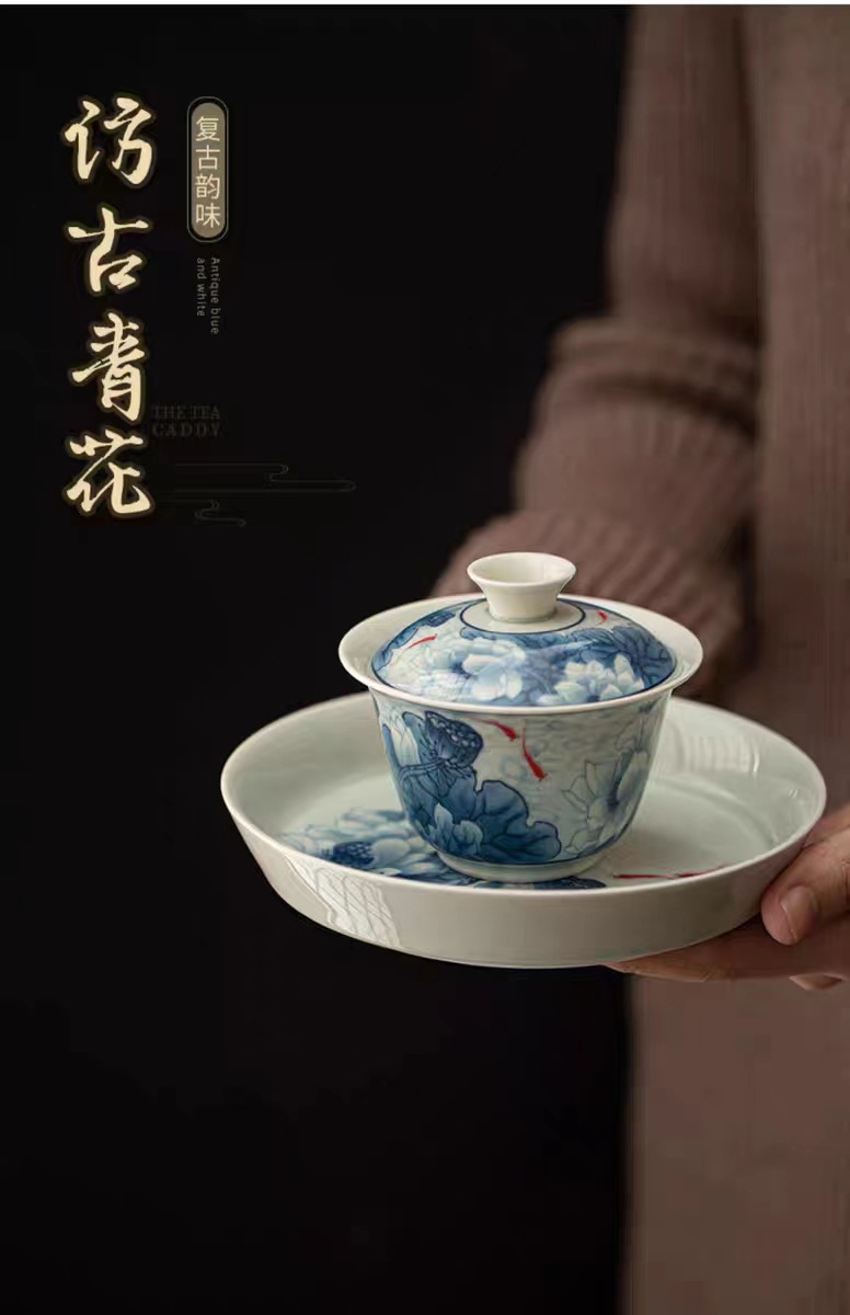 复古青花陶瓷三才盖碗釉下彩可悬停泡茶碗单个茶杯高档功夫茶具