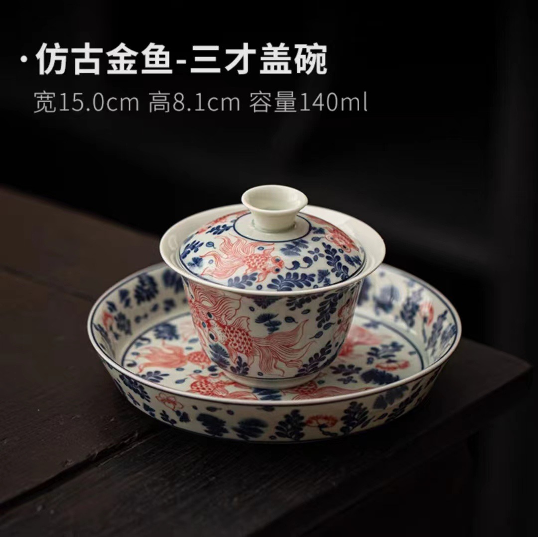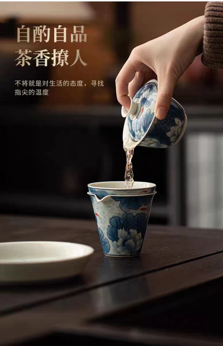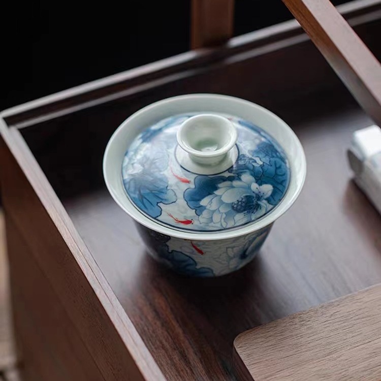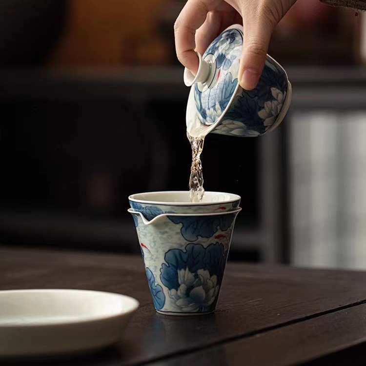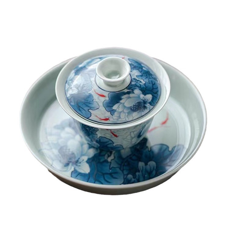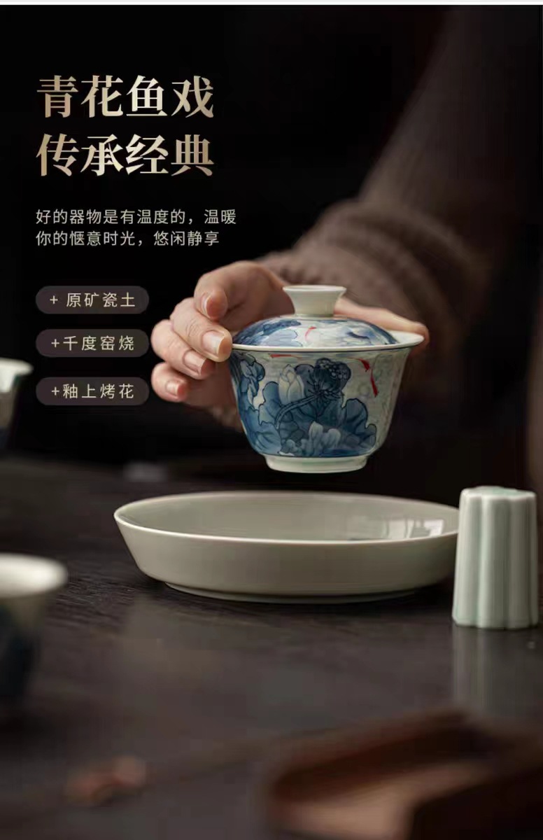 复古青花陶瓷三才盖碗釉下彩可悬停泡茶碗单个茶杯高档功夫茶具