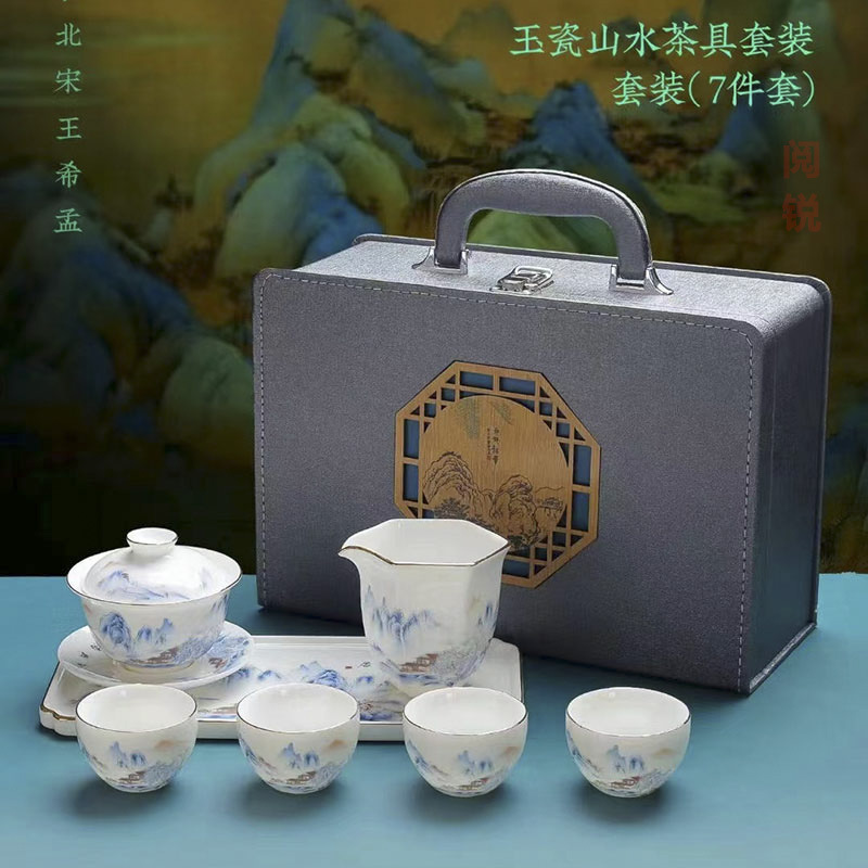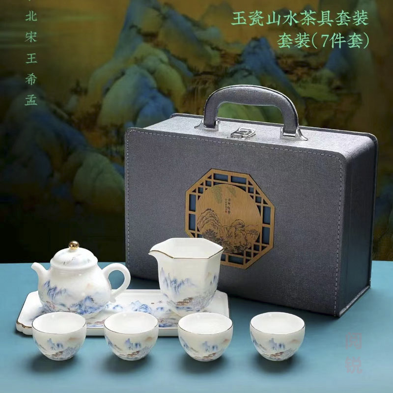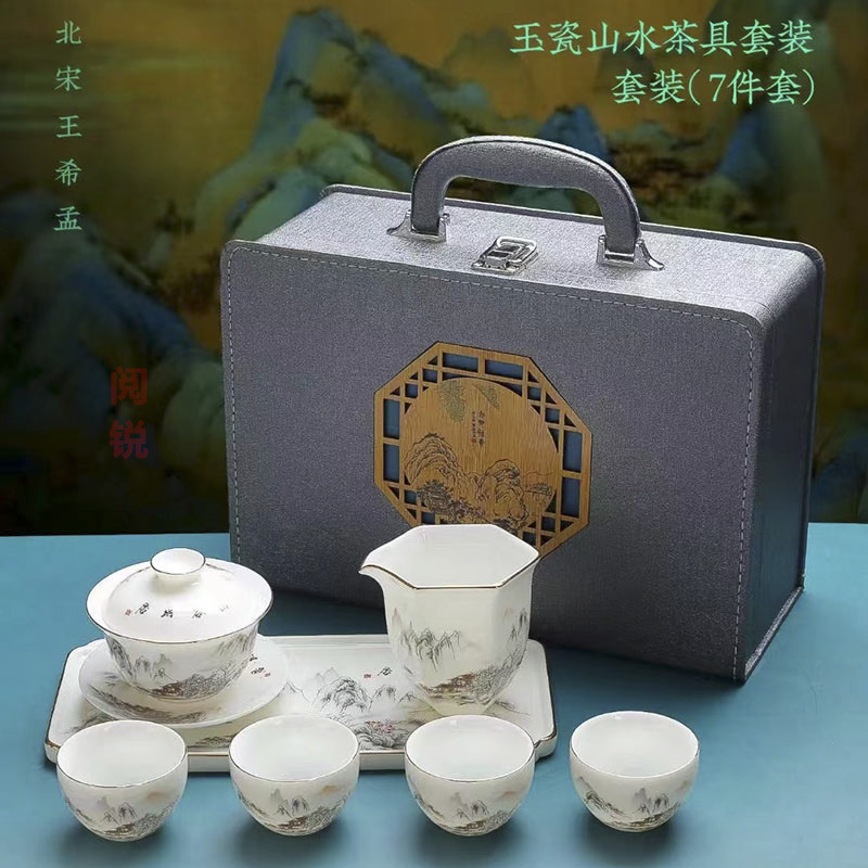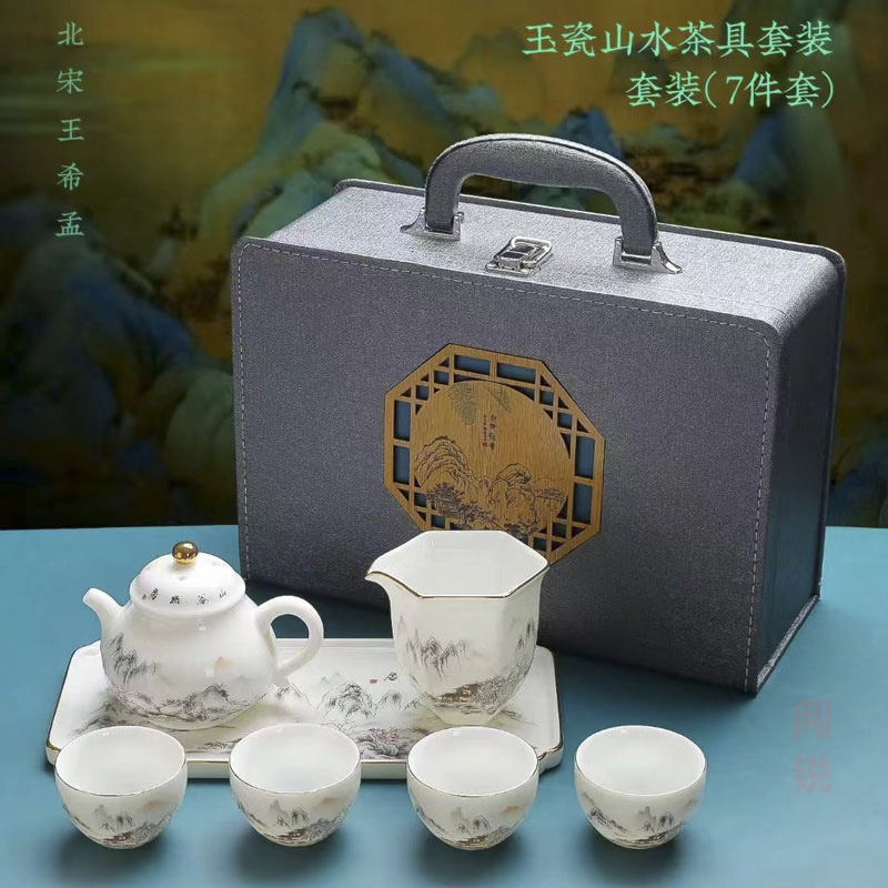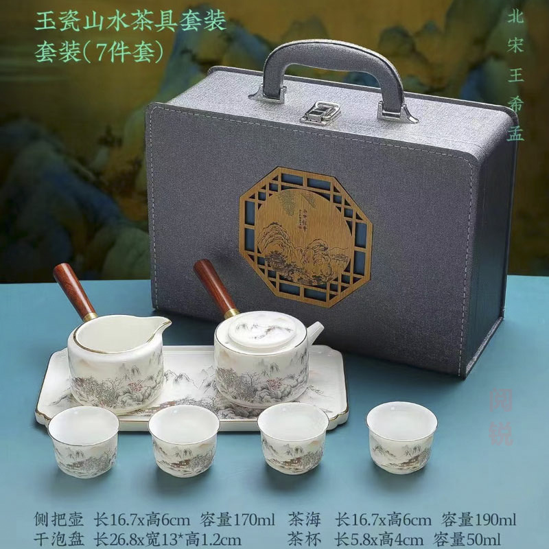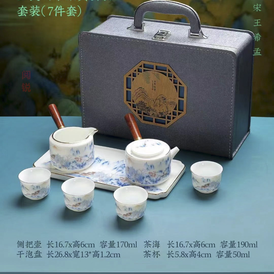轻奢高档羊脂玉旅行茶具套装家用描金木柄侧把壶防烫陶瓷托盘套装