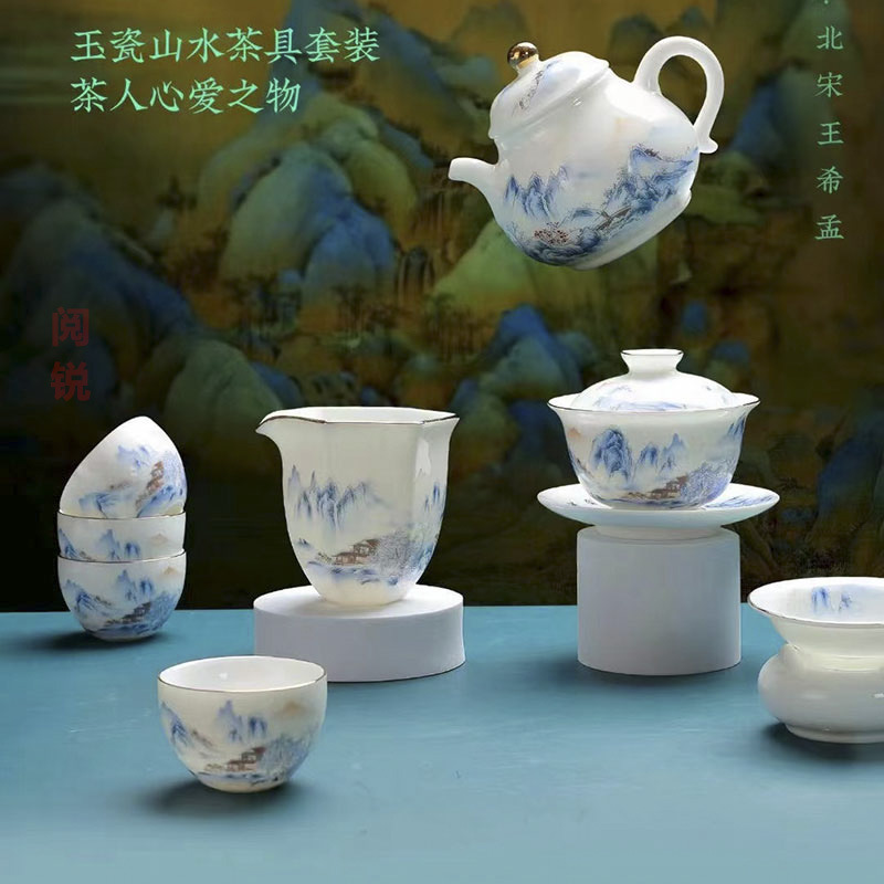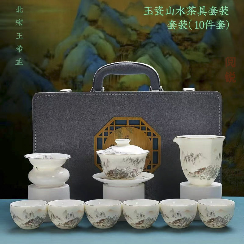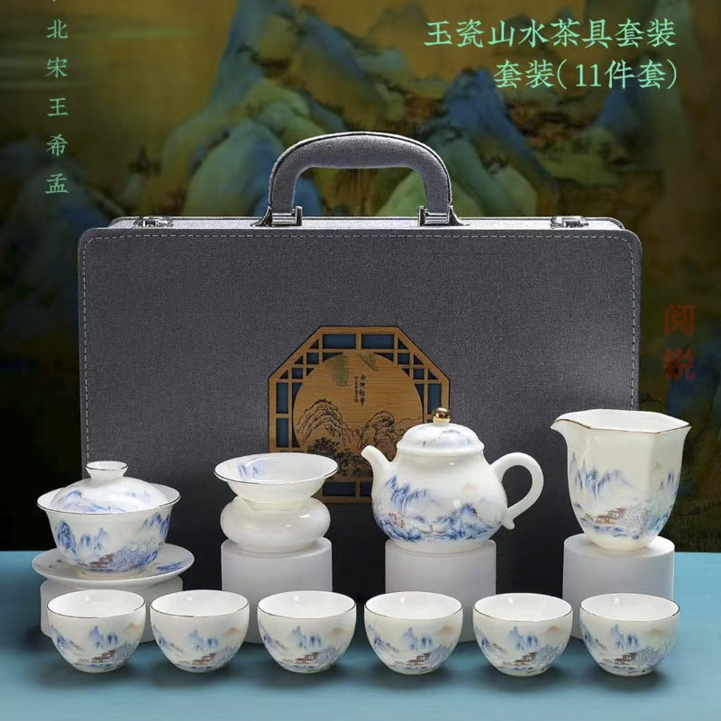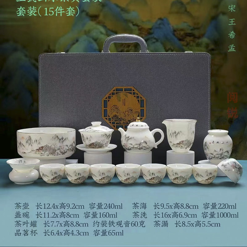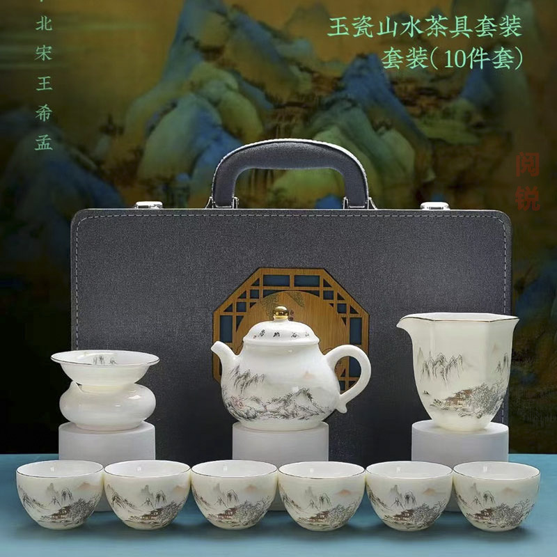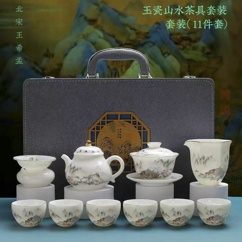轻奢高档羊脂玉旅行茶具套装家用描金木柄侧把壶防烫陶瓷托盘套装