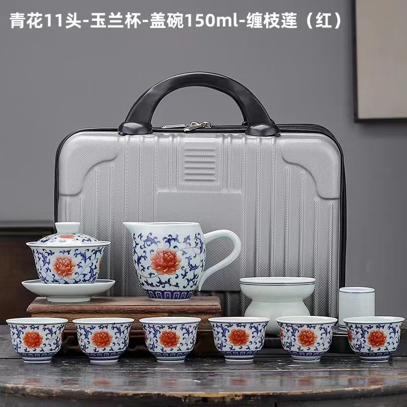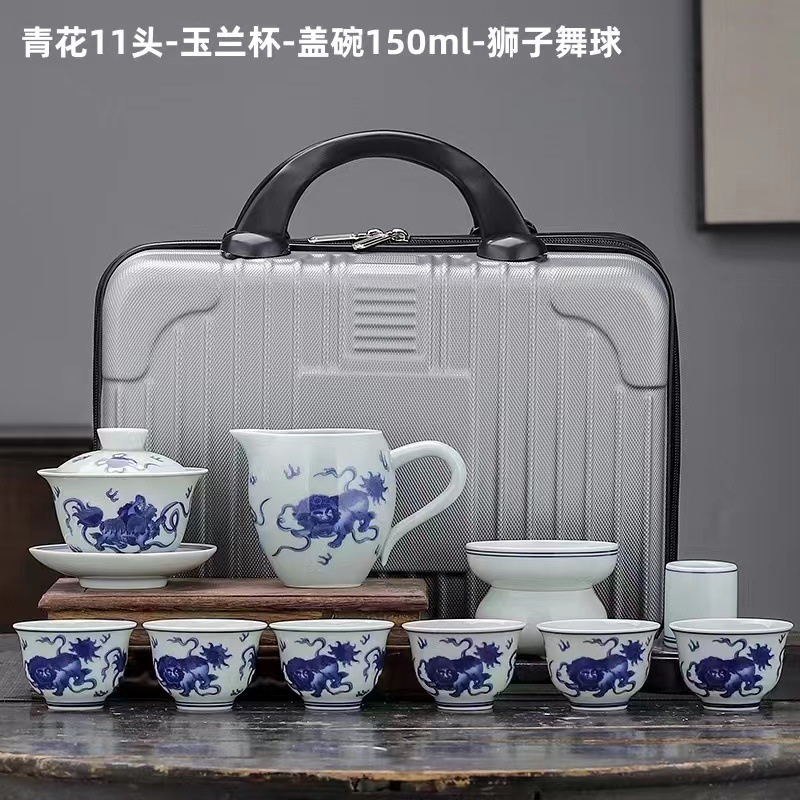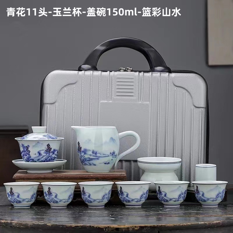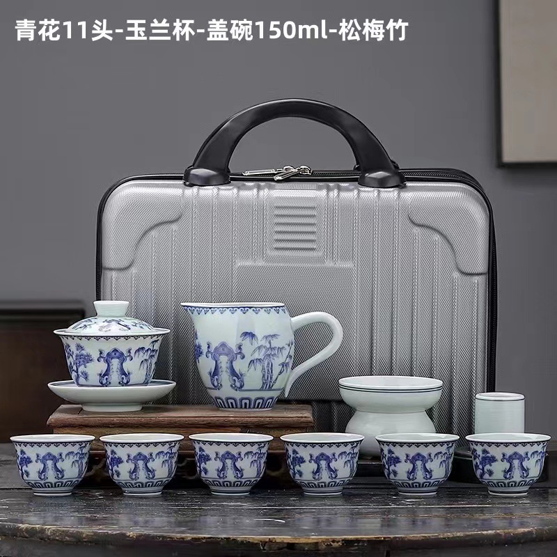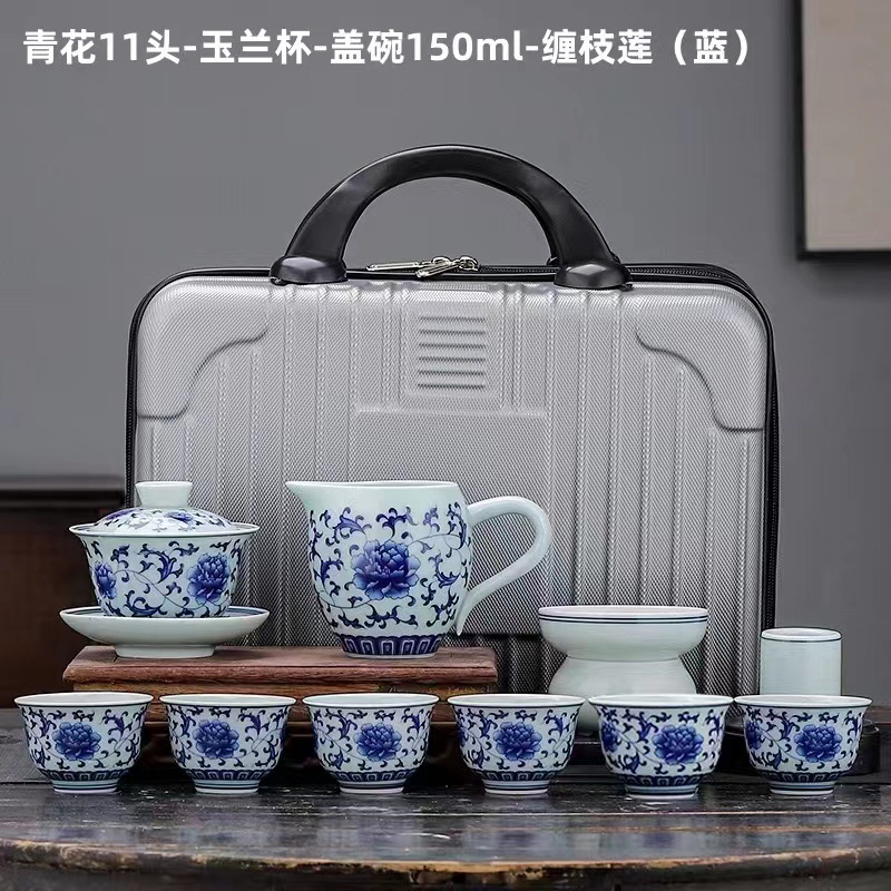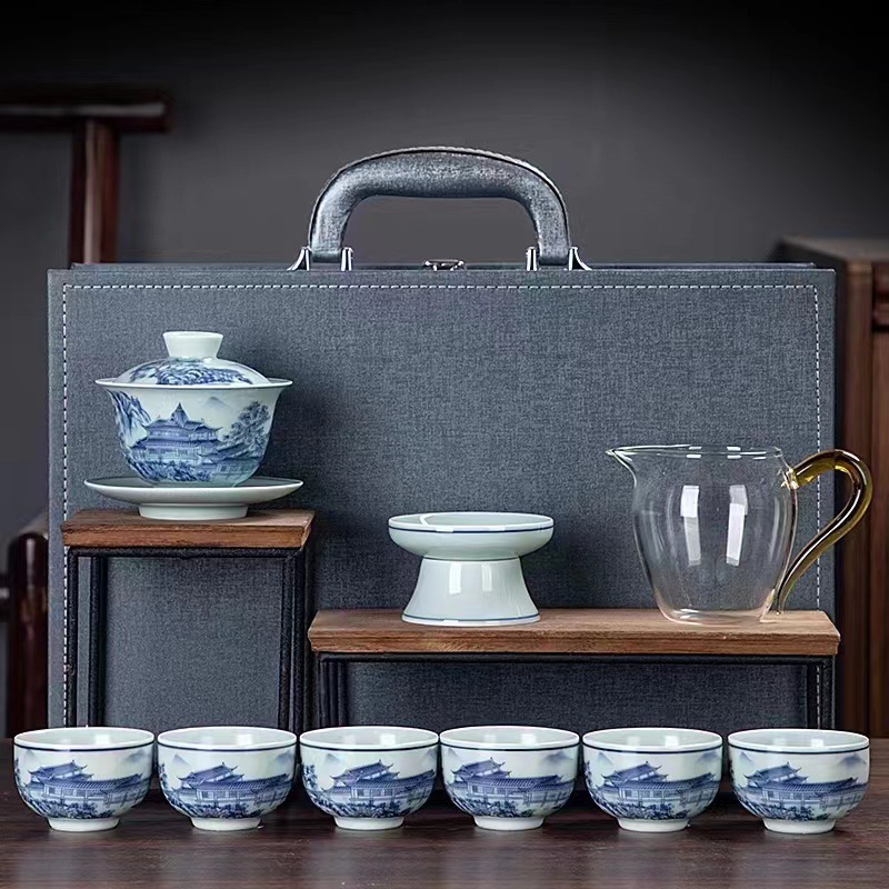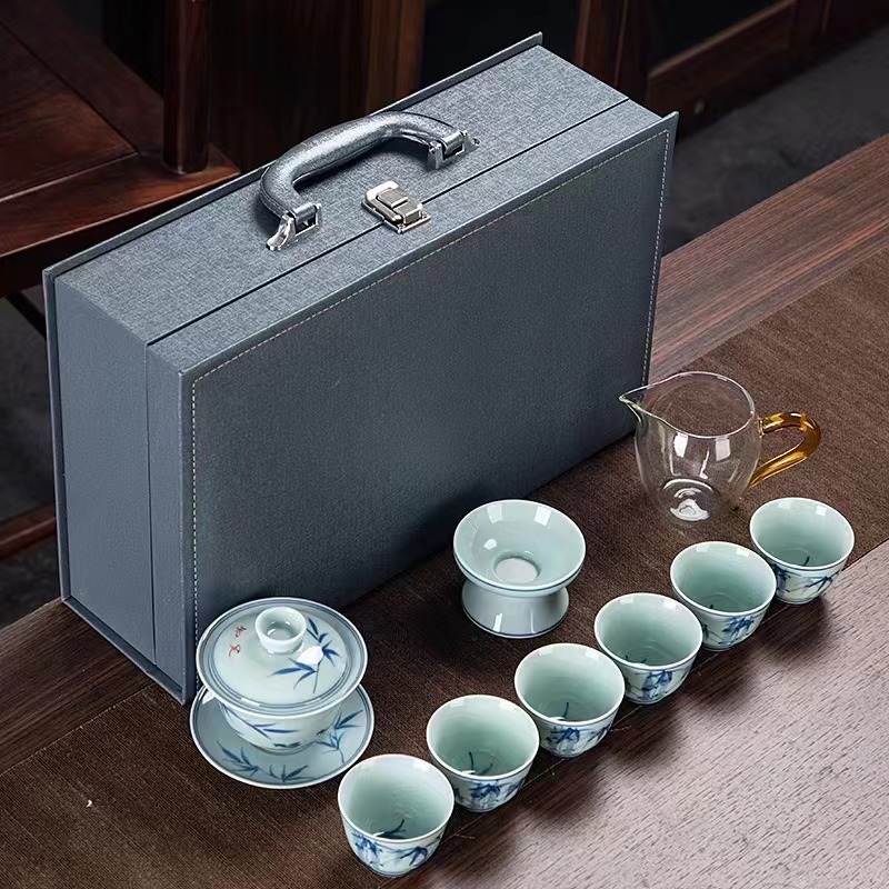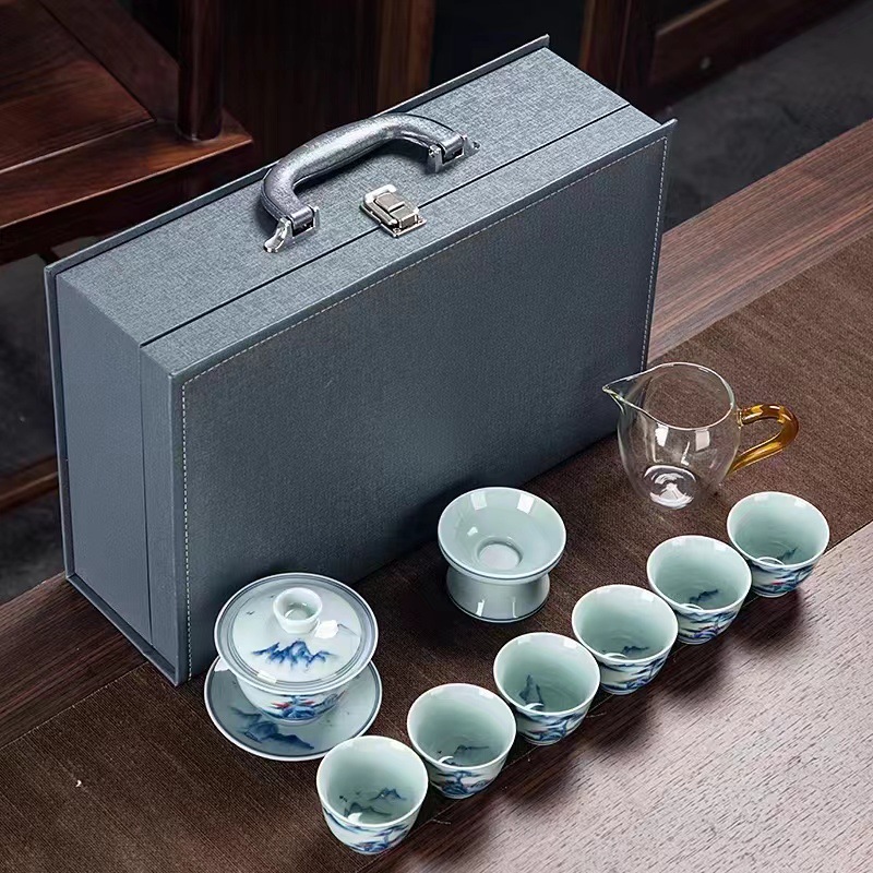 复古青花手提皮包便携旅行茶具套装家用高端茶礼公司活动商务礼品
