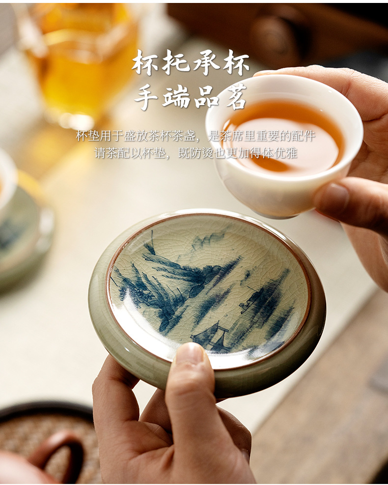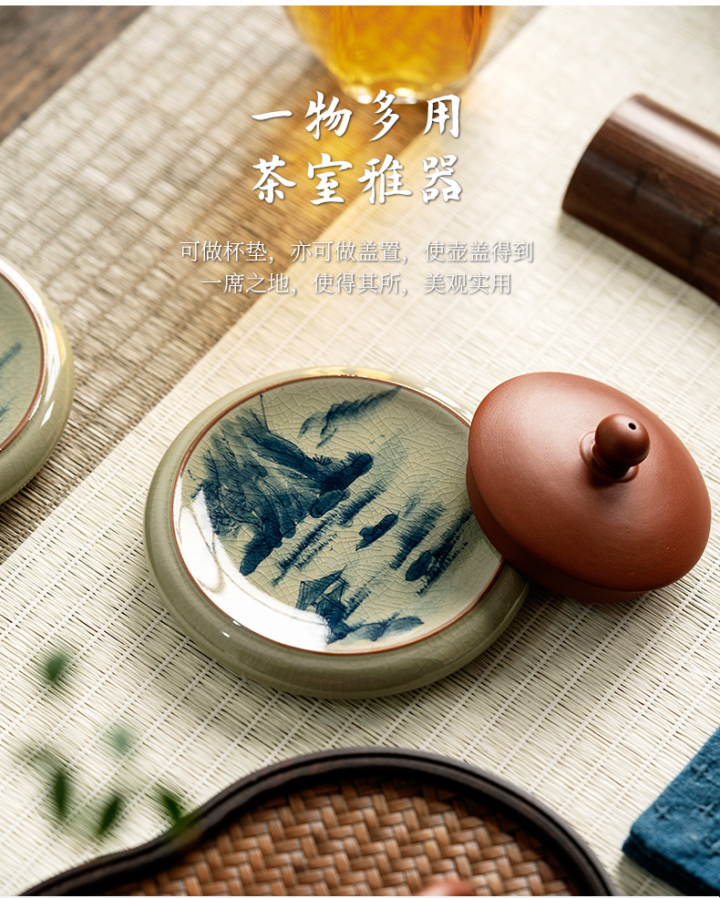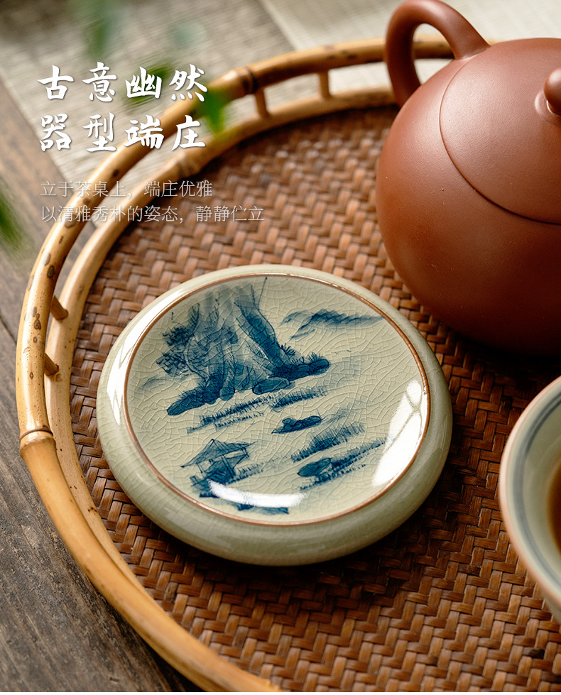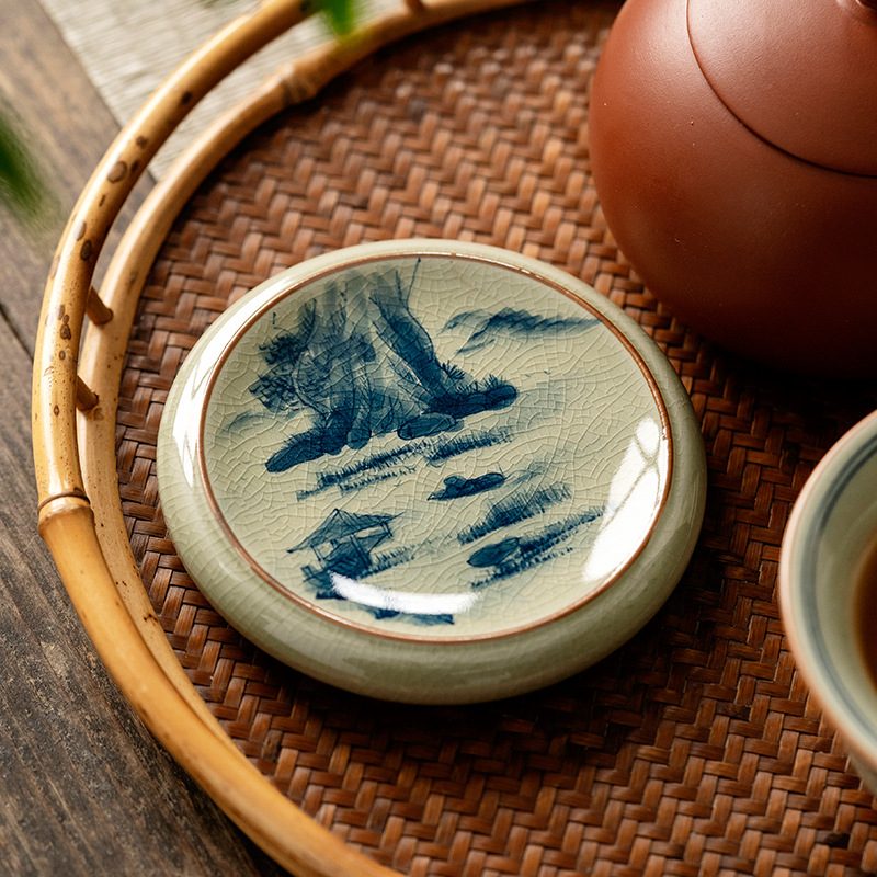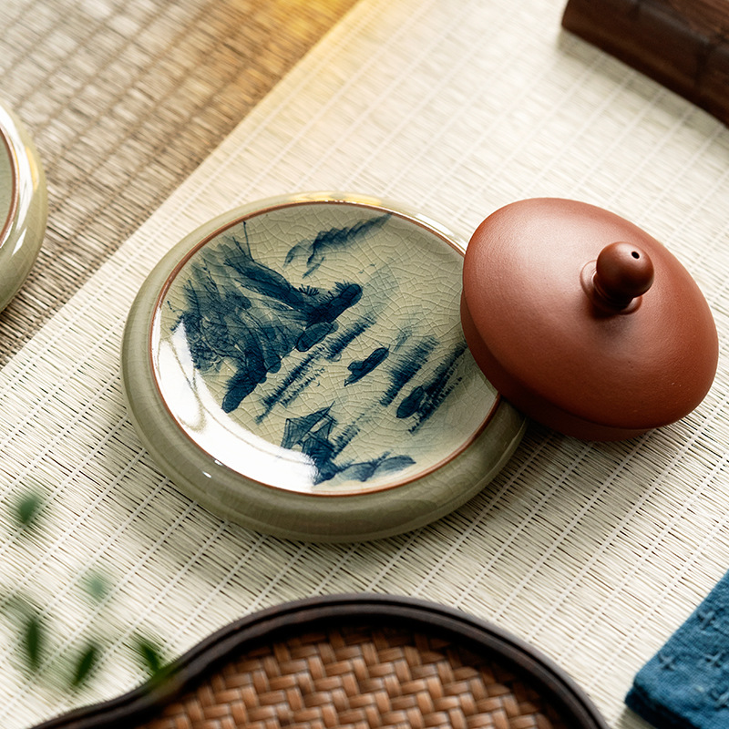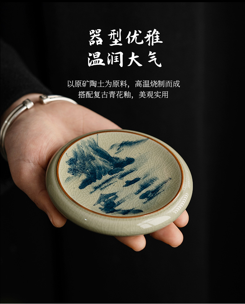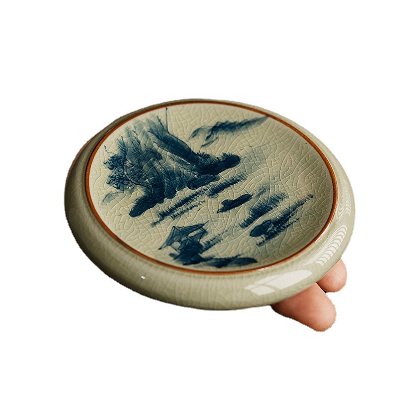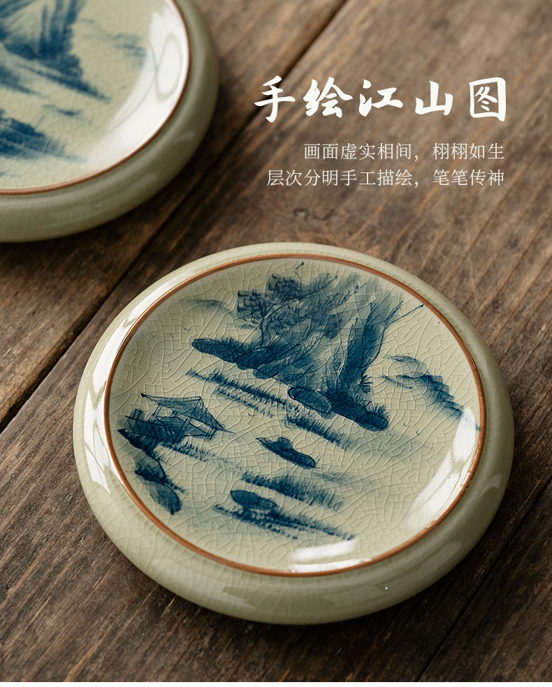 手绘复古老陶泥青花山水杯垫陶瓷功夫茶道配件禅意盖置家用茶杯托