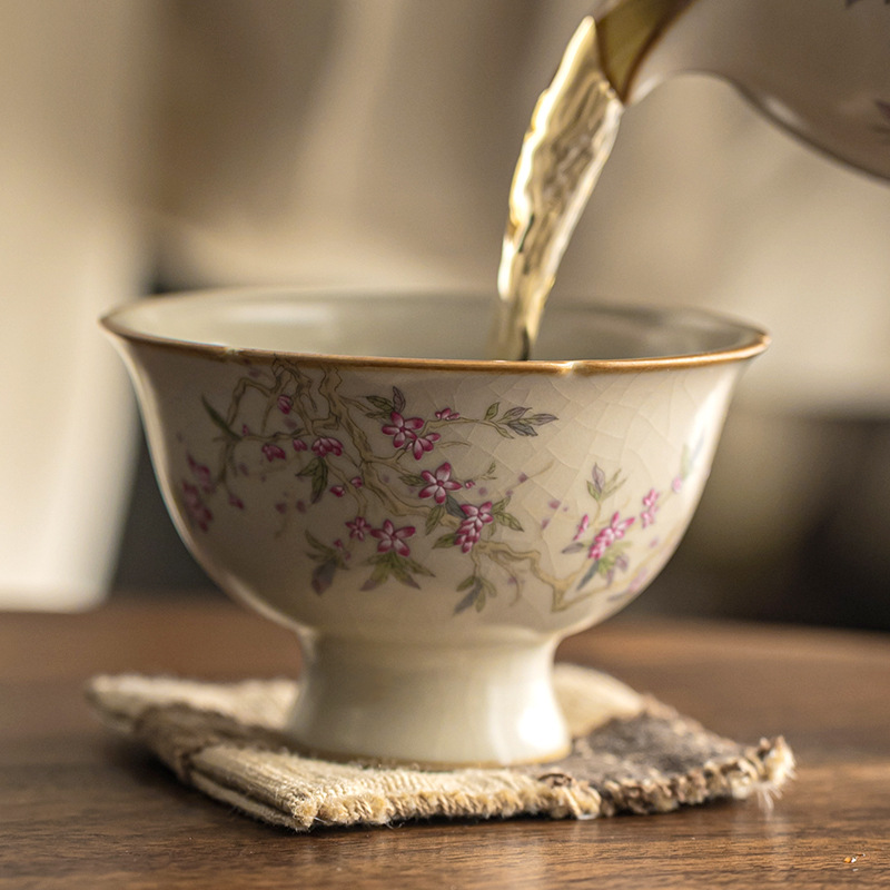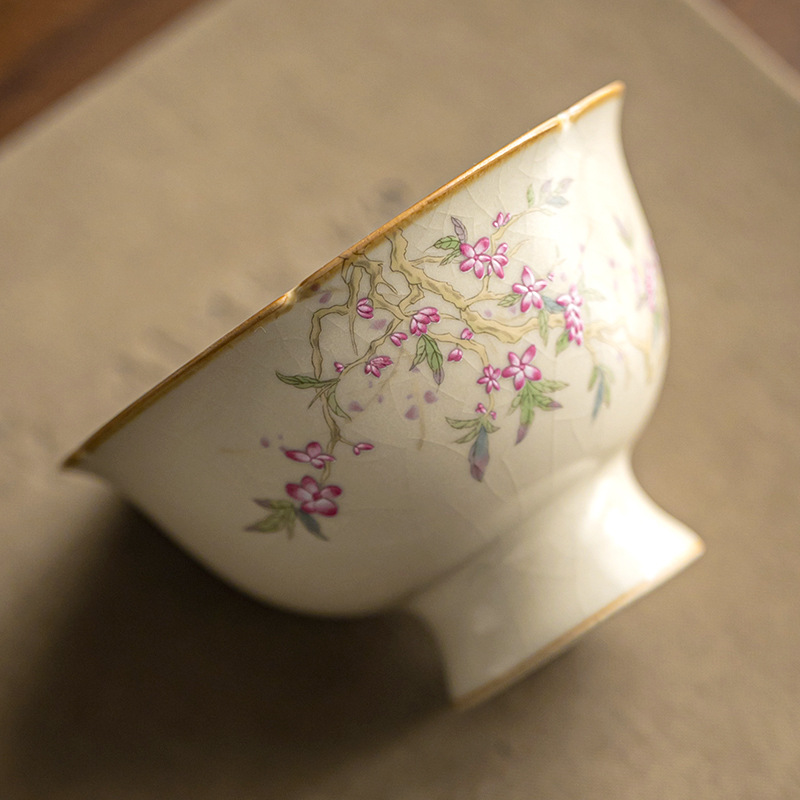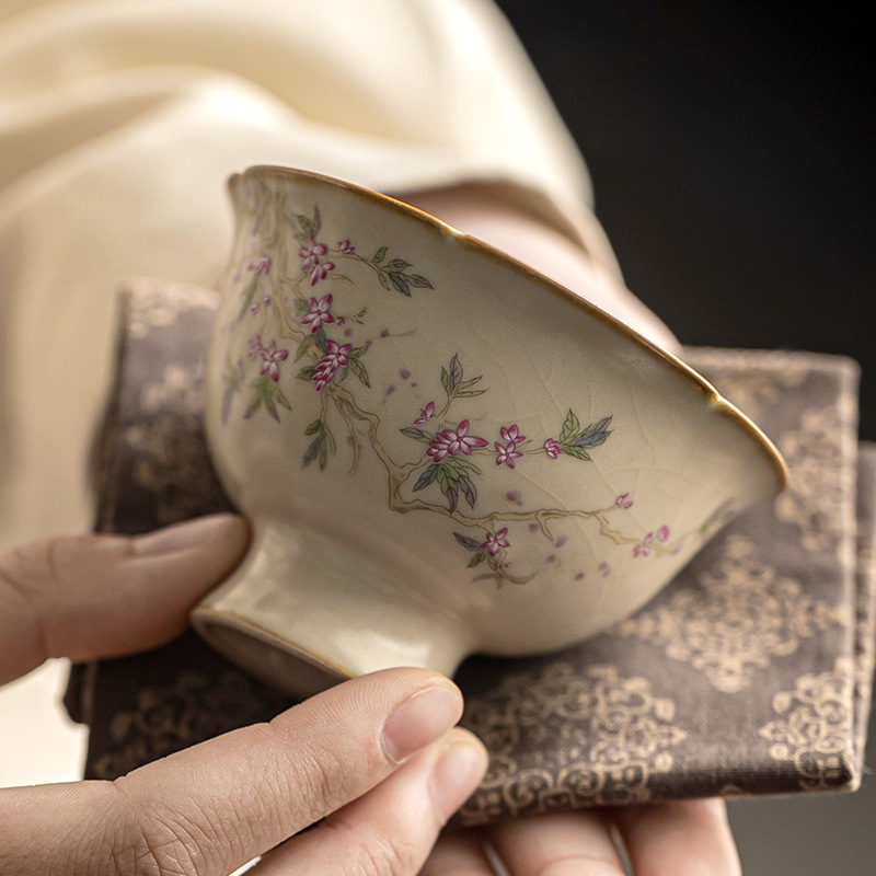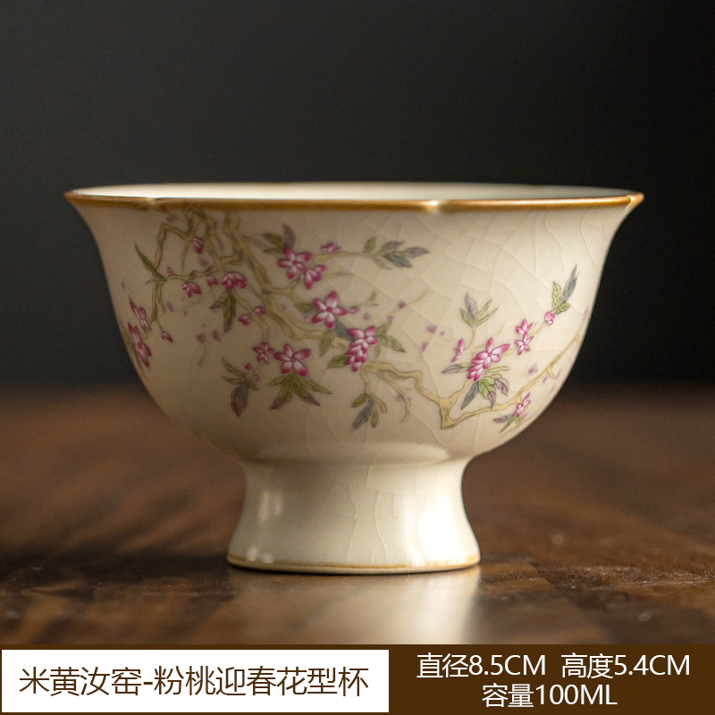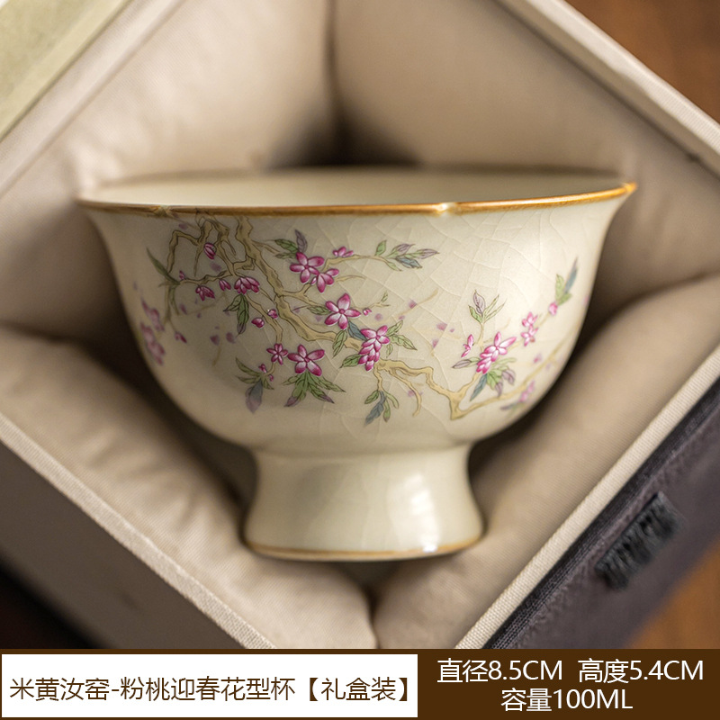 复古米黄汝窑粉桃花型主人杯开片可养家用功夫茶具礼盒品茗杯茶杯