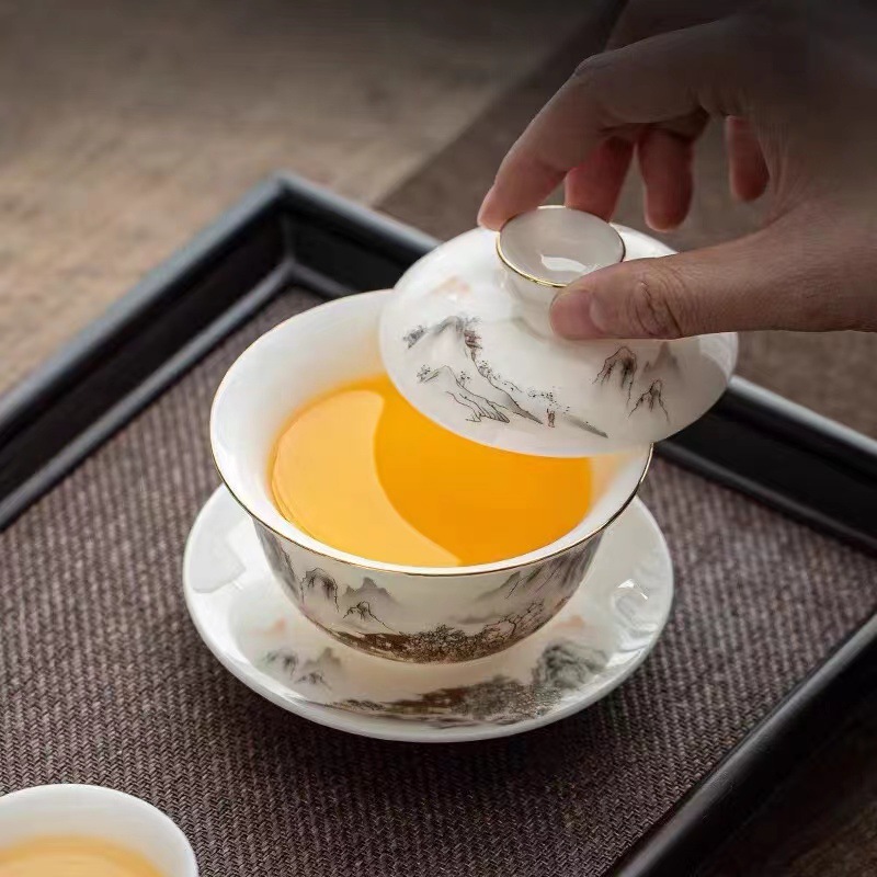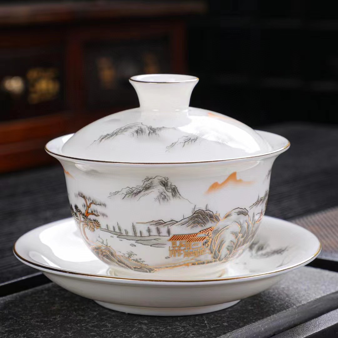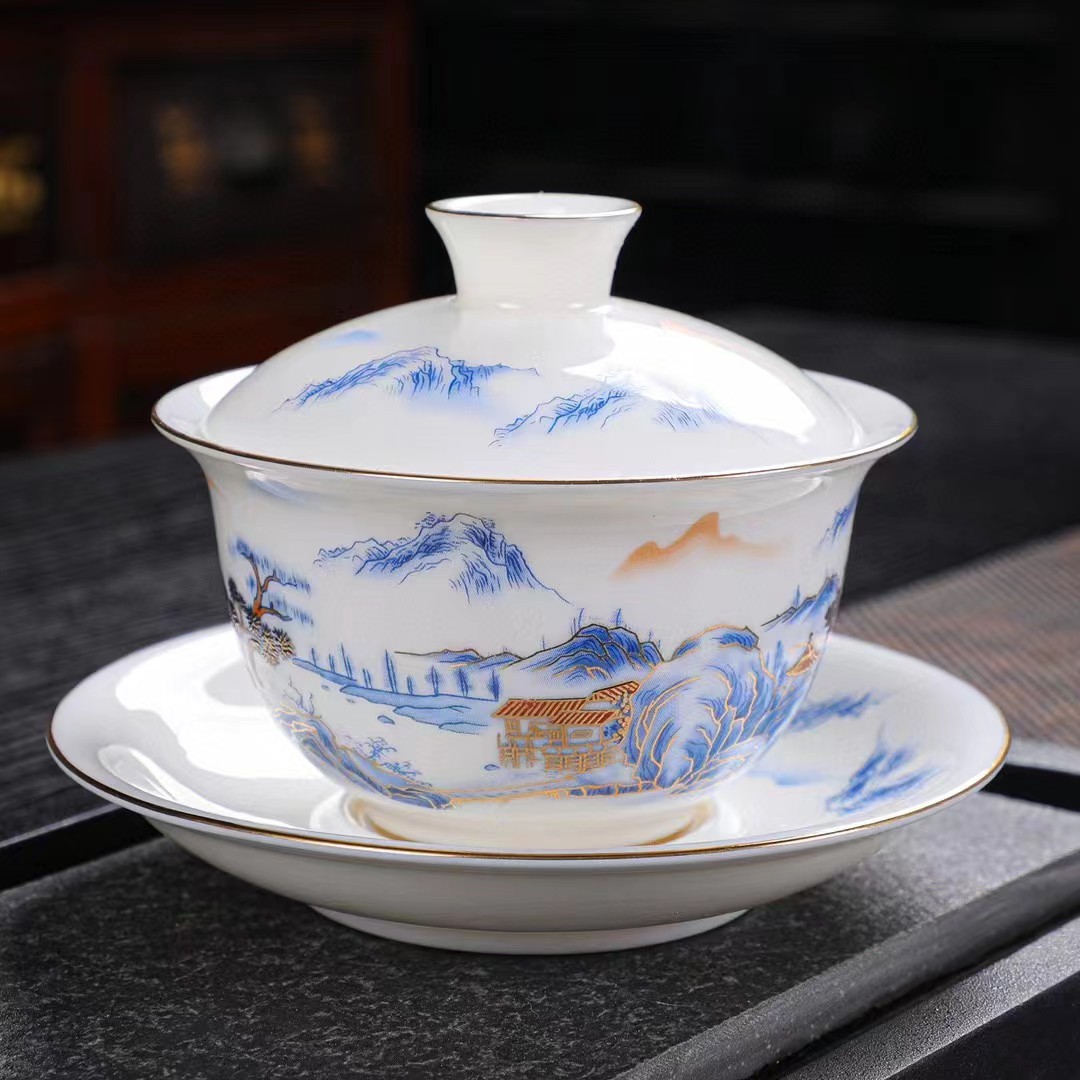 高档轻奢羊脂玉三才盖碗家用陶瓷功夫茶碗单个大号泡茶器茶杯茶具
