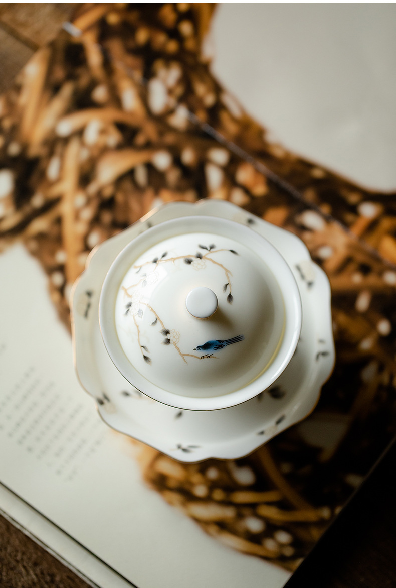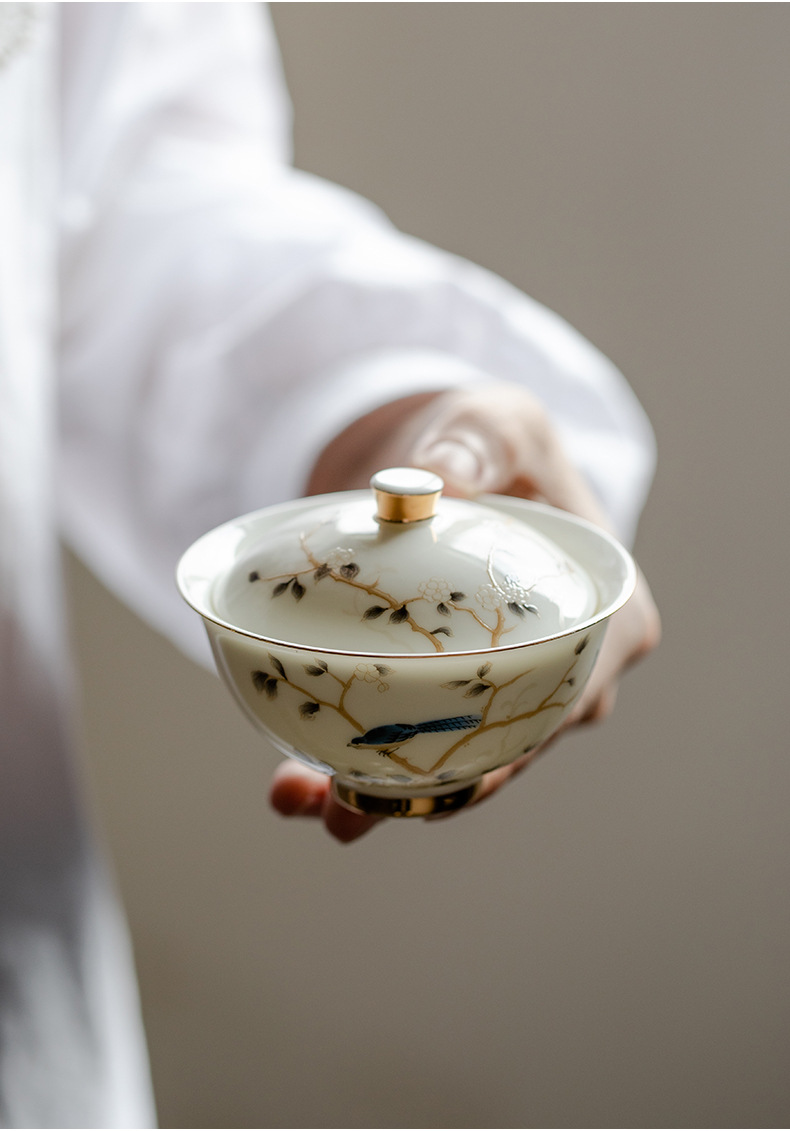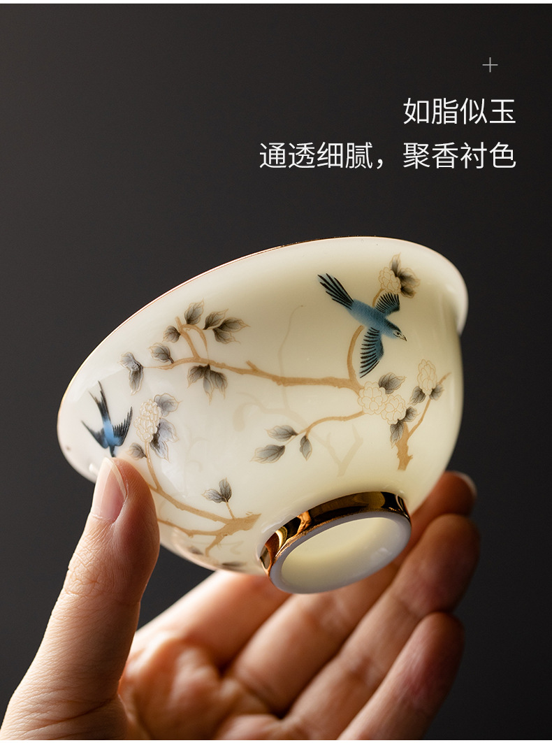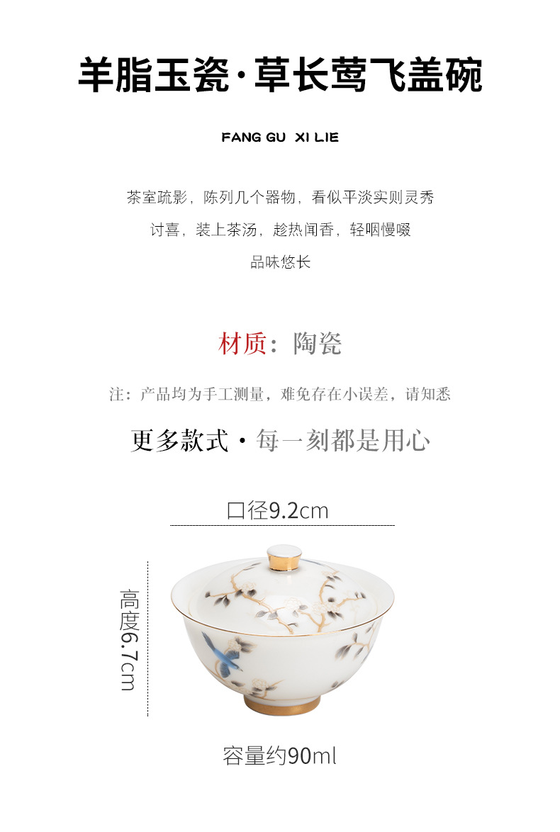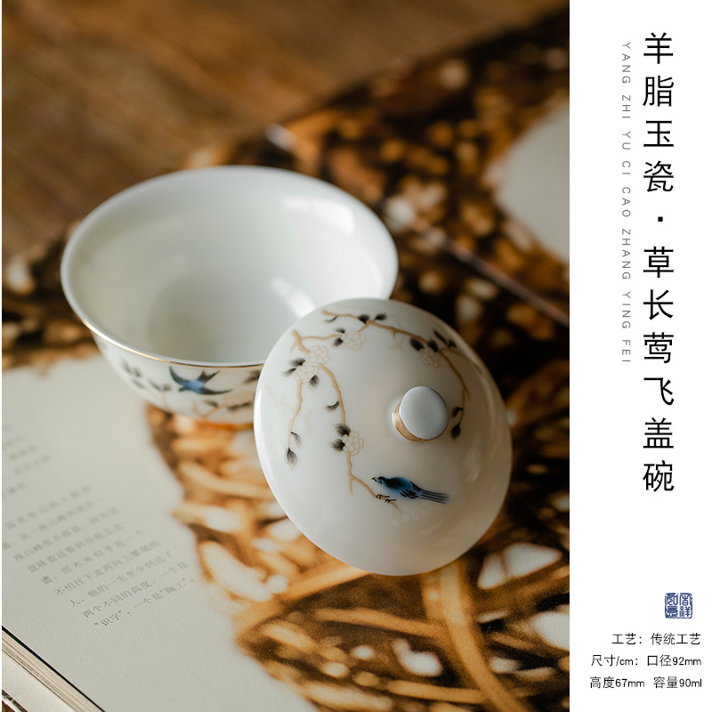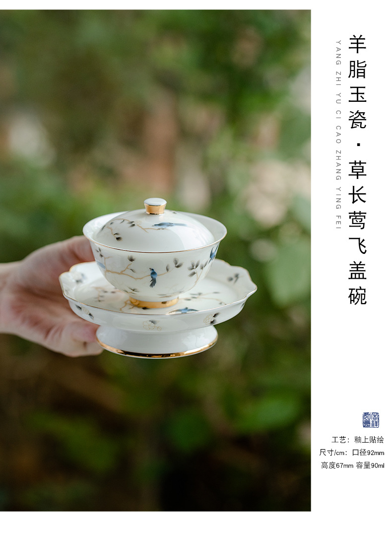 轻奢简约高档羊脂玉茶具二才盖碗壶承陶瓷功夫茶具单个泡茶碗家用