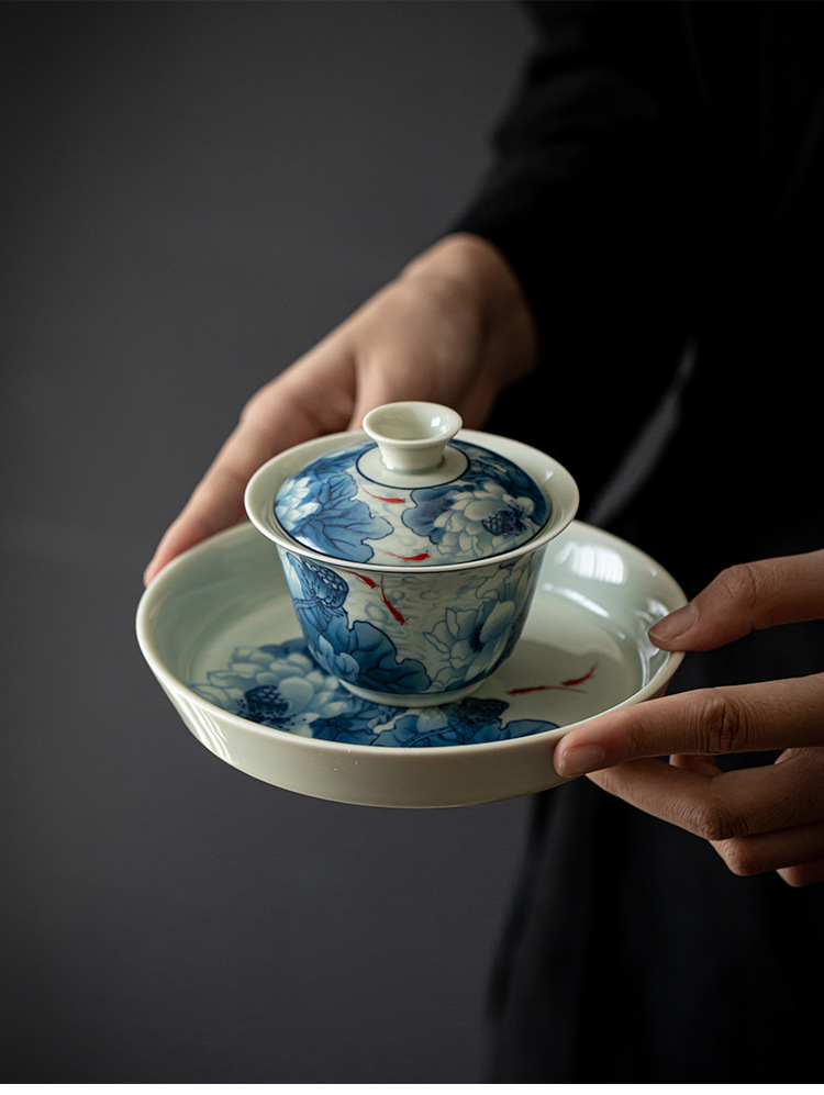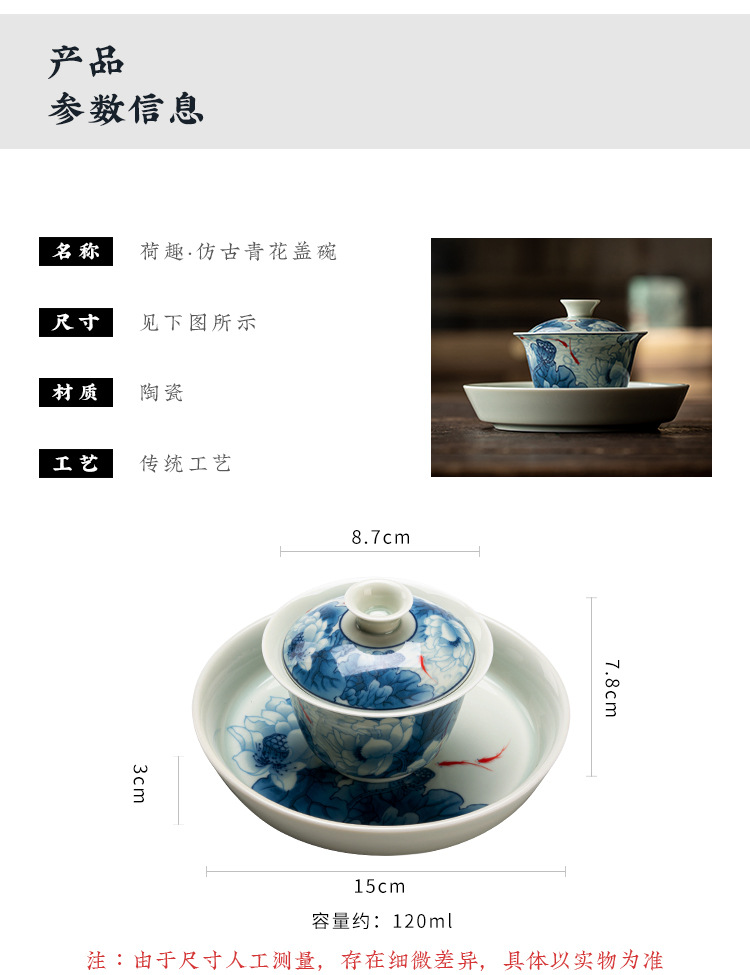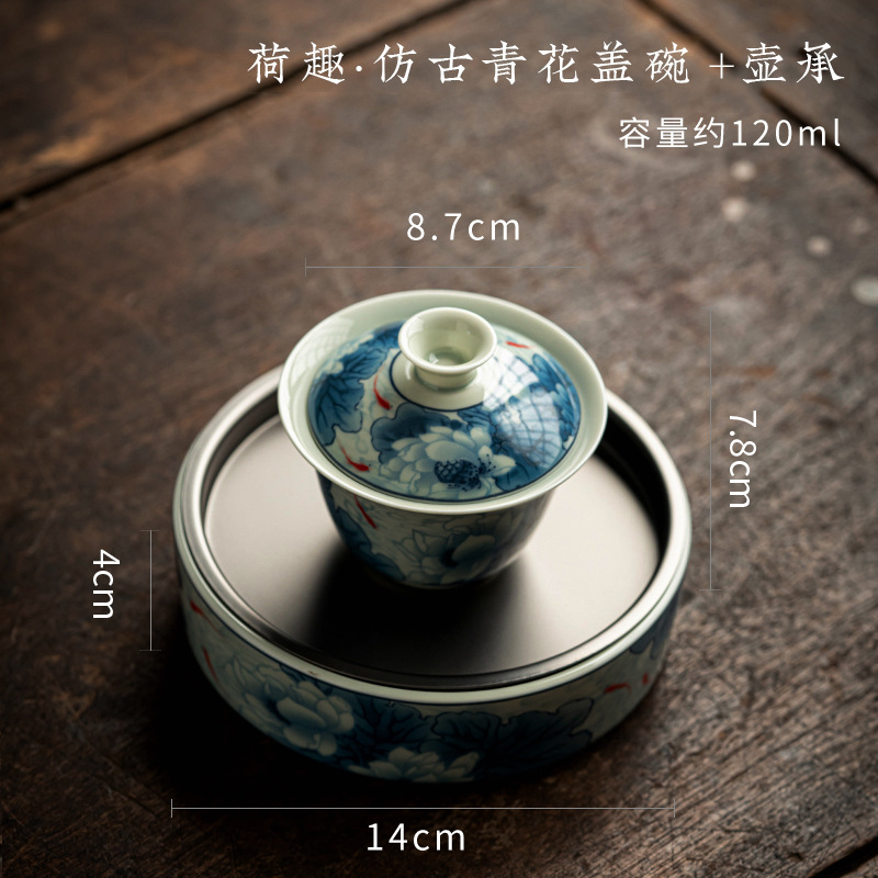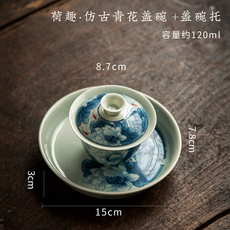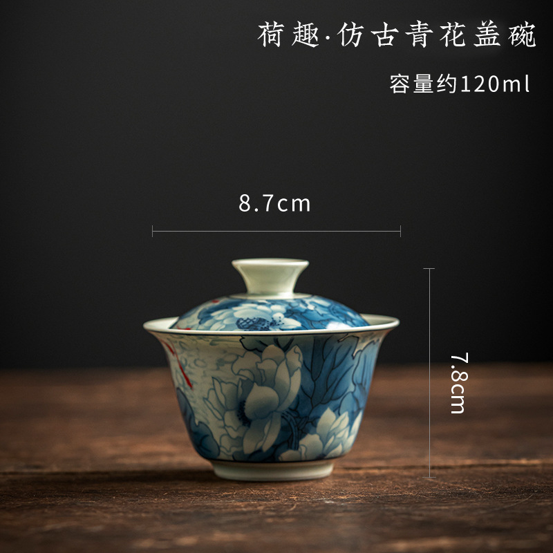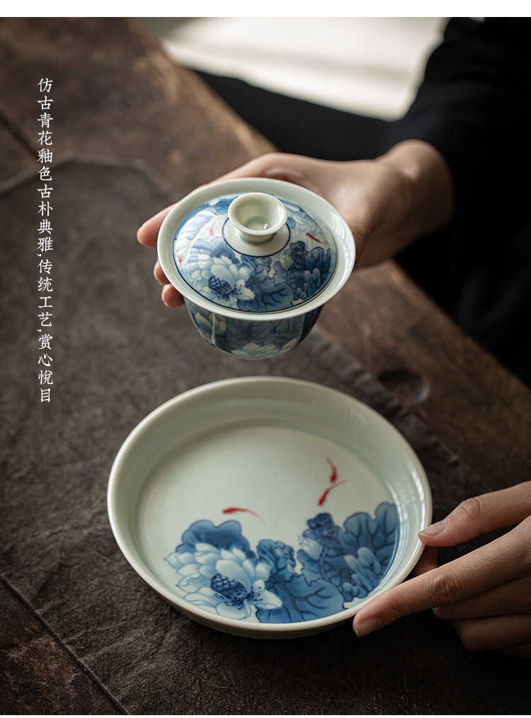 复古青花三才盖碗壶承简约功夫茶具手抓碗陶瓷茶杯茶盏带盖泡茶碗