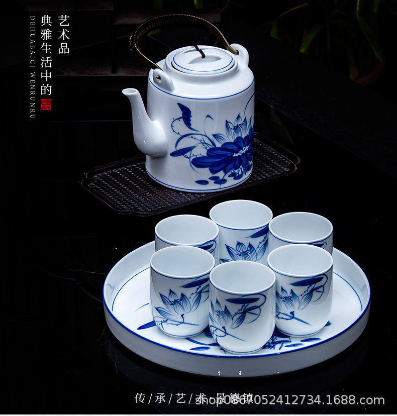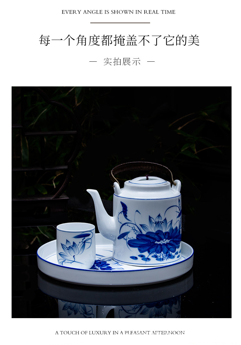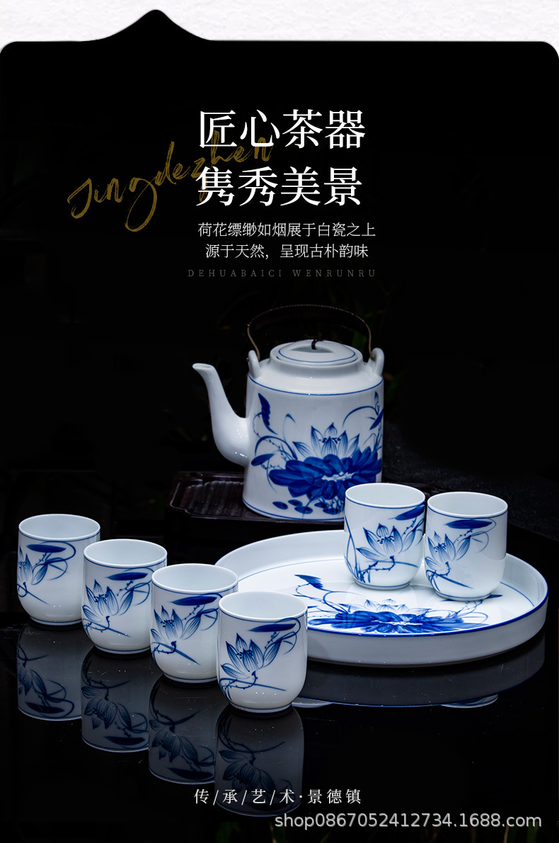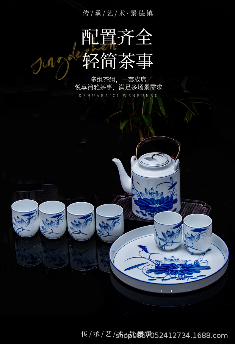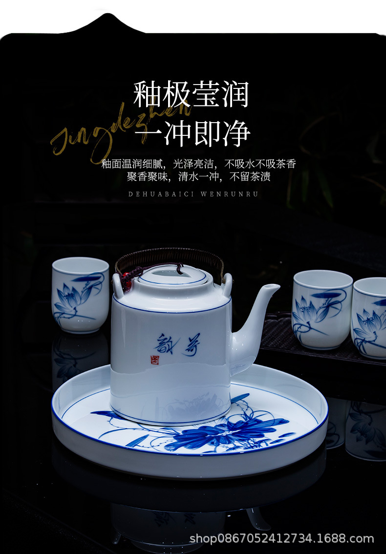 手绘青花瓷茶具套装家用会客办公中式景德镇陶瓷提梁茶壶茶杯批发