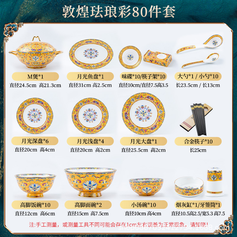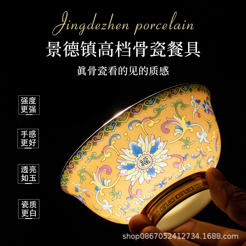 景德镇奢华中式珐琅彩碗碟套装家用骨瓷餐具高档礼品家用碗盘组合
