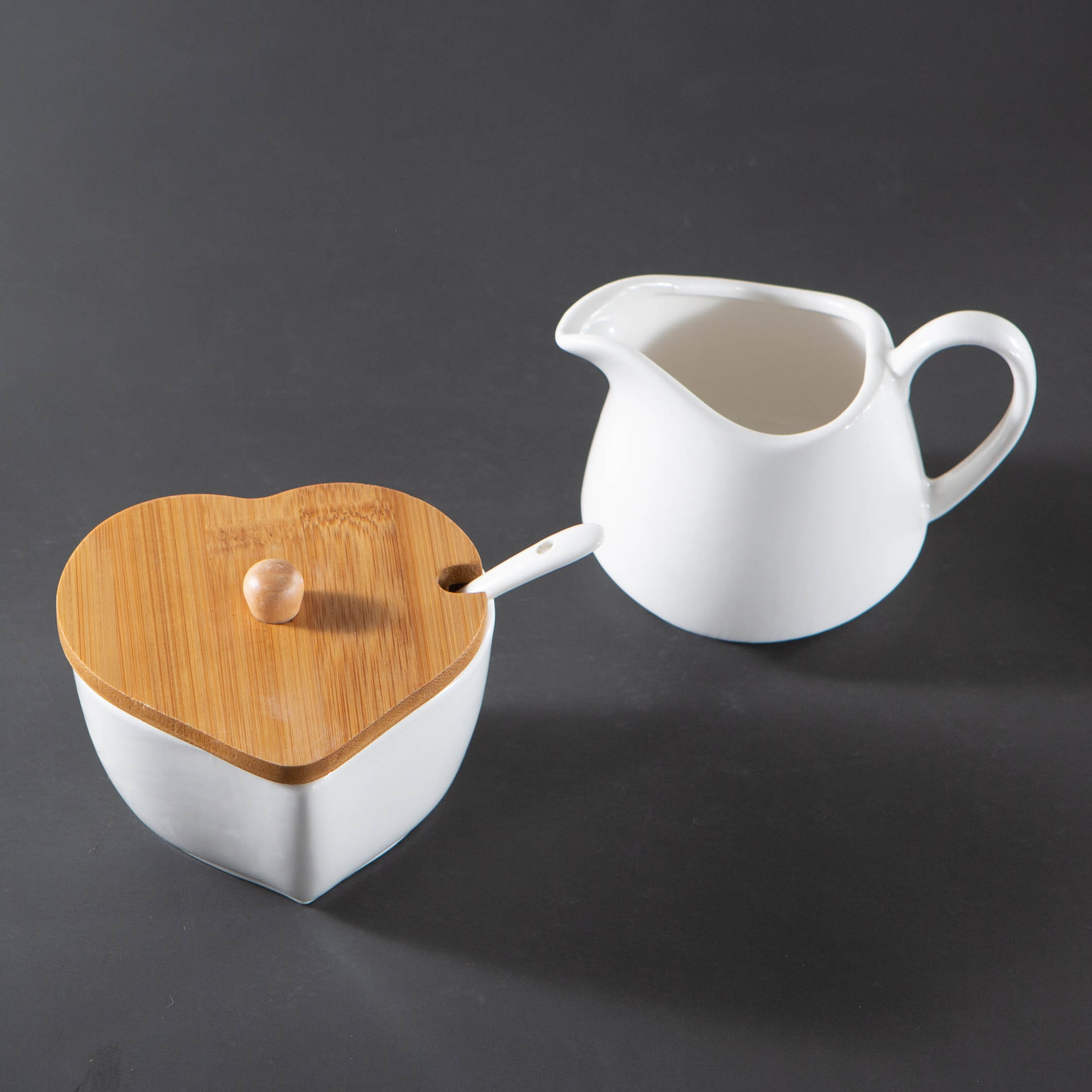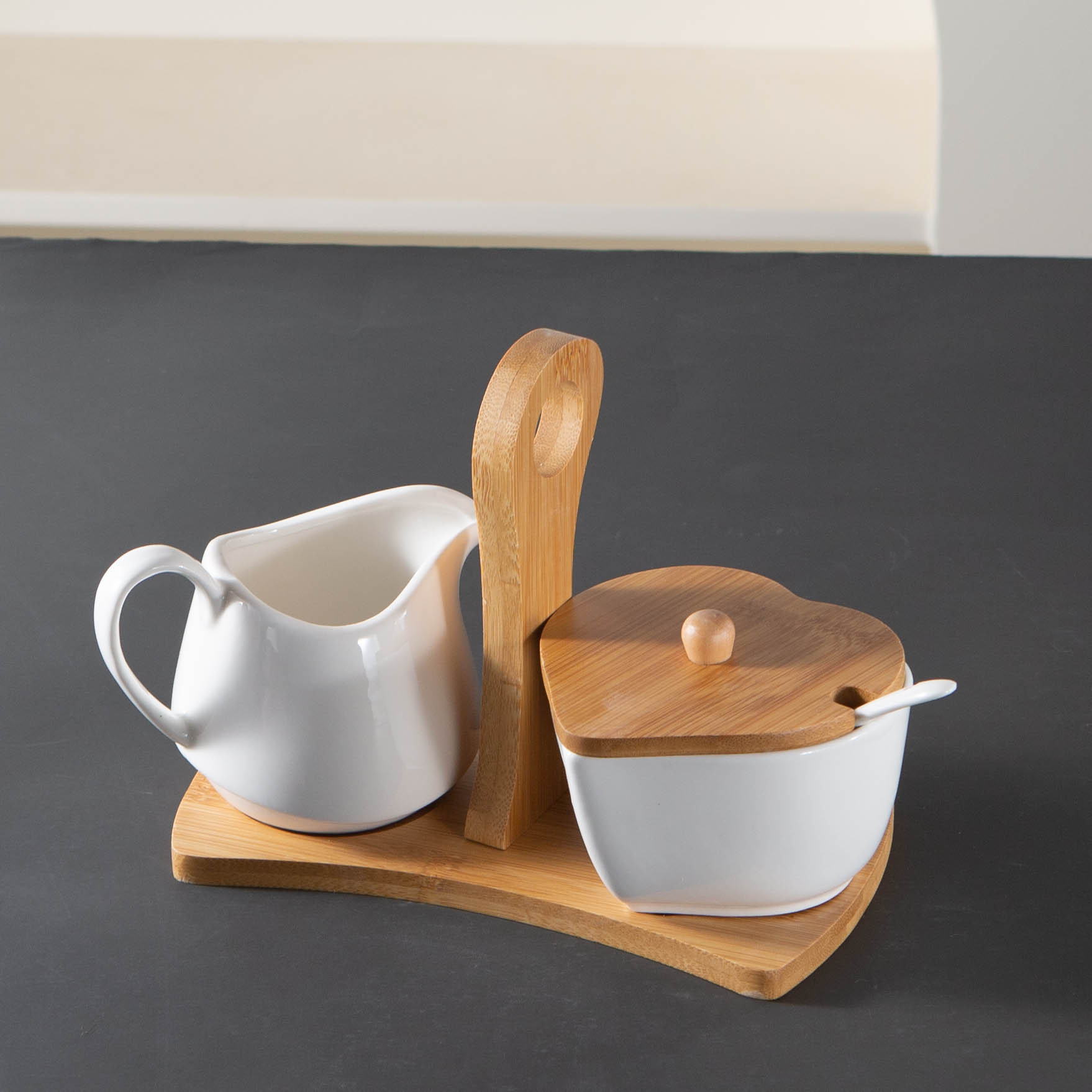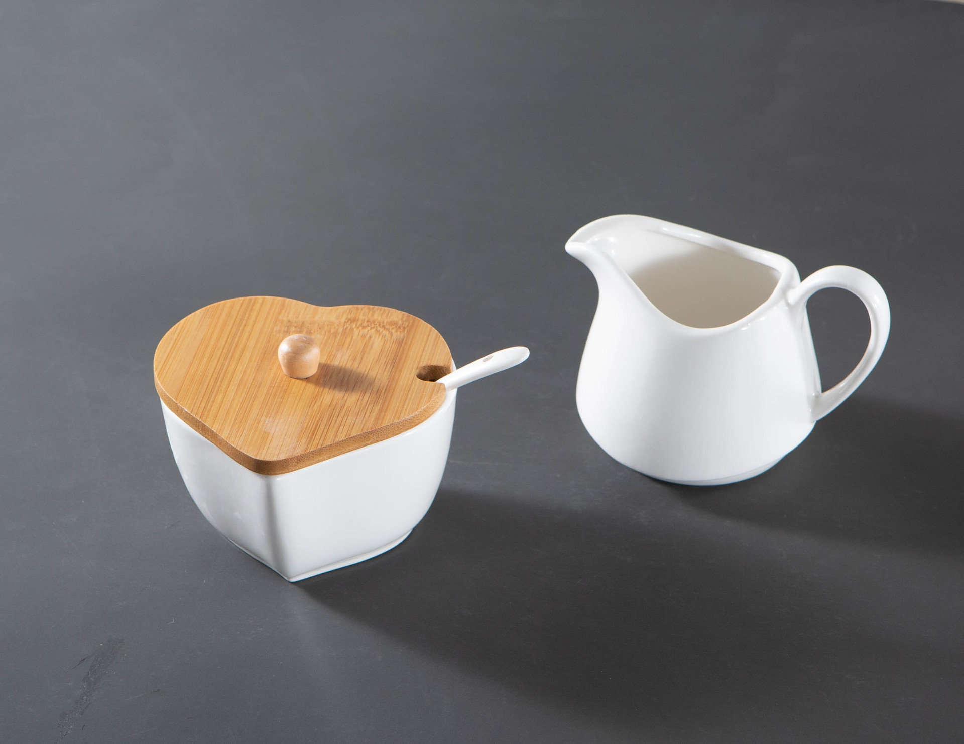 现货亚马逊纯白陶瓷糖罐奶壶套装带楠竹西餐台面跨境咖啡具奶盅