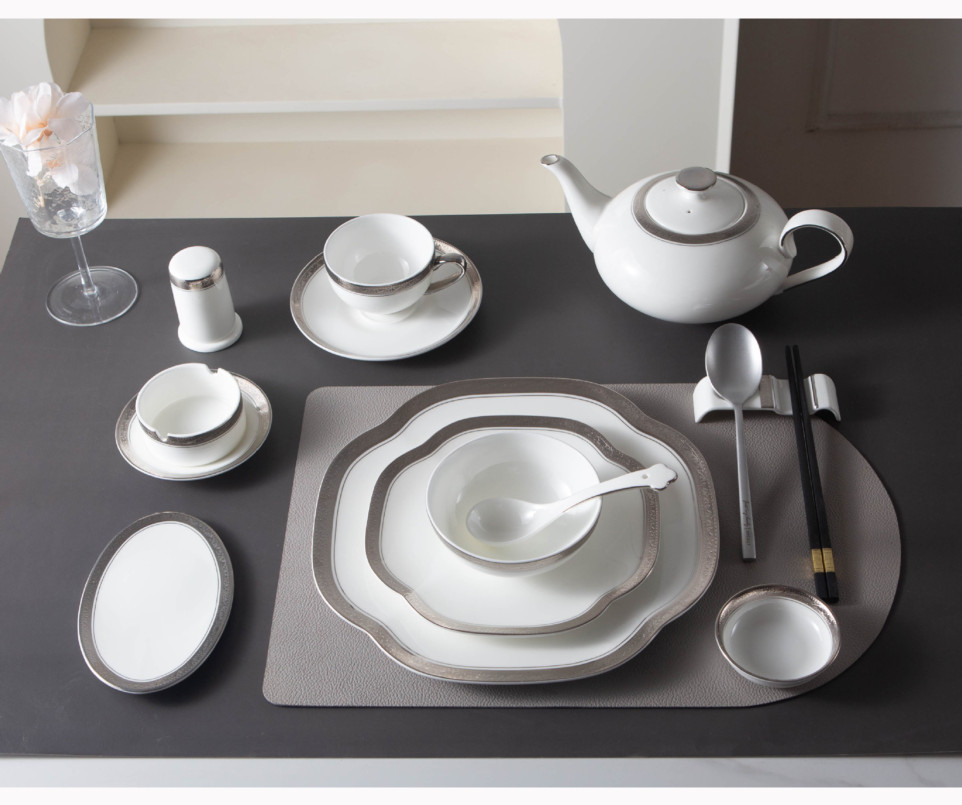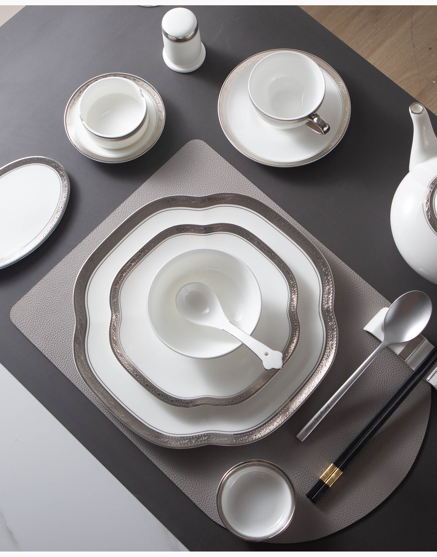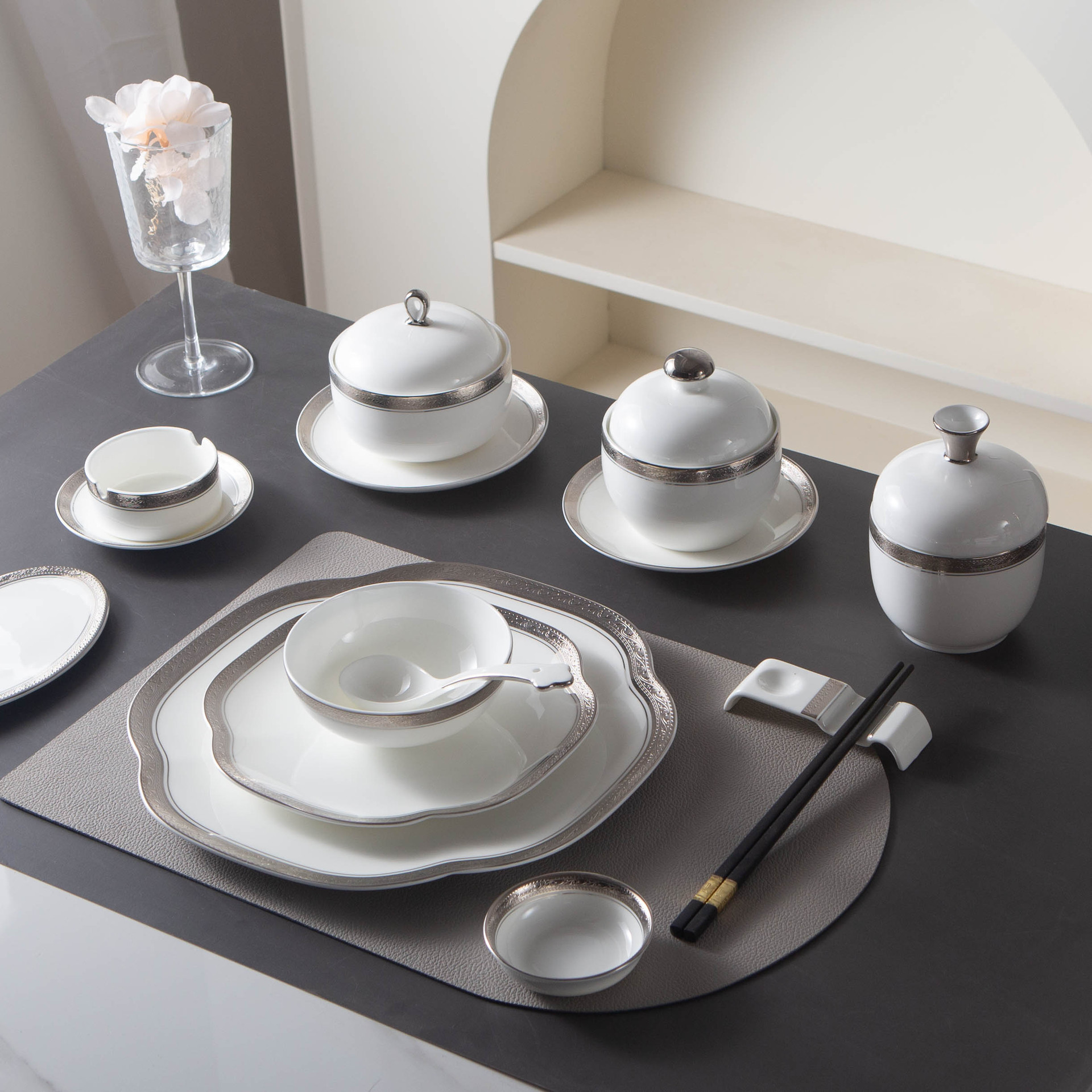 经典银边骨瓷餐具套装新中式会所包厢碗盘碟浮雕五星级酒店摆台