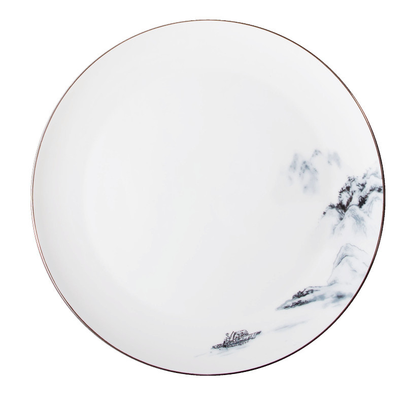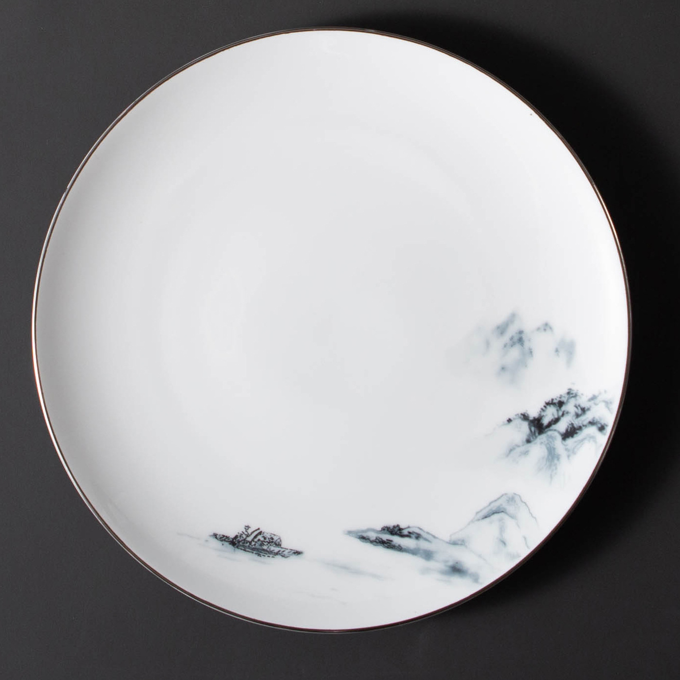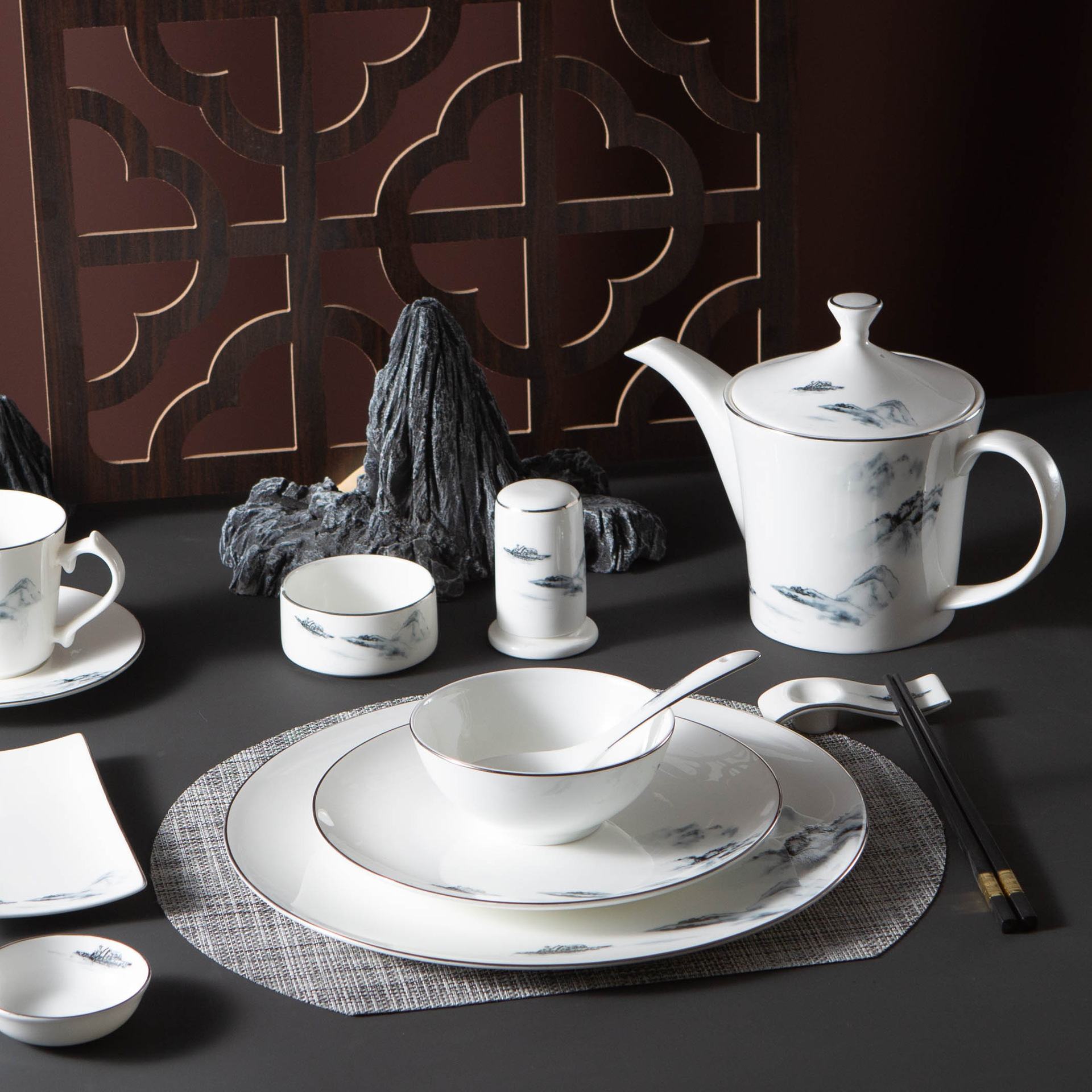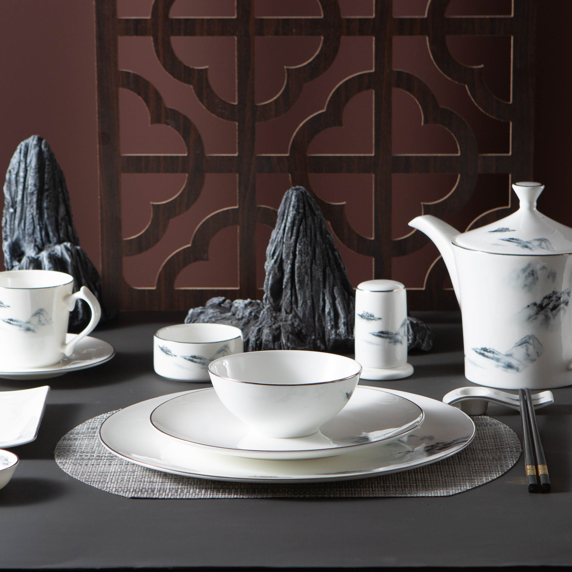 水墨骨瓷餐具金边碗盘碟杯高档中式包厢酒店摆台餐厅四件套可logo