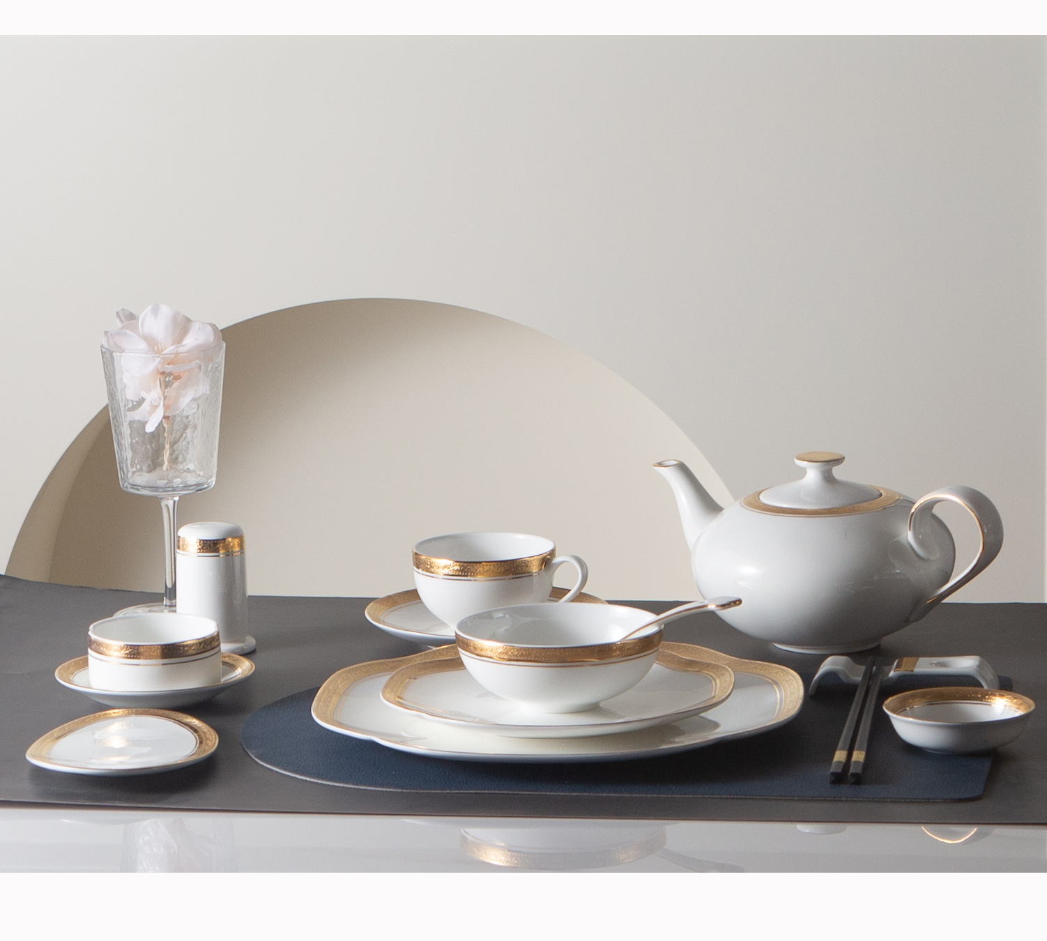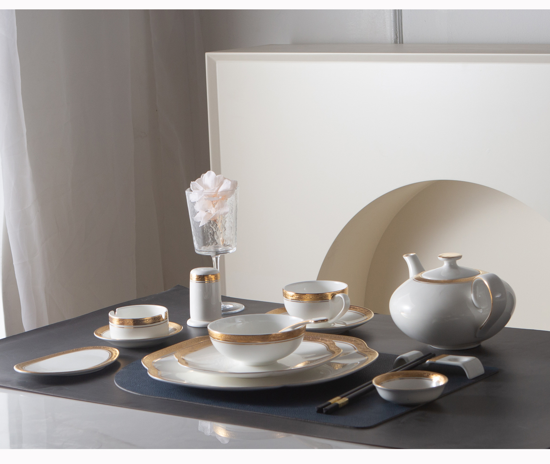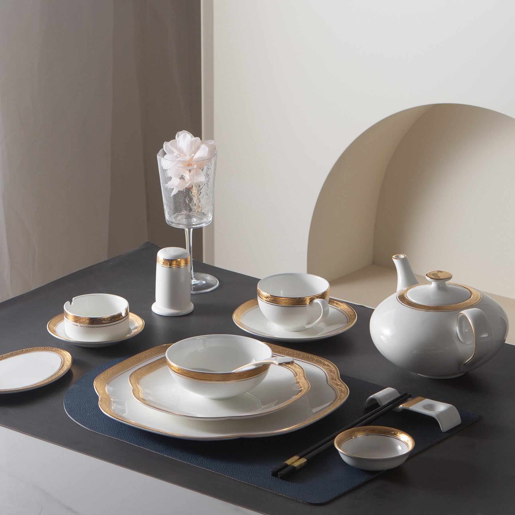 经典金边骨瓷餐具套装新中式私人会所包厢碗盘碟浮雕五星级酒店摆