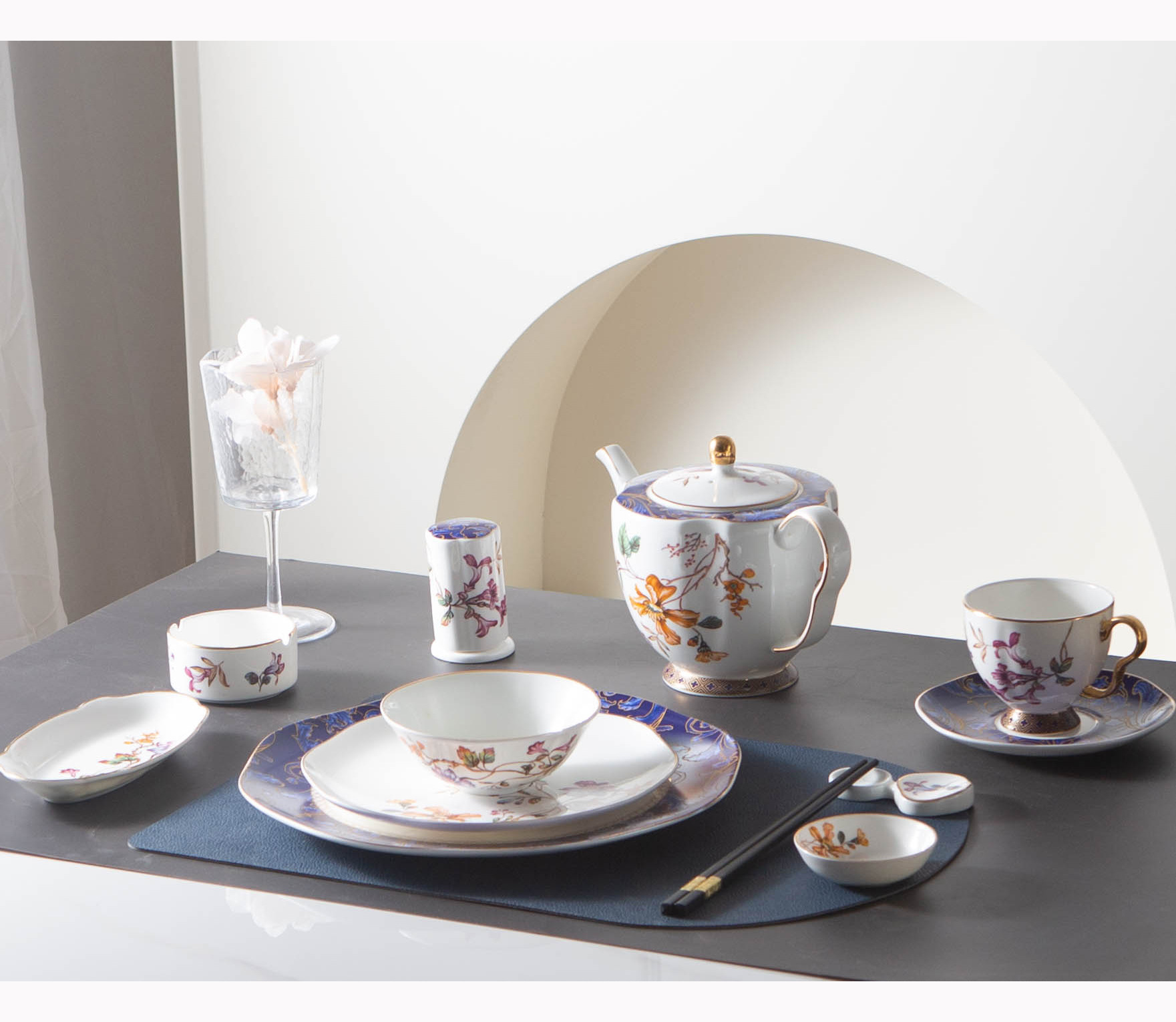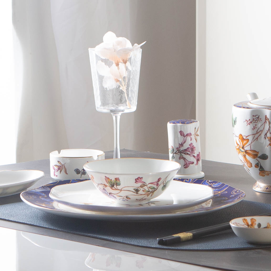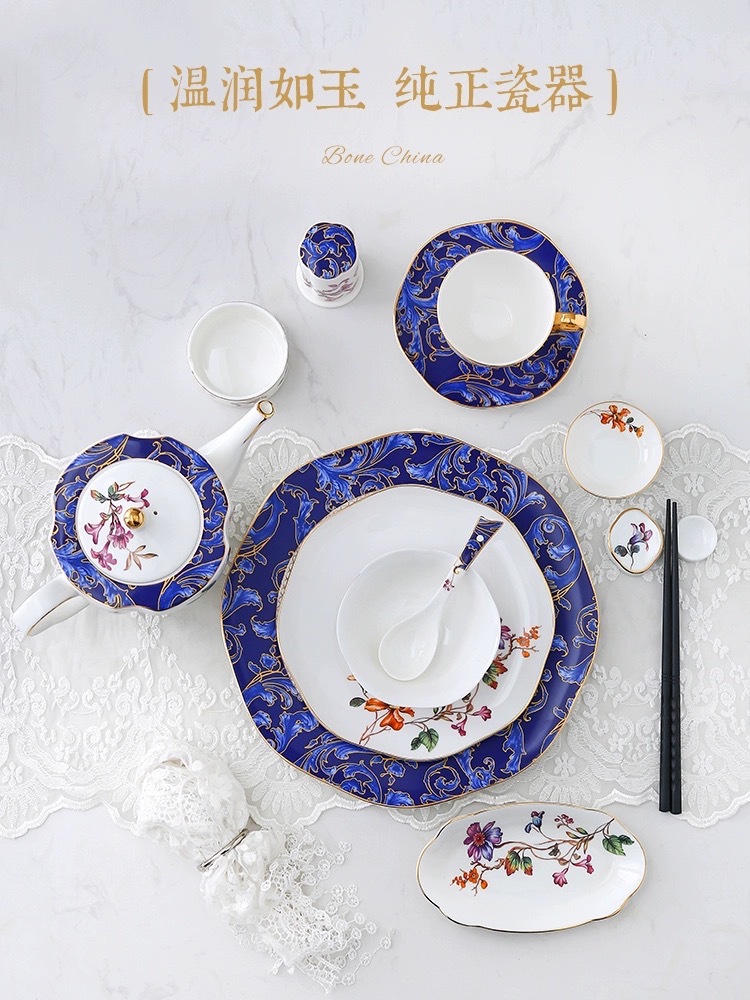高档酒店摆台骨瓷餐具手描金边花卉碗盘碟会所包厢餐具可加印LOGO