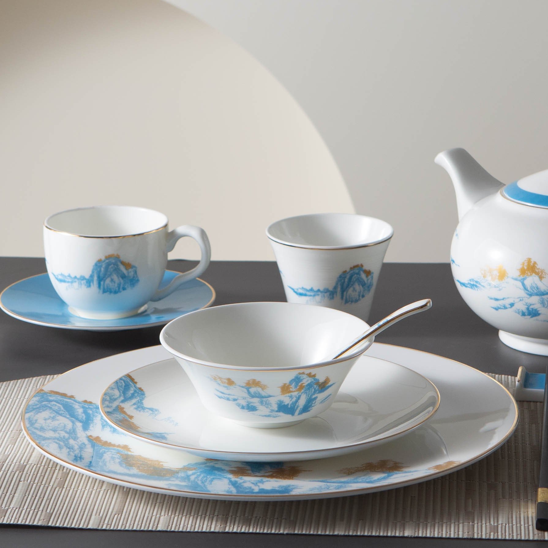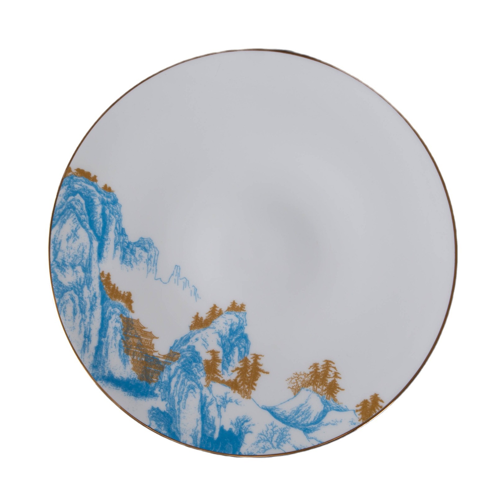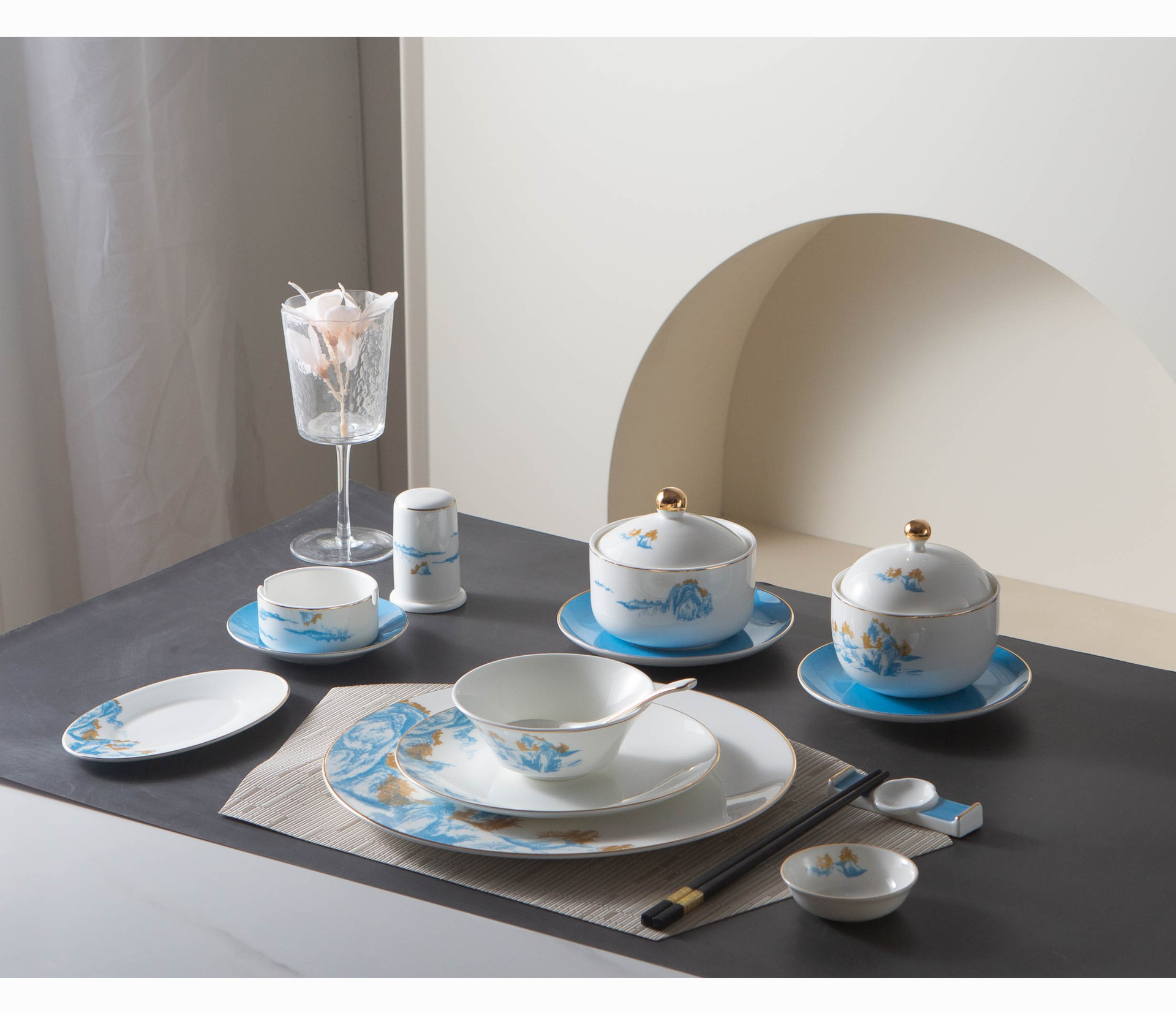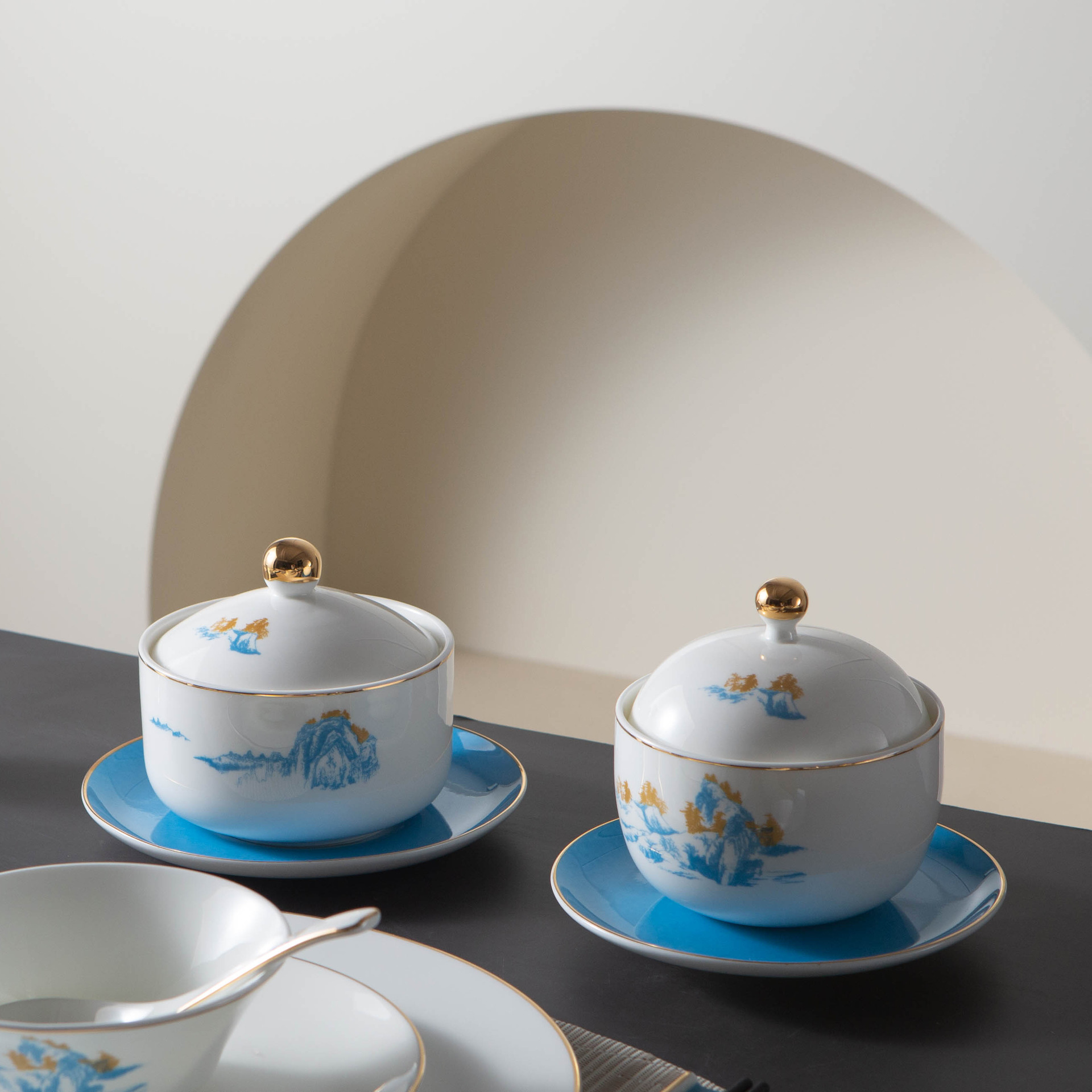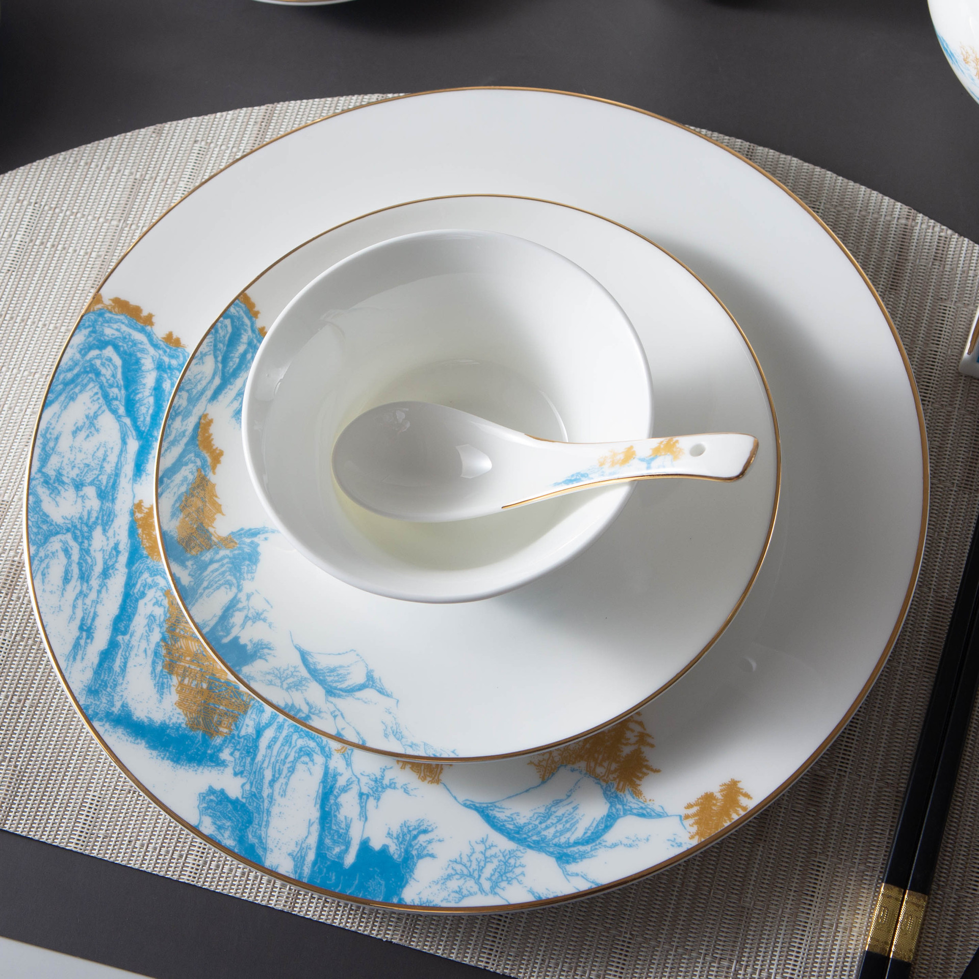 青山如黛碗盘碟位上餐具酒店摆台餐具会所包间金边山水骨瓷餐具