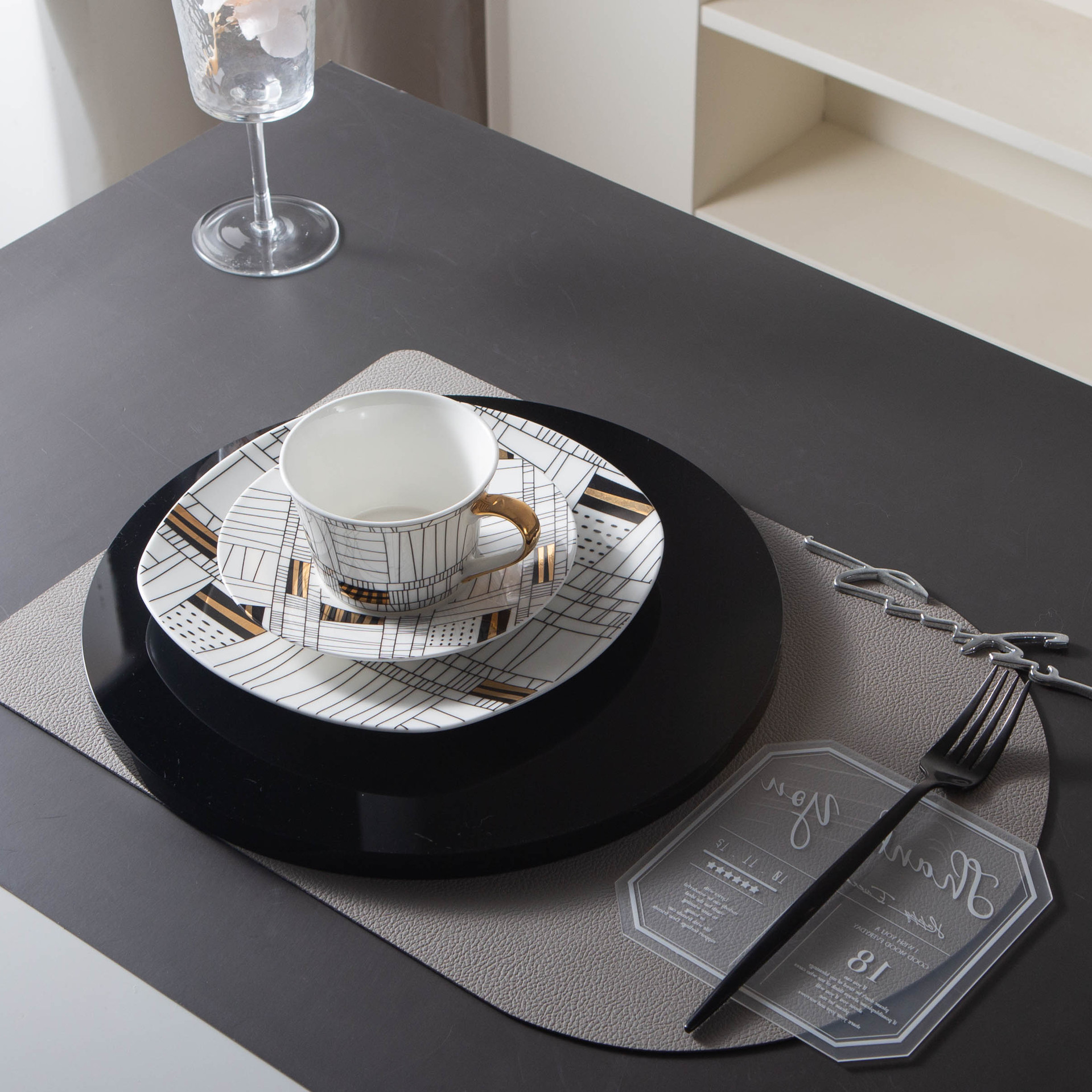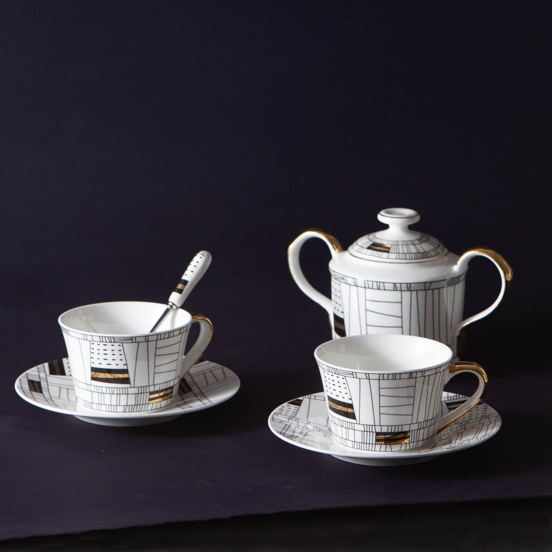 跨境黑白卡通咖啡杯简约手绘金边骨瓷杯套装样板间摆件轻奢花茶杯