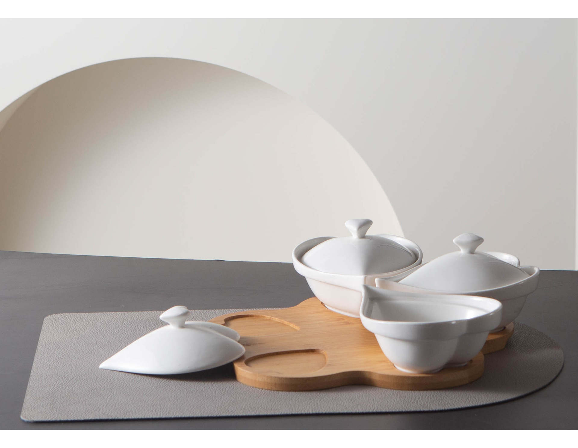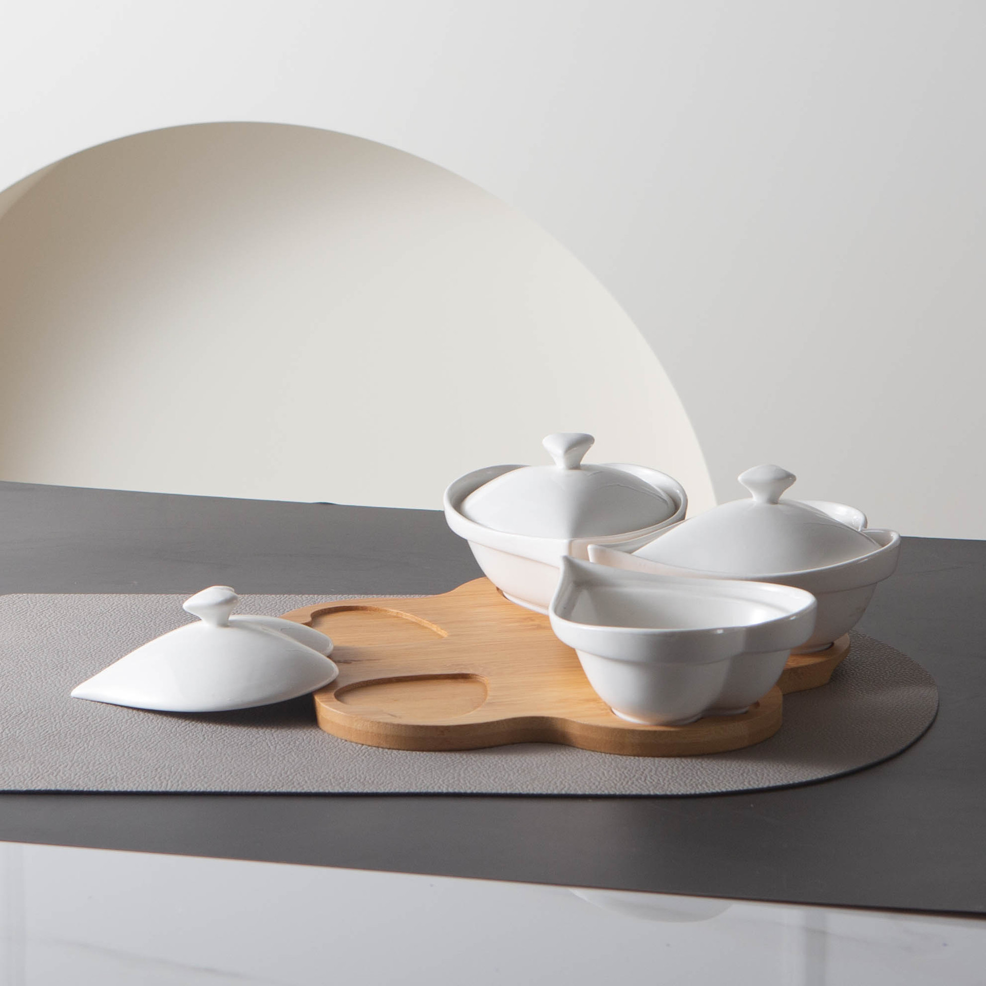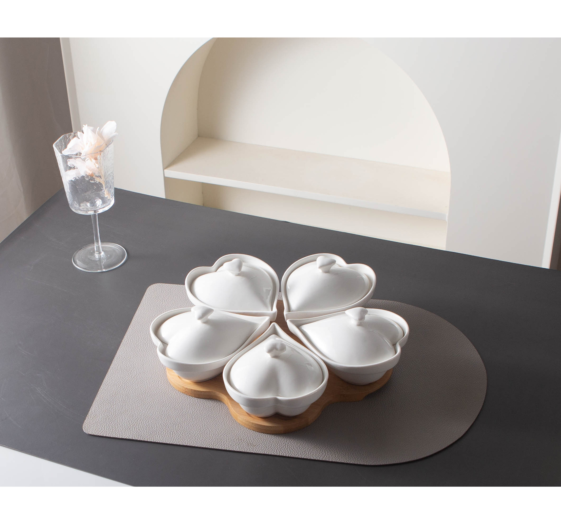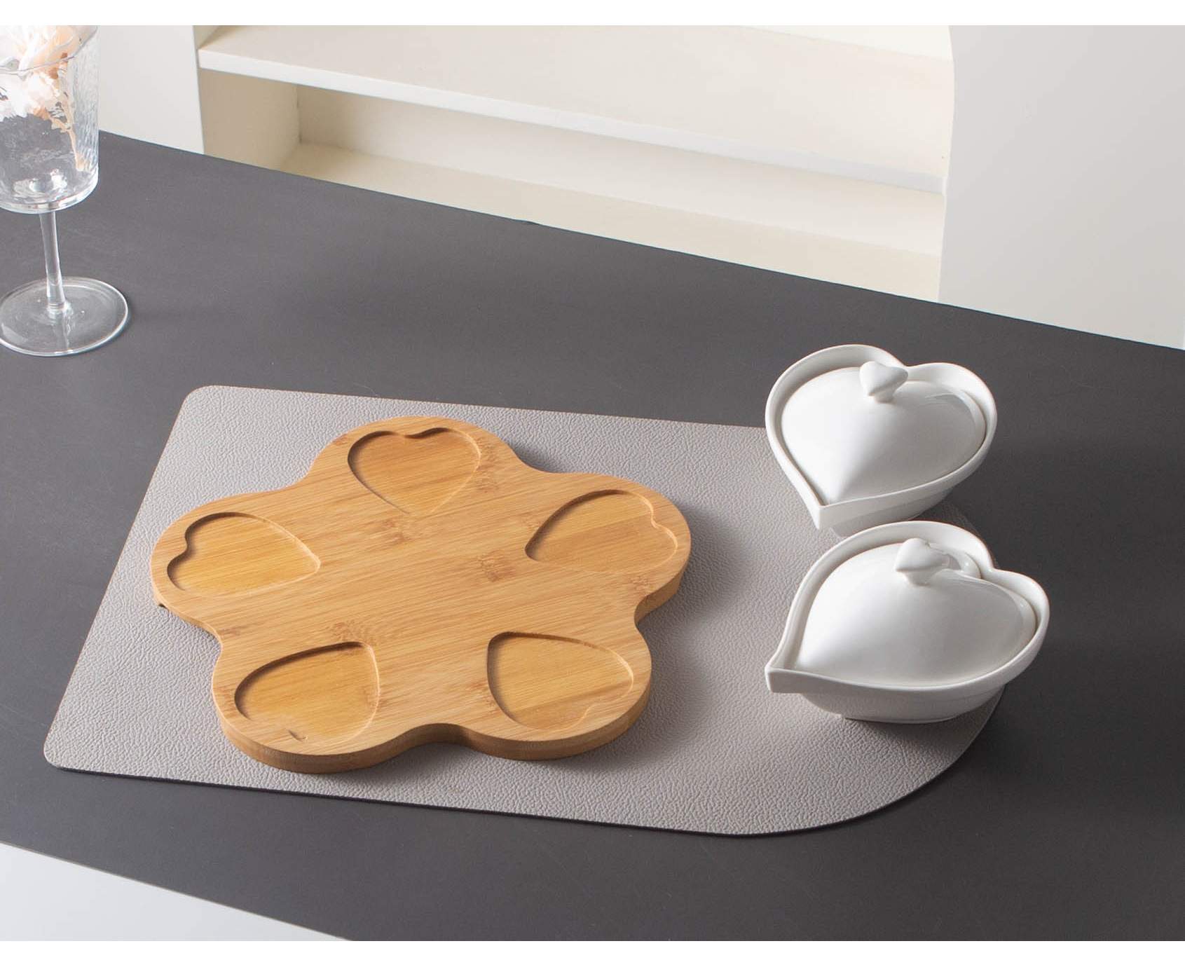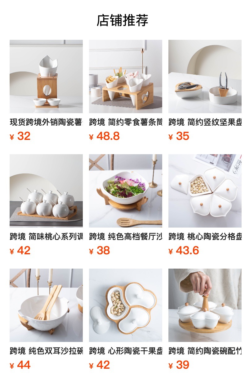 现货跨境心型分格水果盘小吃碗竹木底座简约带盖陶瓷干果零食托盘