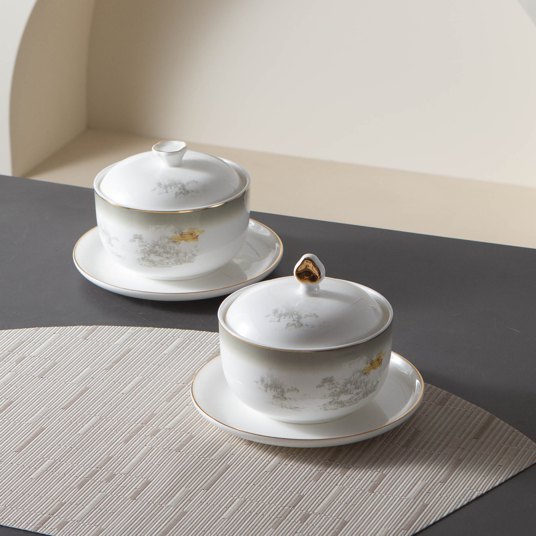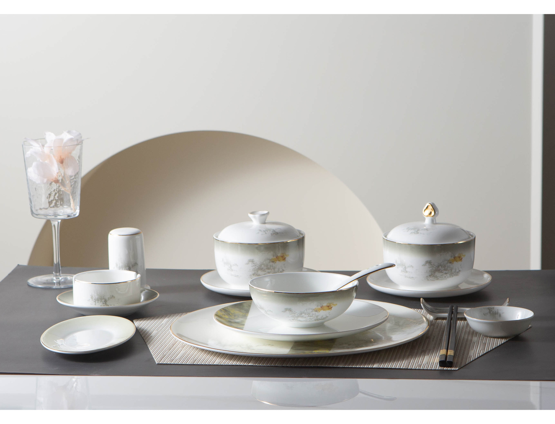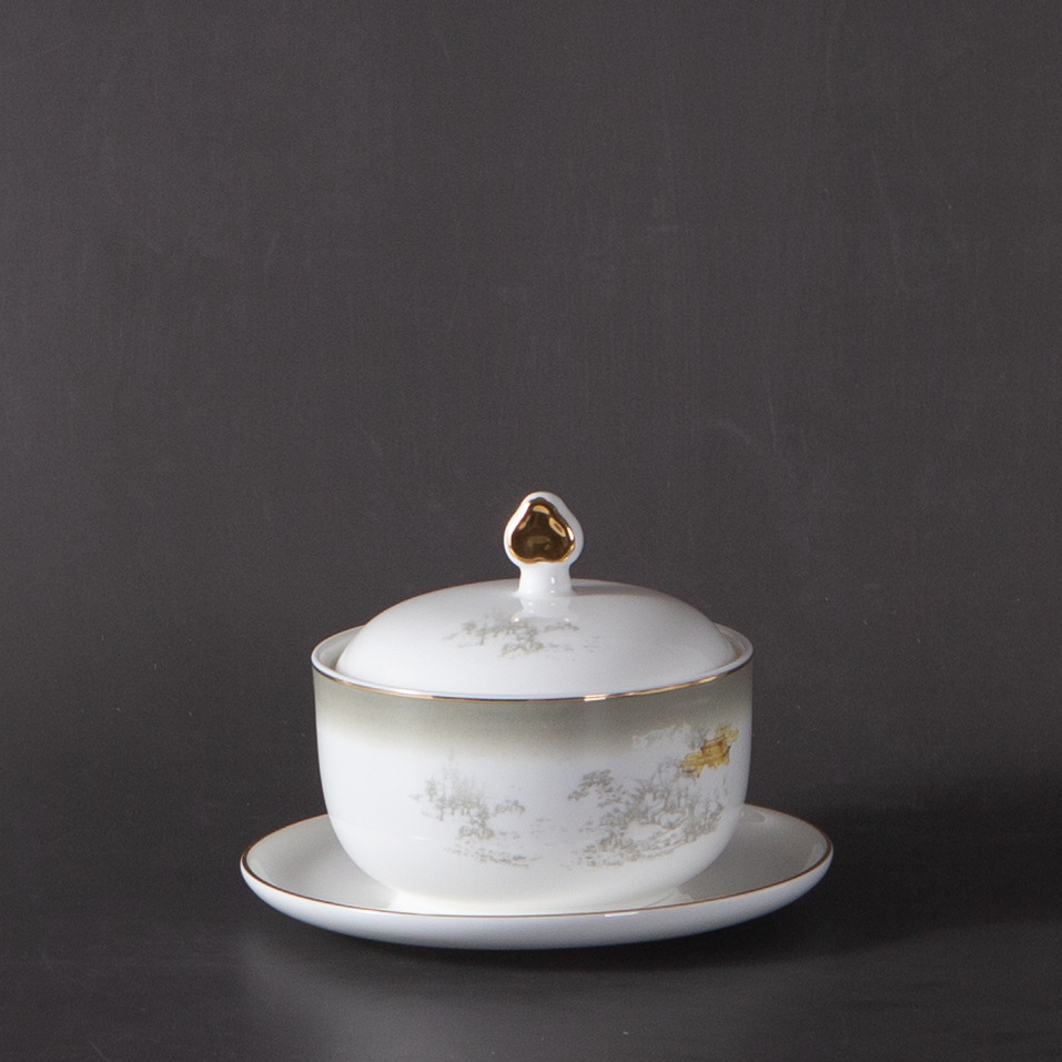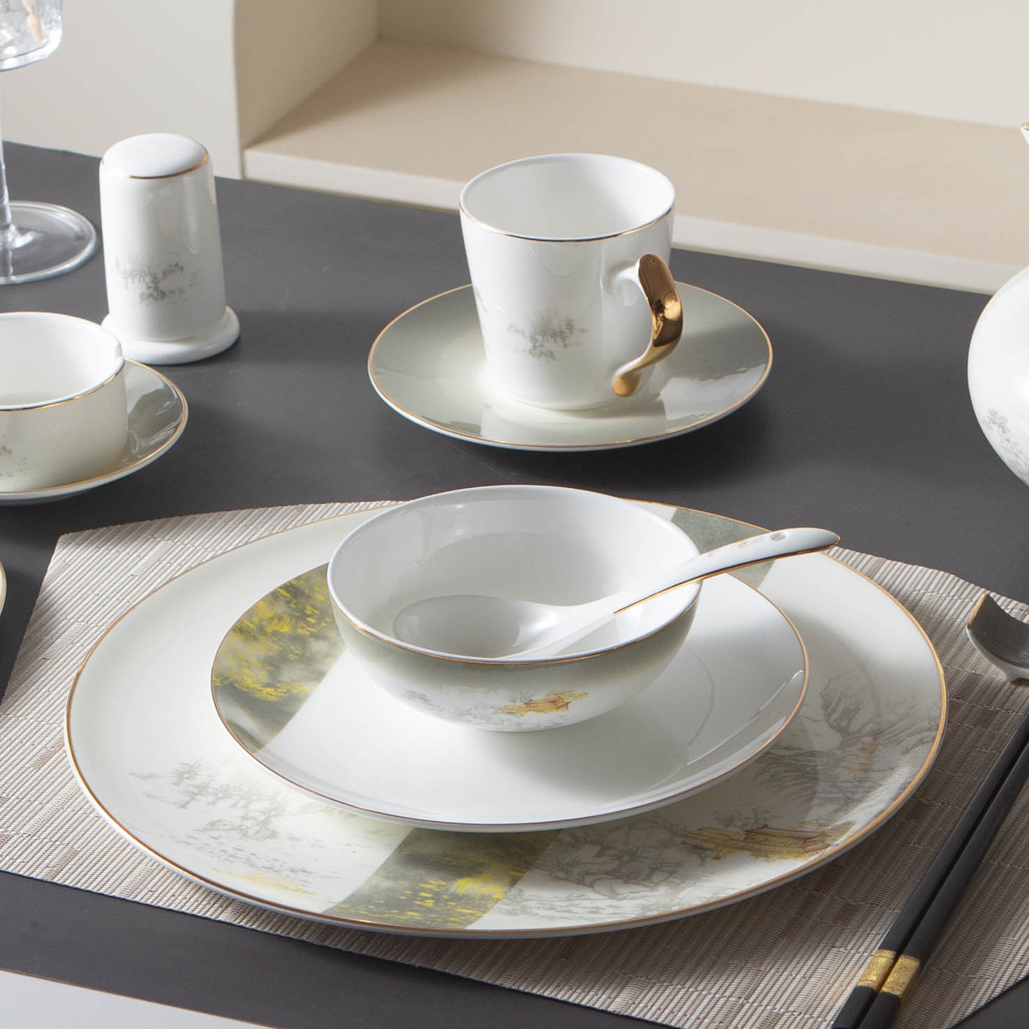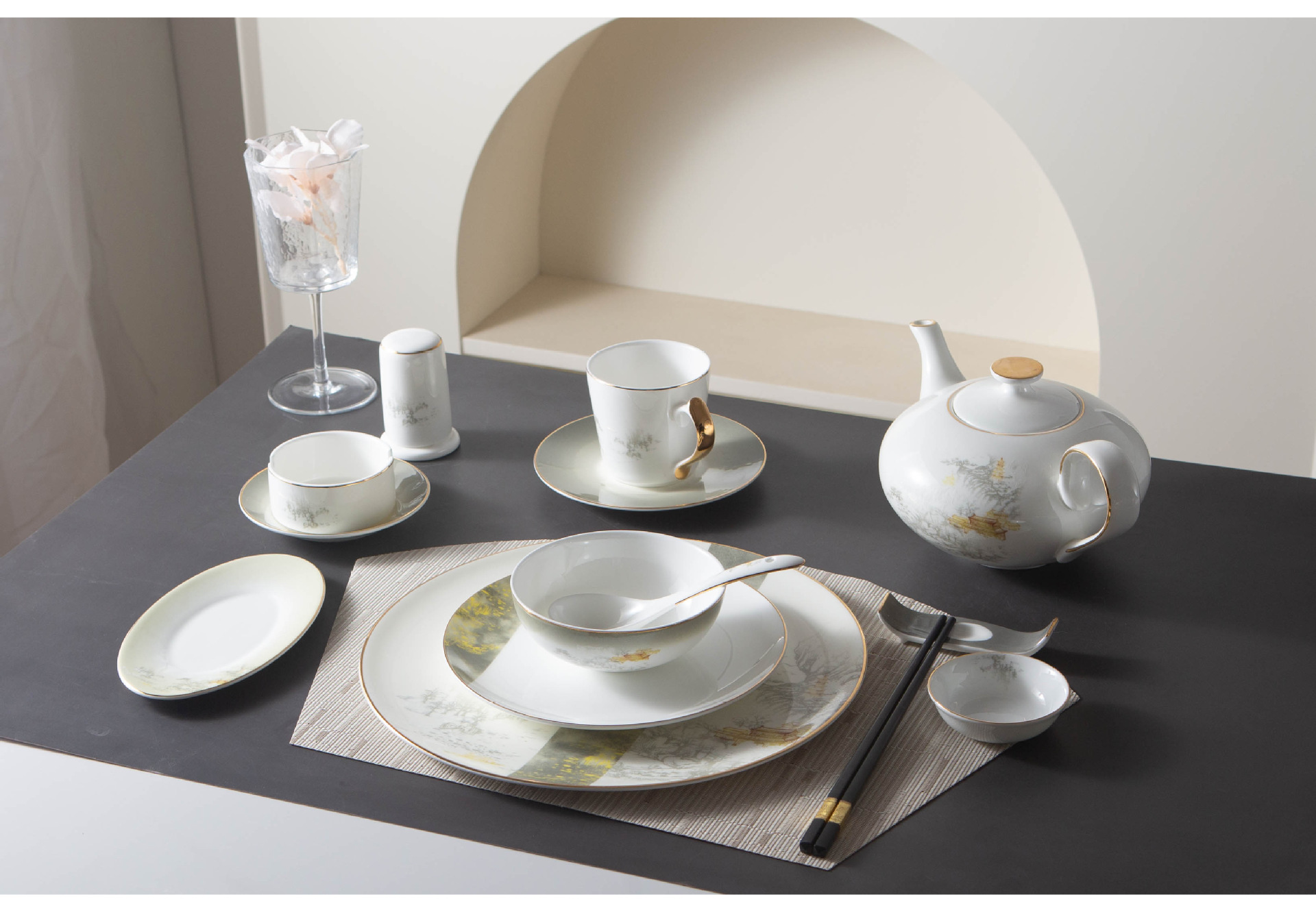 新中式华灯初上骨瓷碗盘碟杯套装手描金边私人会所包厢酒店摆台餐
