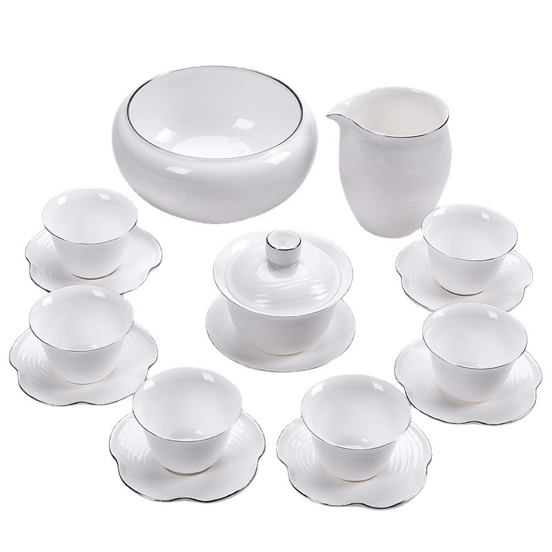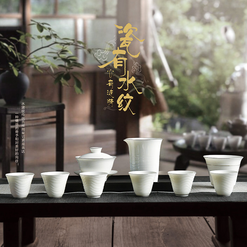 浮雕功夫茶具陶瓷茶杯水波纹绿茶三才盖碗品茗杯茶洗手工描银套装