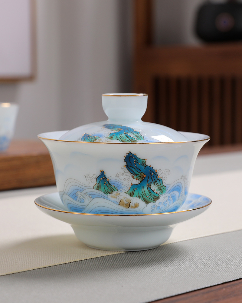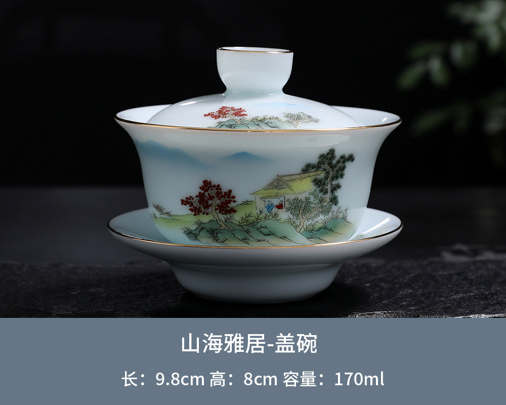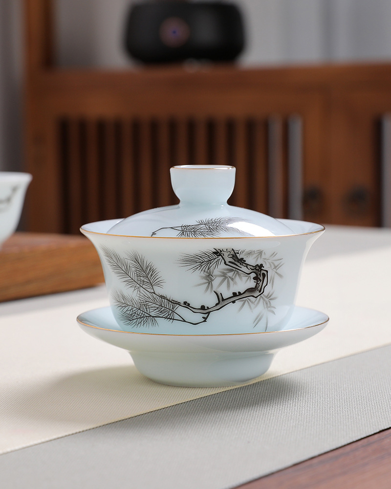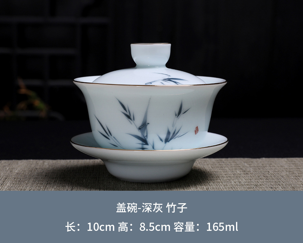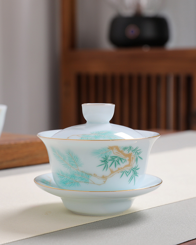 青瓷羊脂玉陶瓷三才盖碗喝茶碗三件套敬茶功夫茶具手工泡茶杯套
