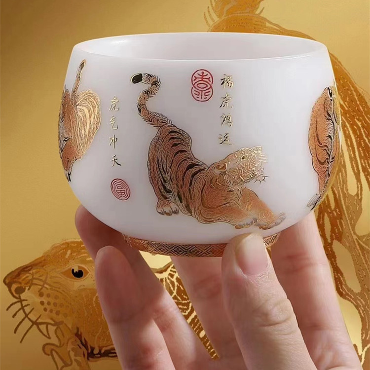 羊脂玉生肖茶杯五福虎 陶瓷主人杯品茗杯小茶盏单杯家用礼盒装