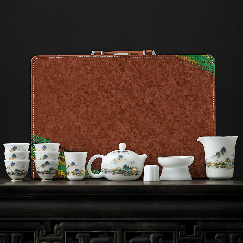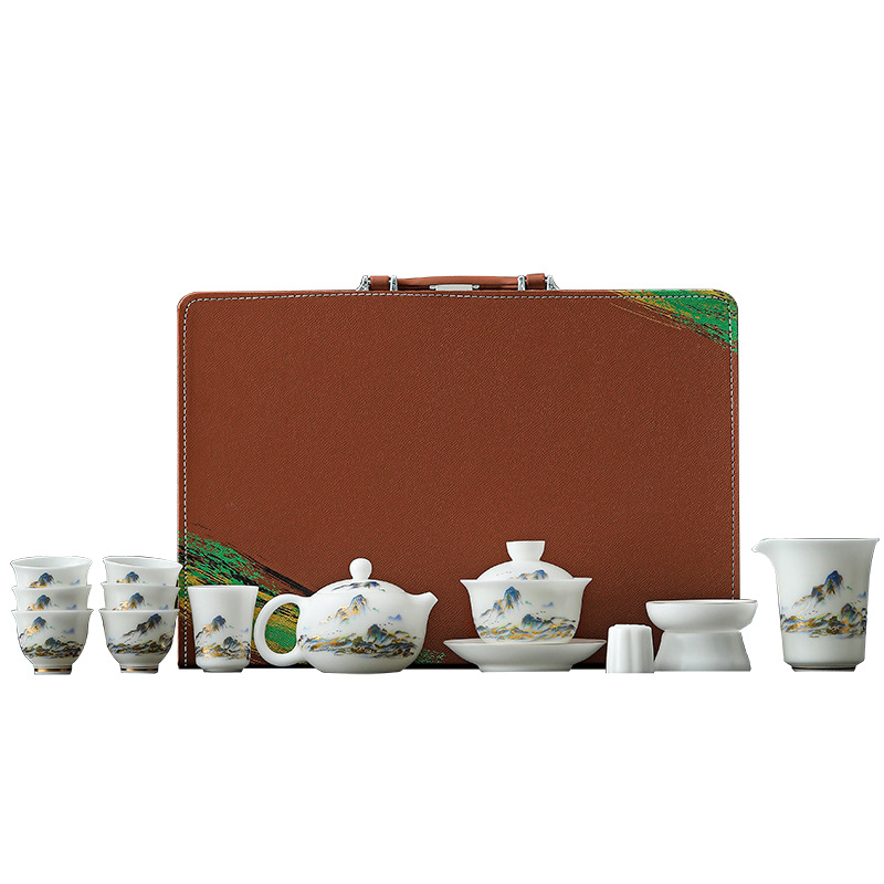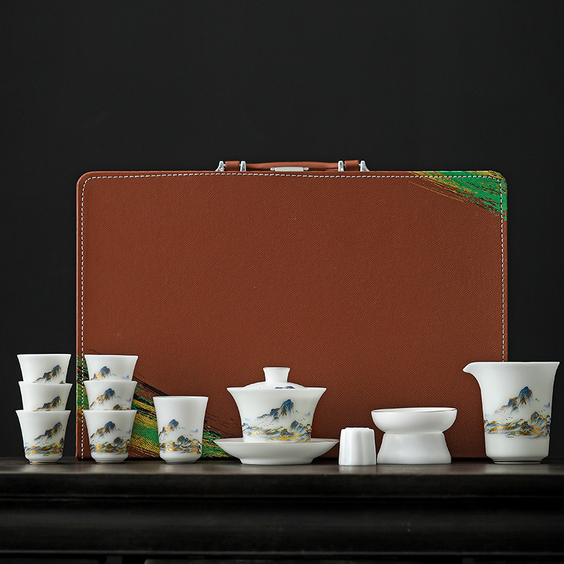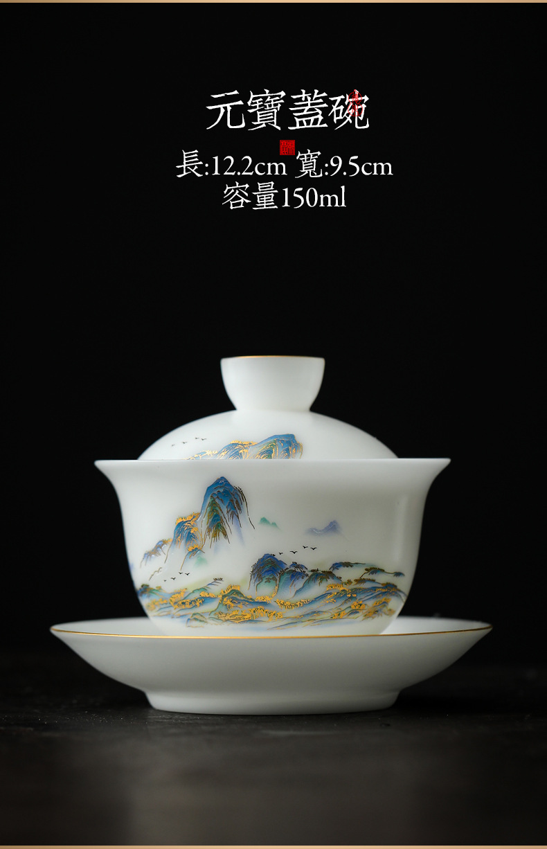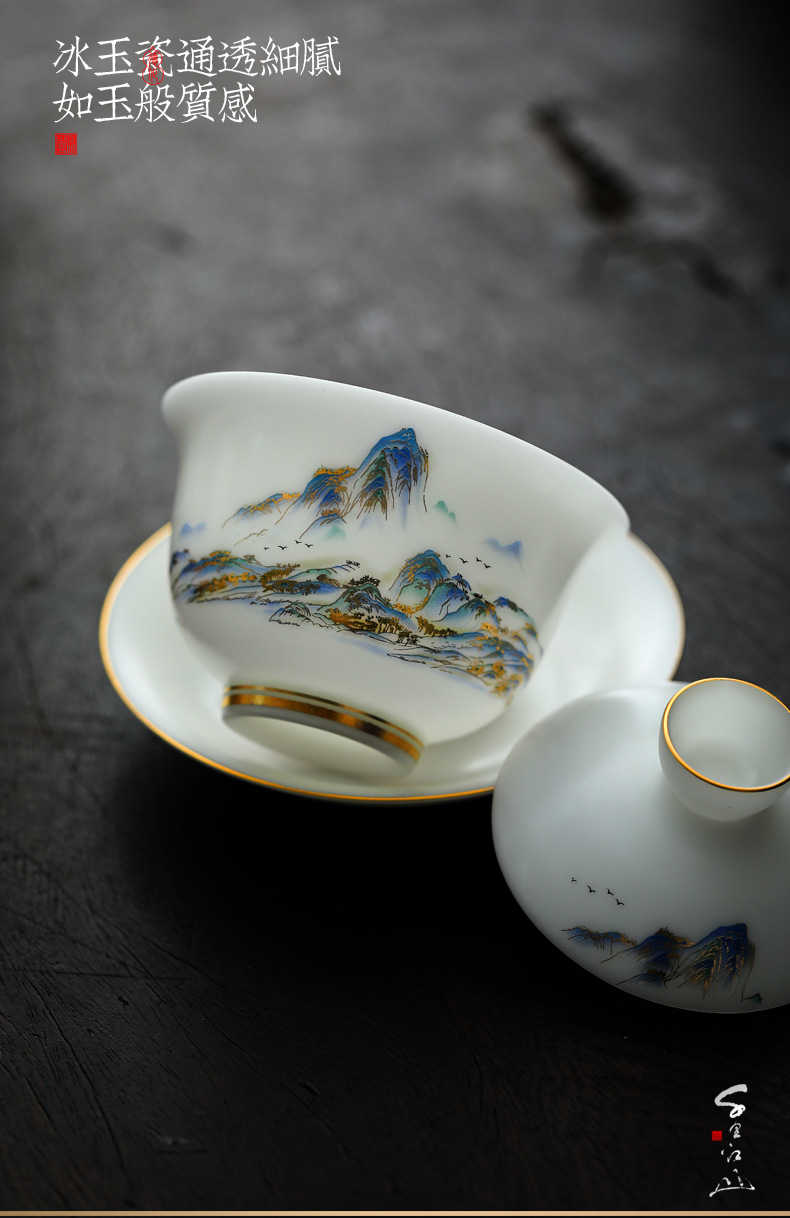 厂家高端千里江山冰种玉瓷盖碗茶杯壶功夫茶具套装送礼可做logo