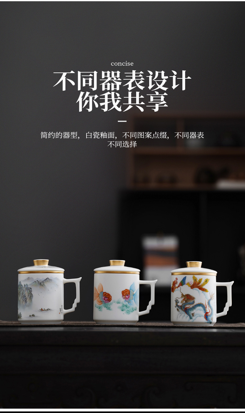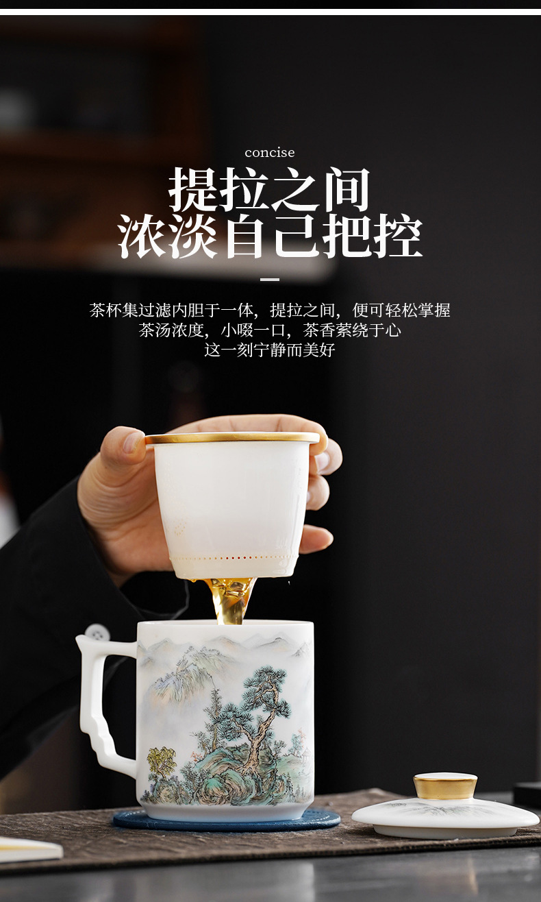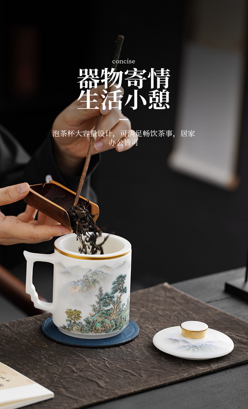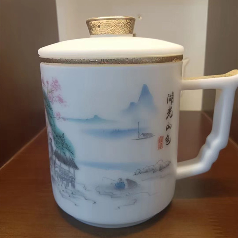 手绘羊脂玉陶瓷办公杯带盖过滤茶杯茶水分离水杯泡茶杯礼品定图案