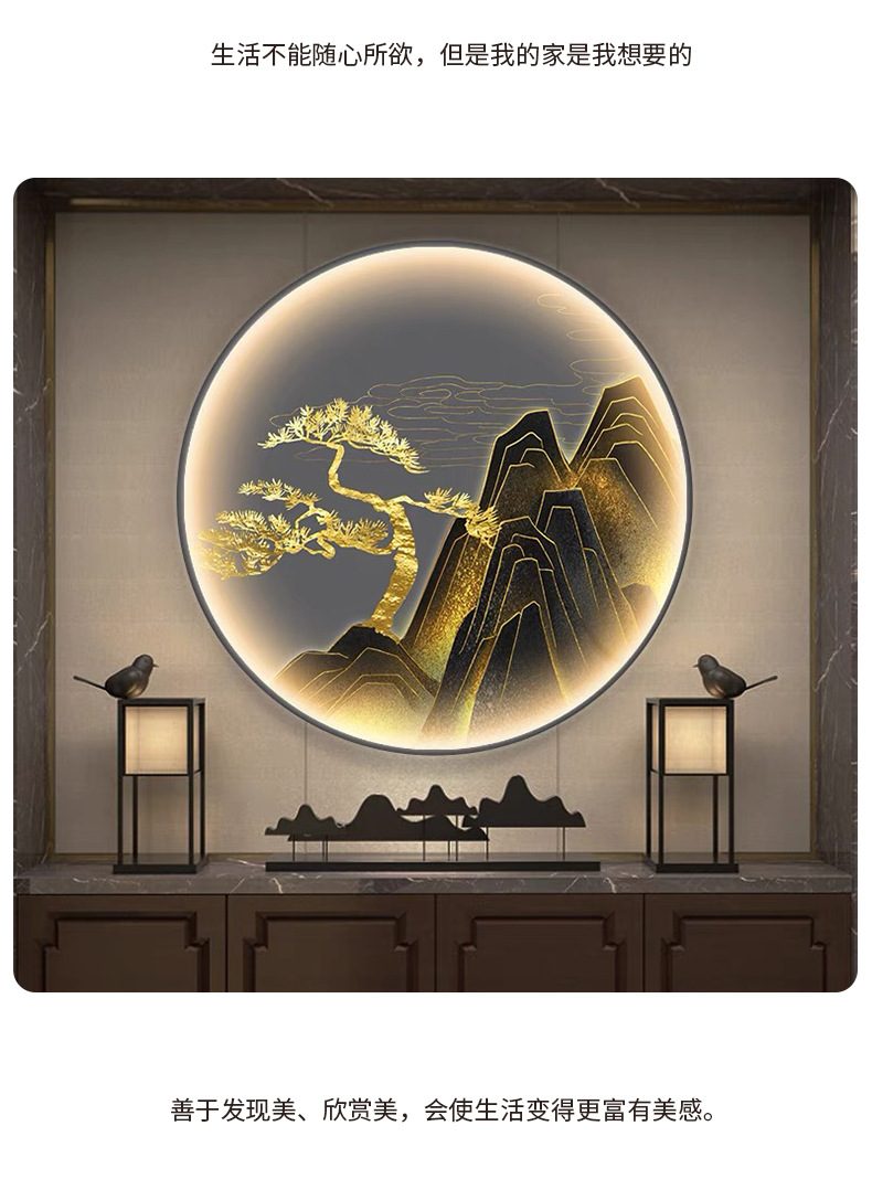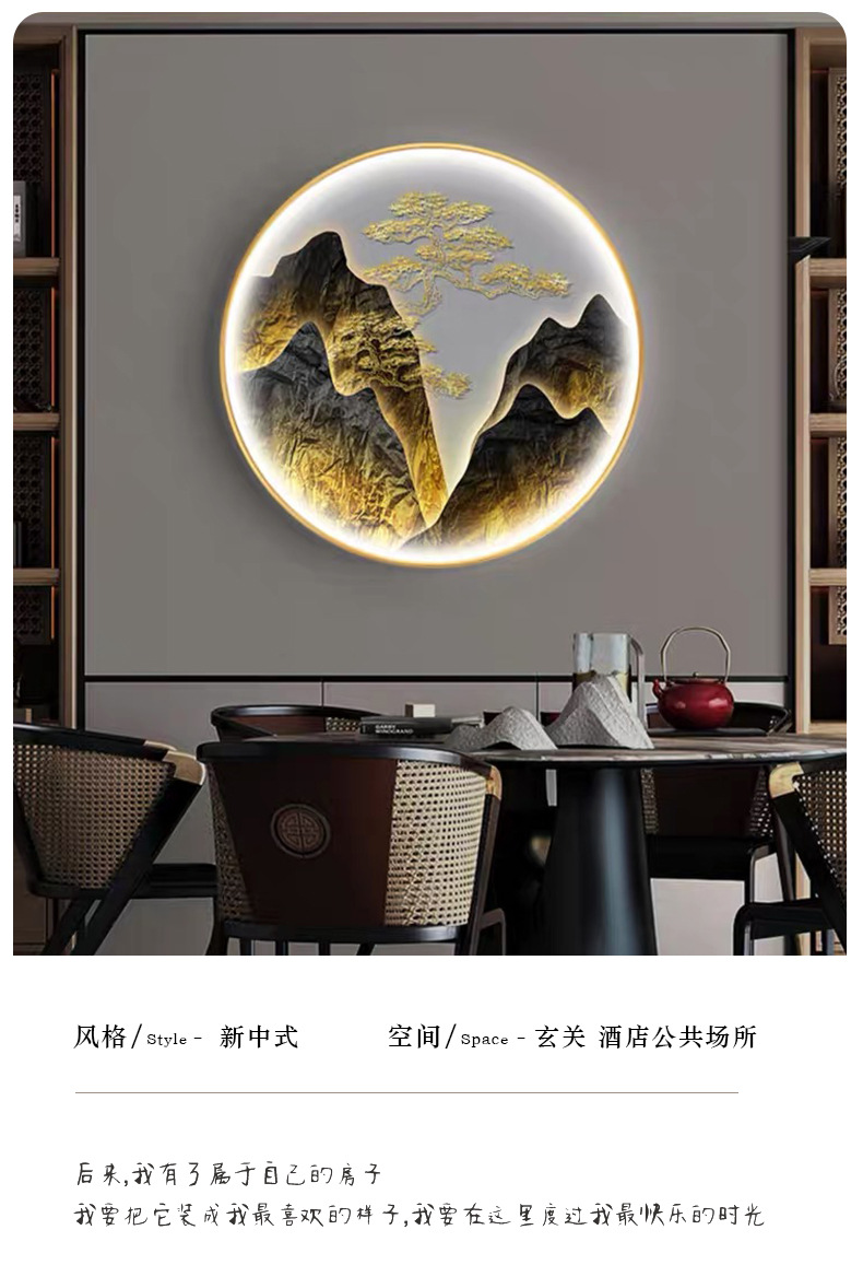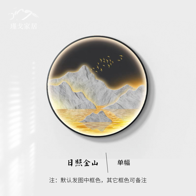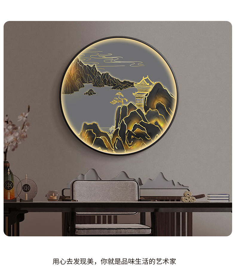 新中式玄关装饰画 led灯画禅意山水画客厅餐厅卧室圆形氛围画挂画
