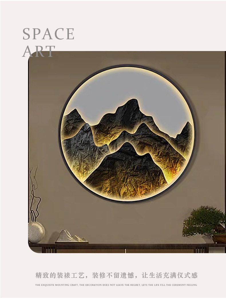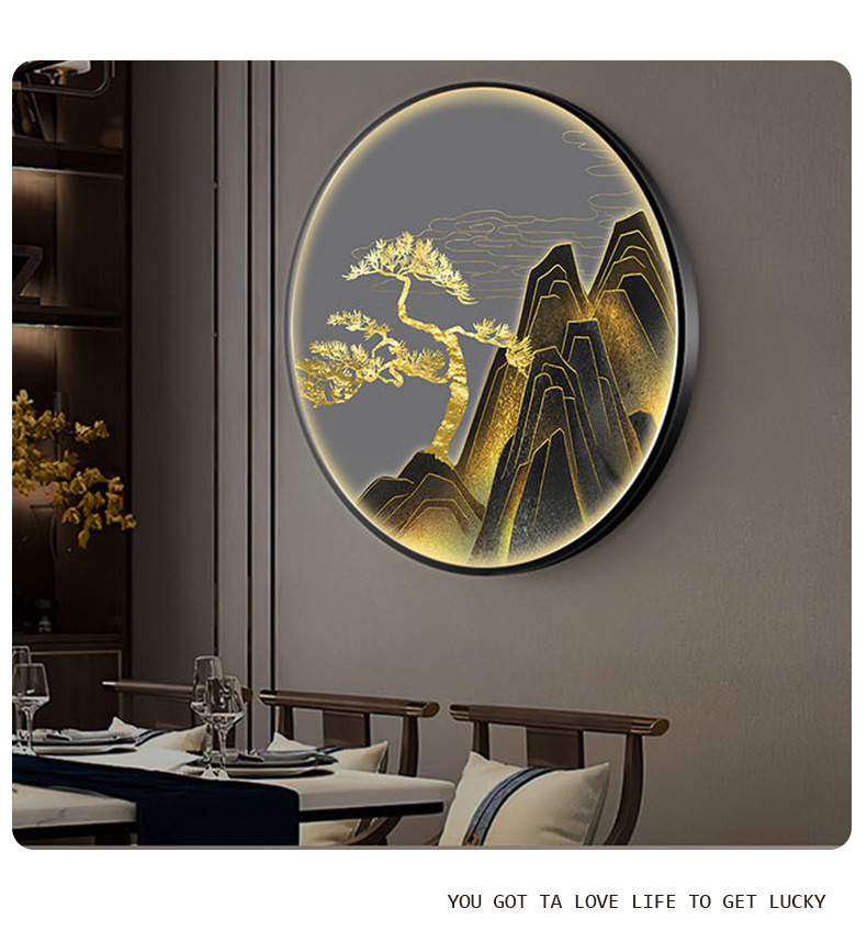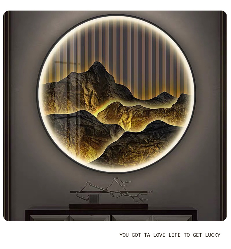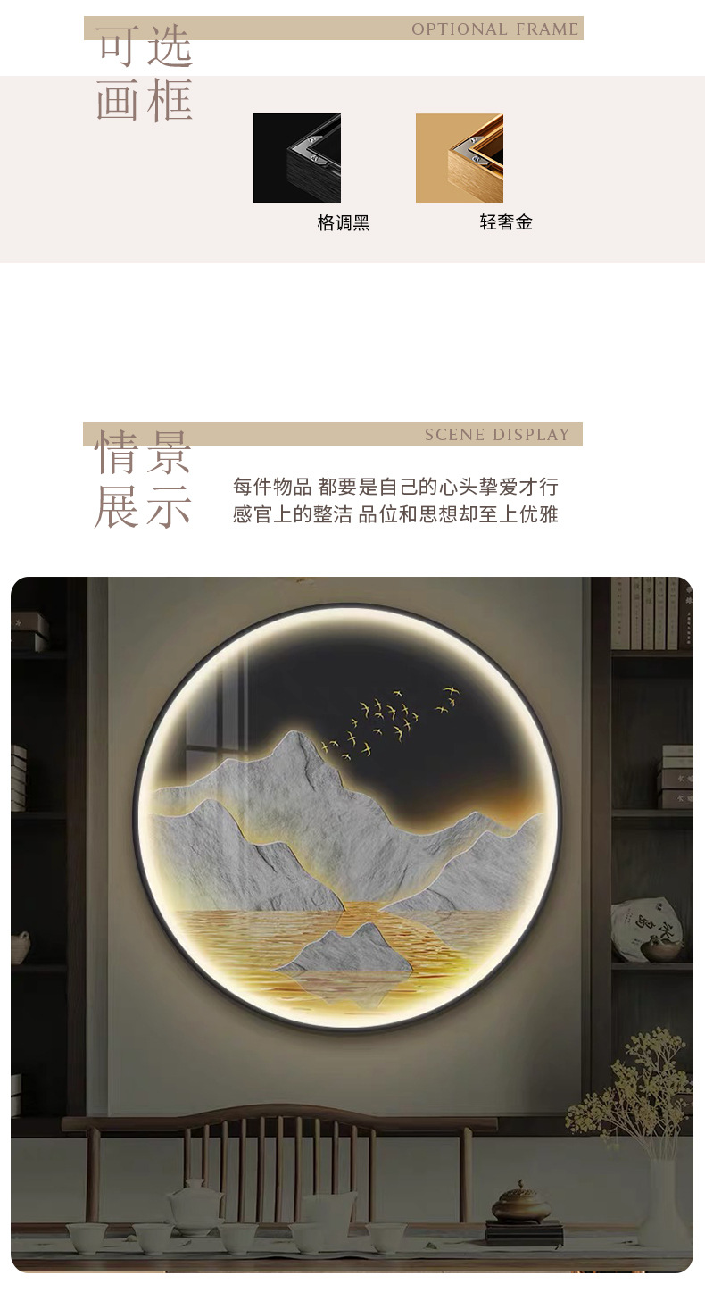 新中式玄关装饰画 led灯画禅意山水画客厅餐厅卧室圆形氛围画挂画