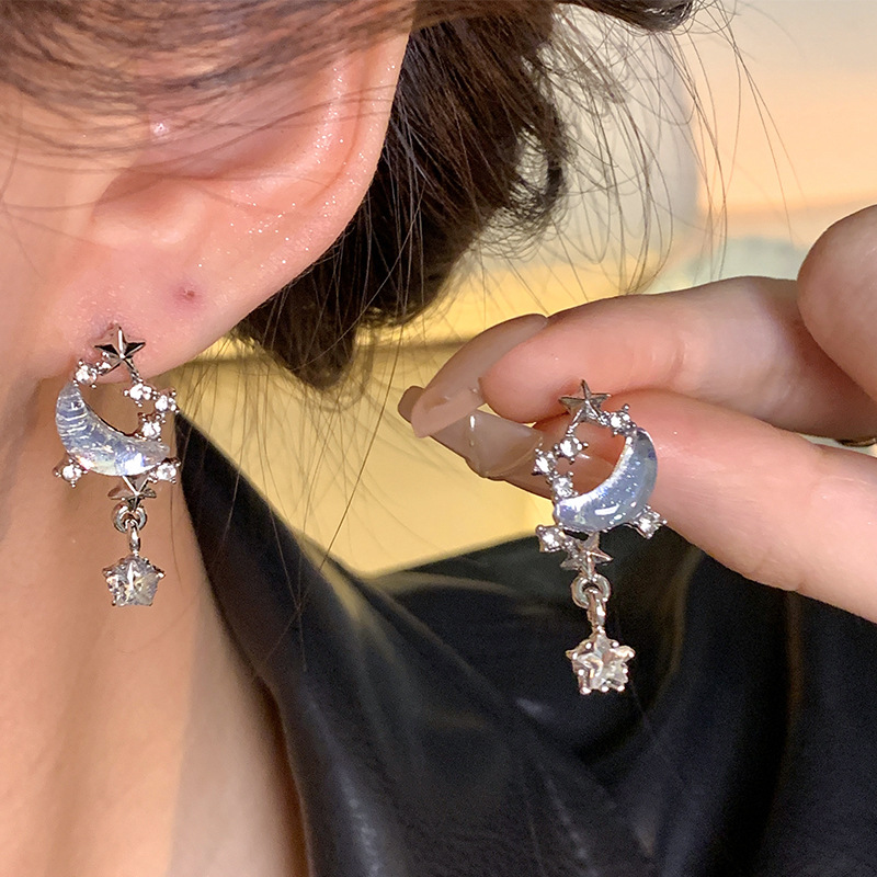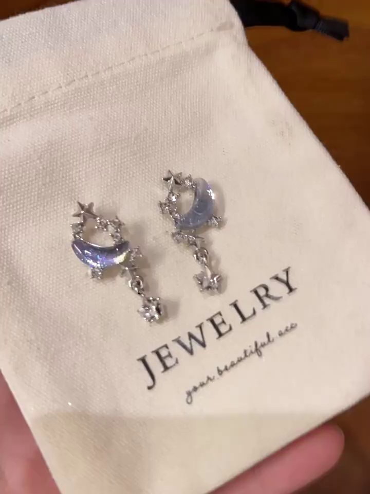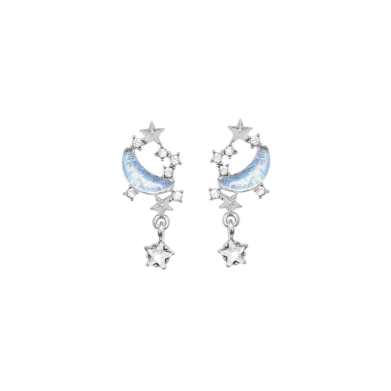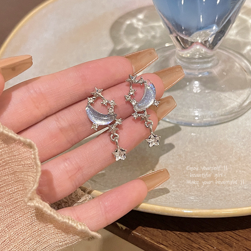 S925银针ins潮星月耳钉耳饰超仙气质蓝色星空长款流苏耳环女批发