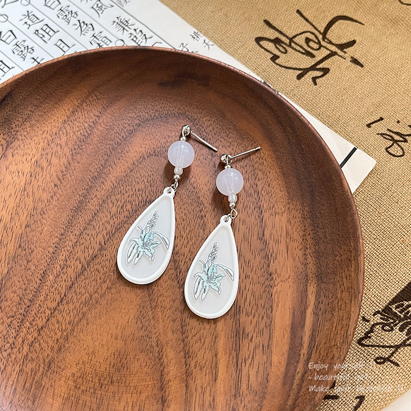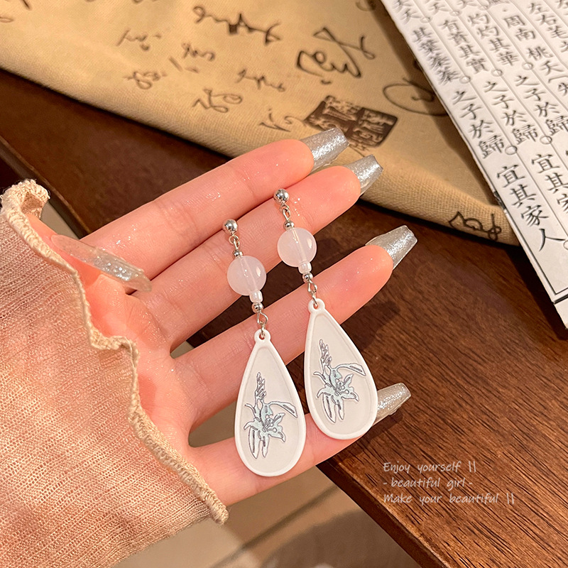 S925银针轻奢小众复古百搭气质花朵耳钉饰品新中式中古滴形耳环女