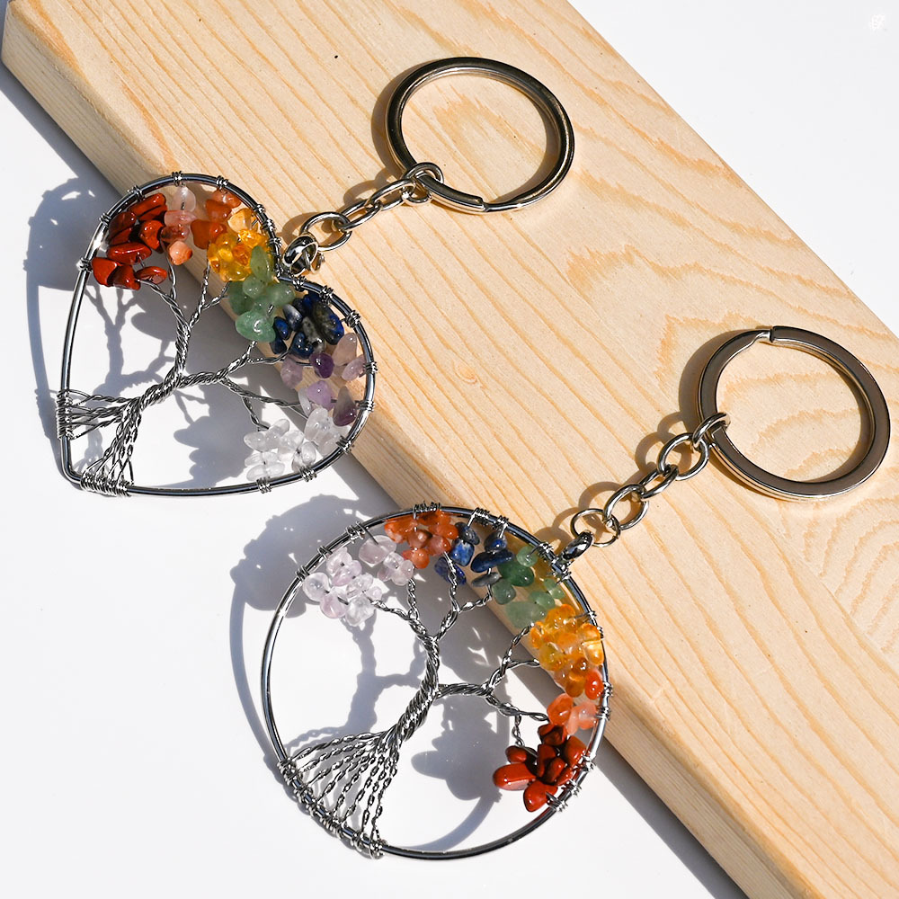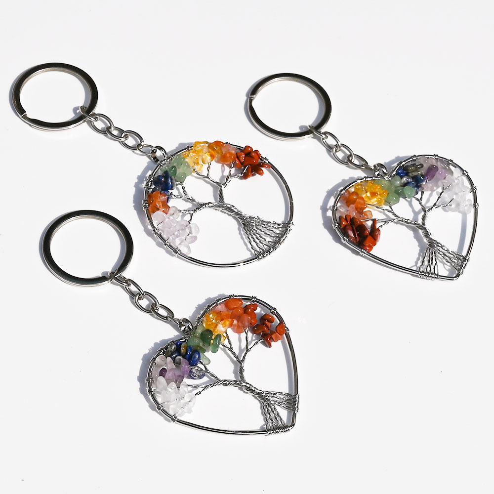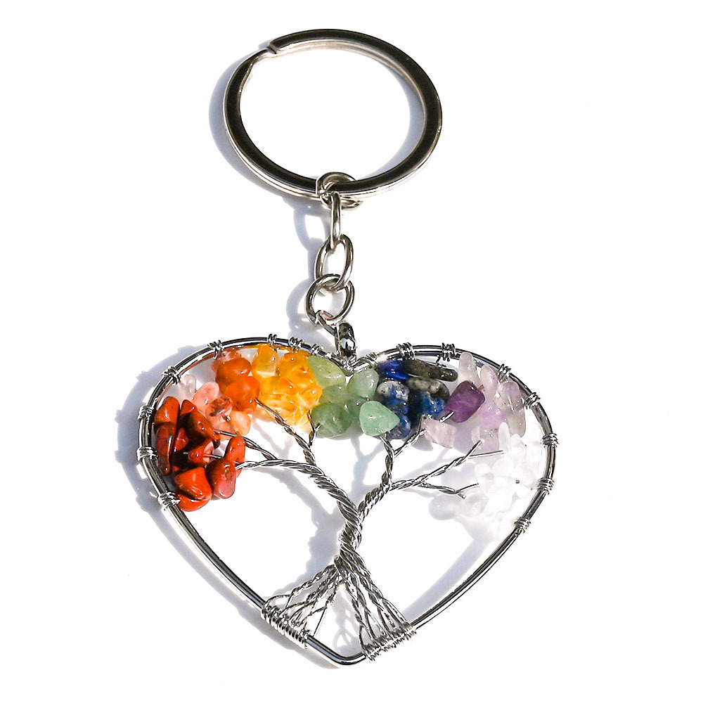 天然水晶七彩碎石生命树钥匙扣吊坠桃心查克拉瑜伽饰品发财树挂饰