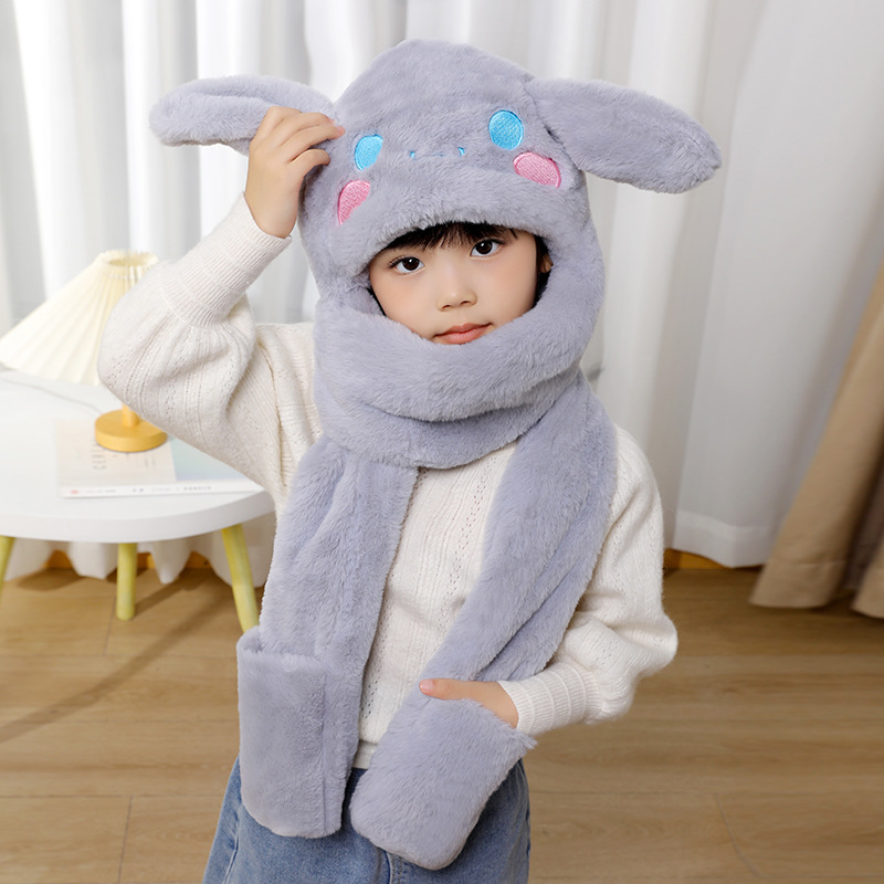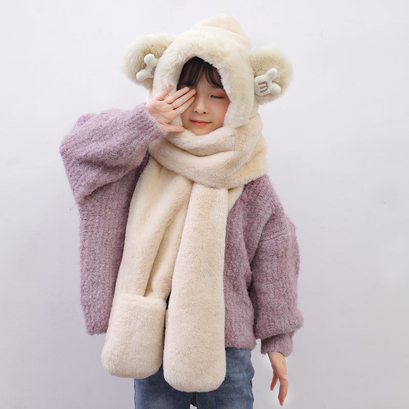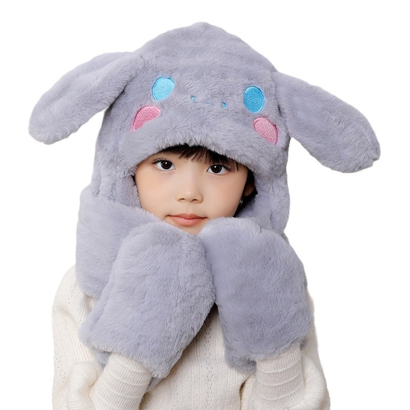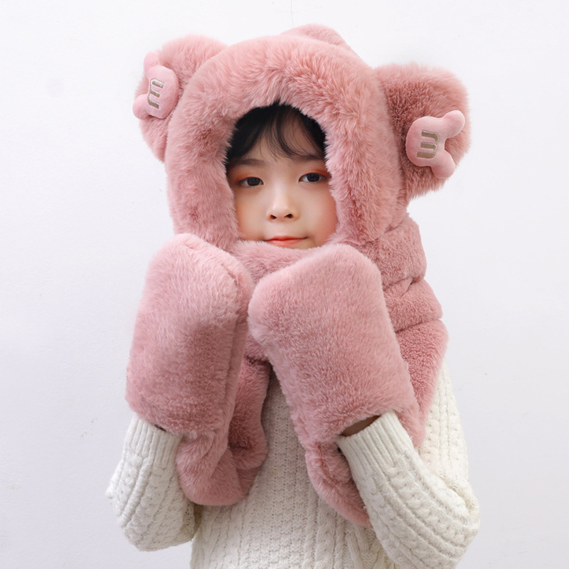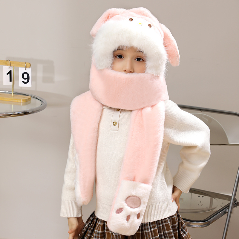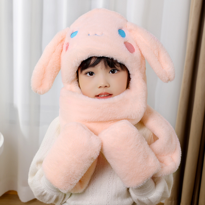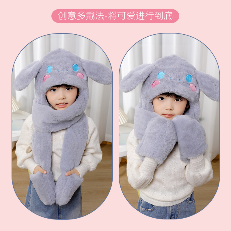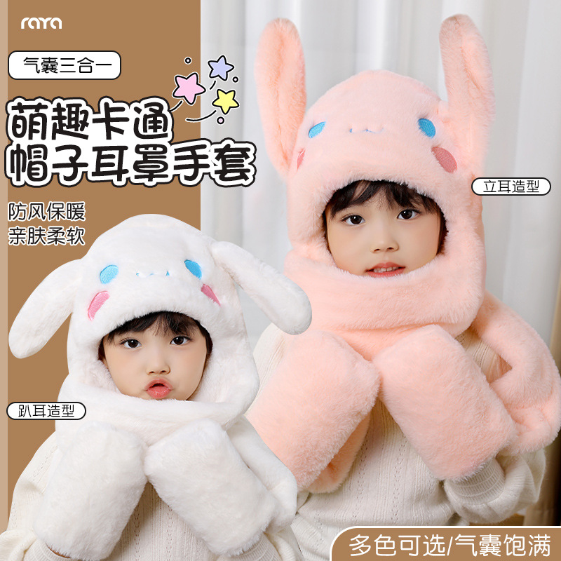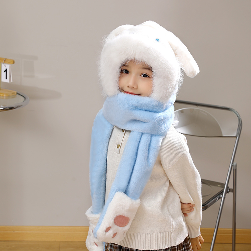 加绒加厚兔耳朵帽子儿童秋冬保暖围脖手套三件套女童围巾一体帽