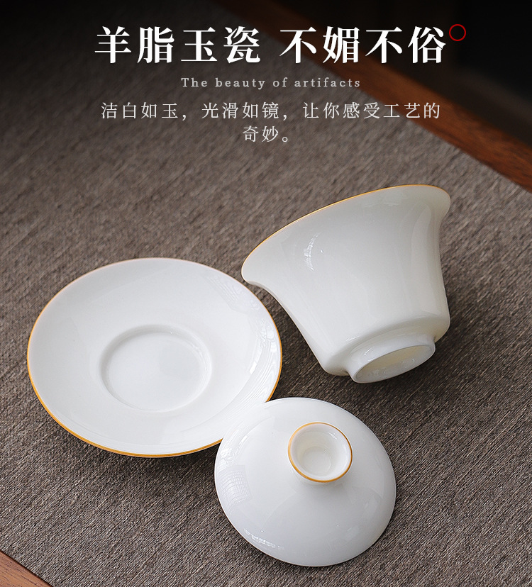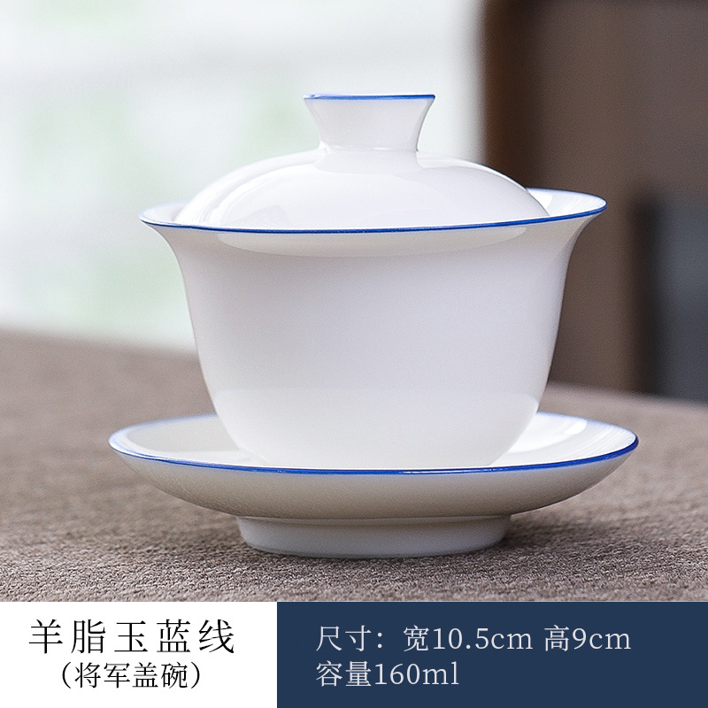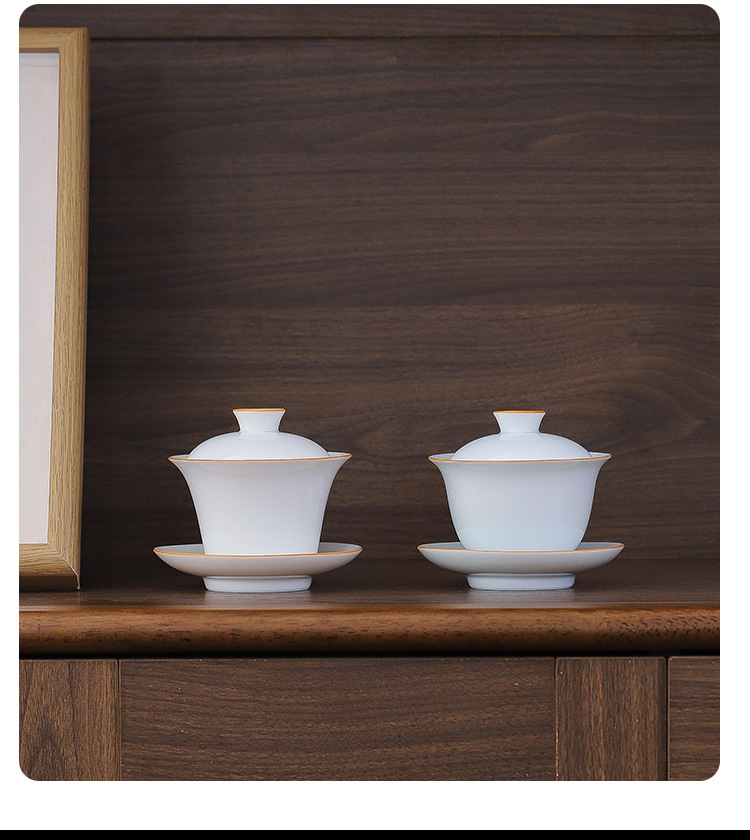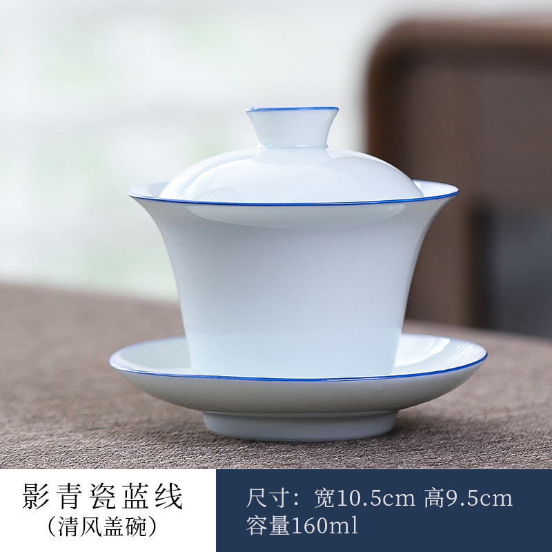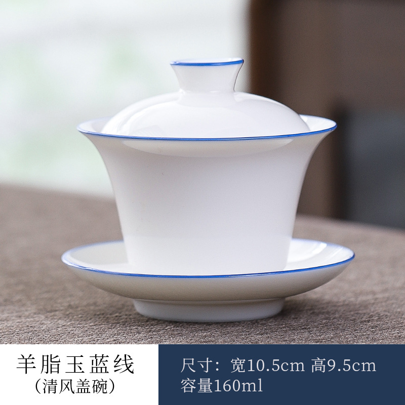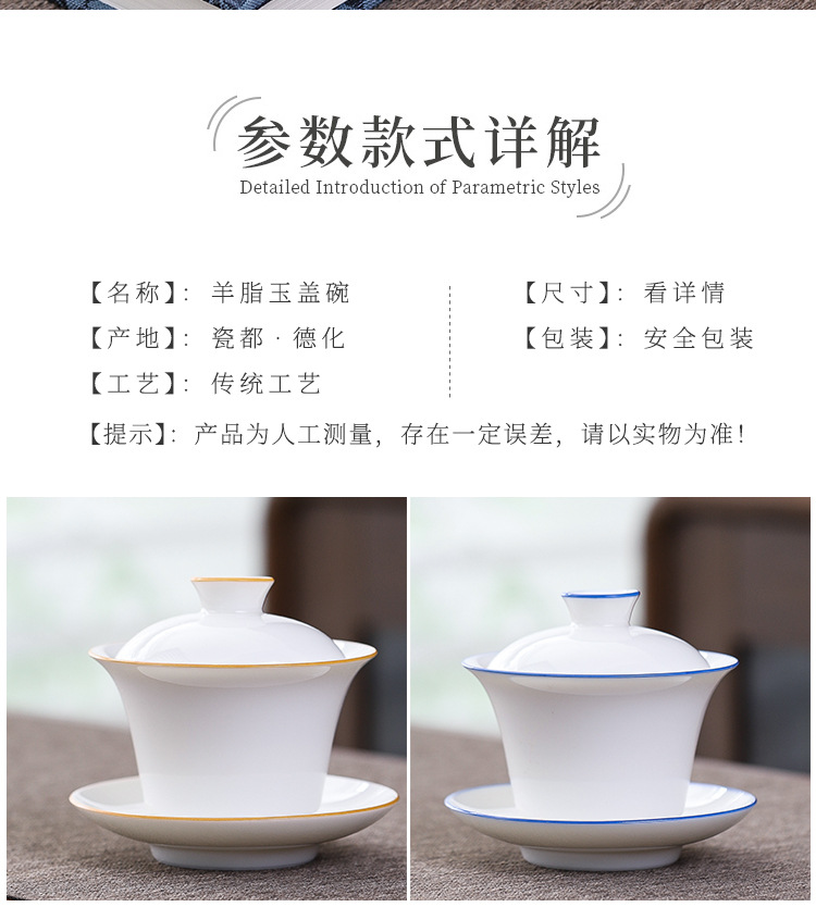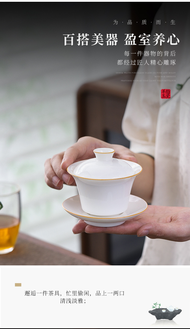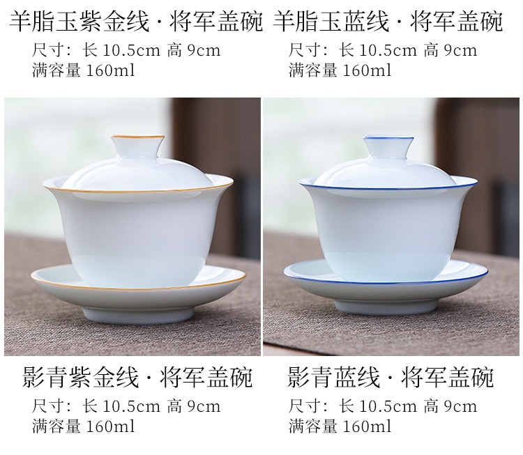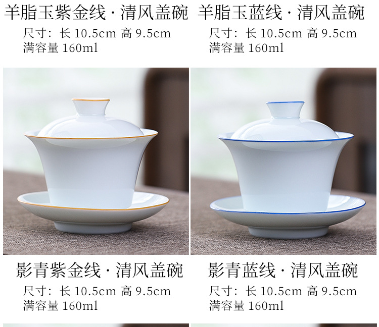 羊脂玉瓷盖碗 影青瓷手工紫线蓝线三才盖碗 德化纯白瓷敬茶泡茶碗