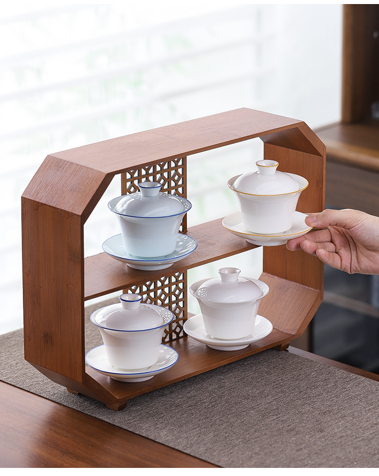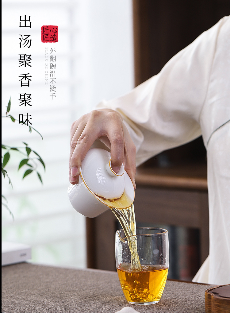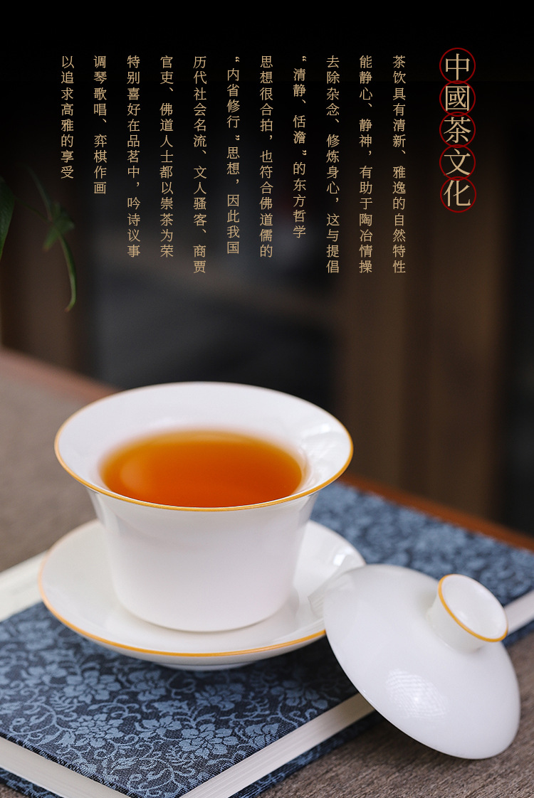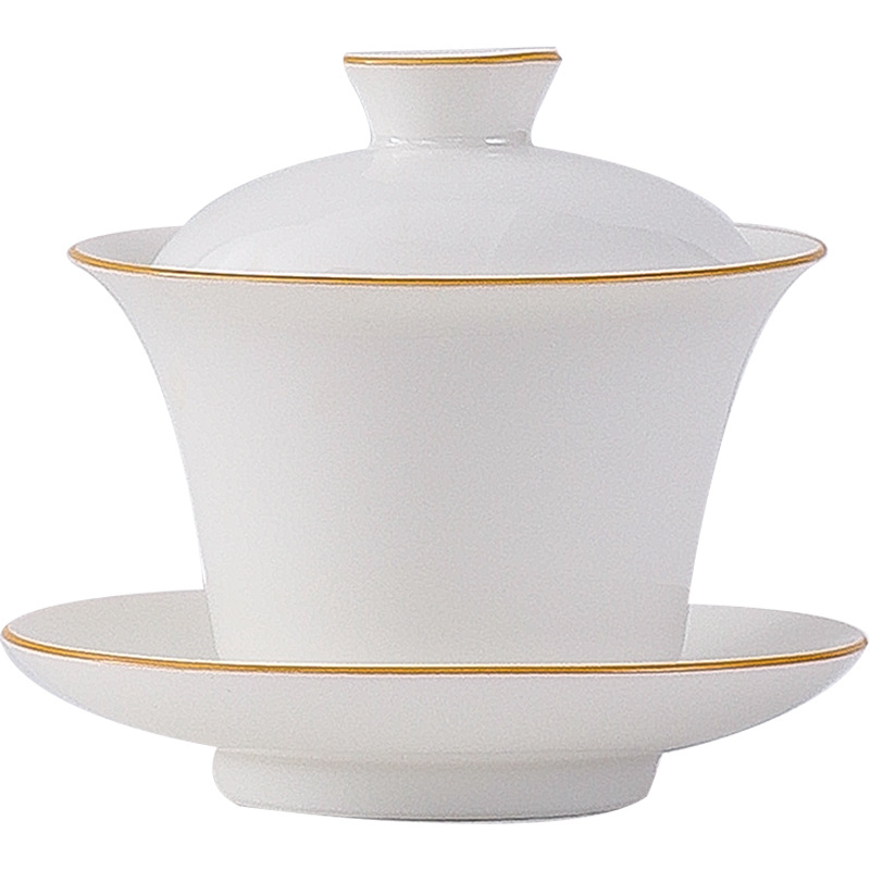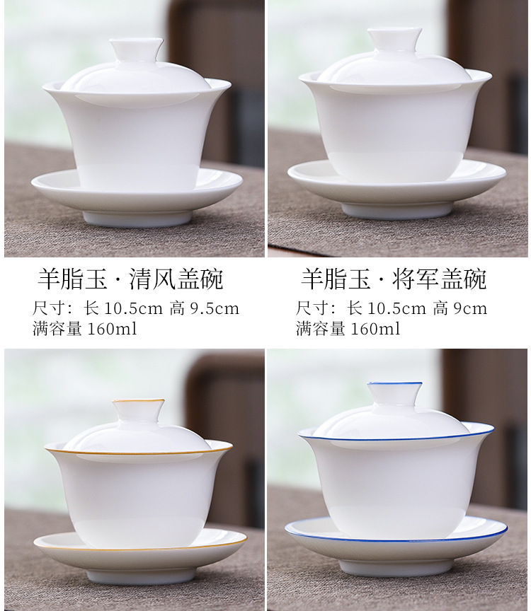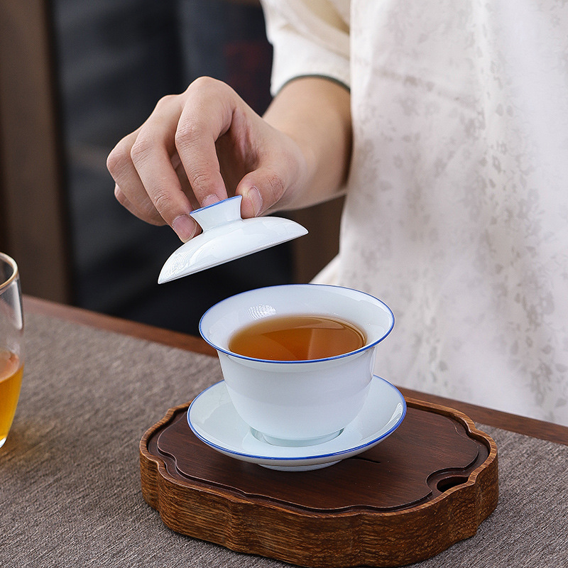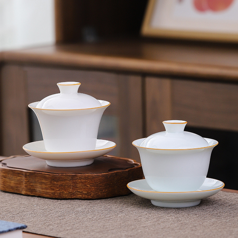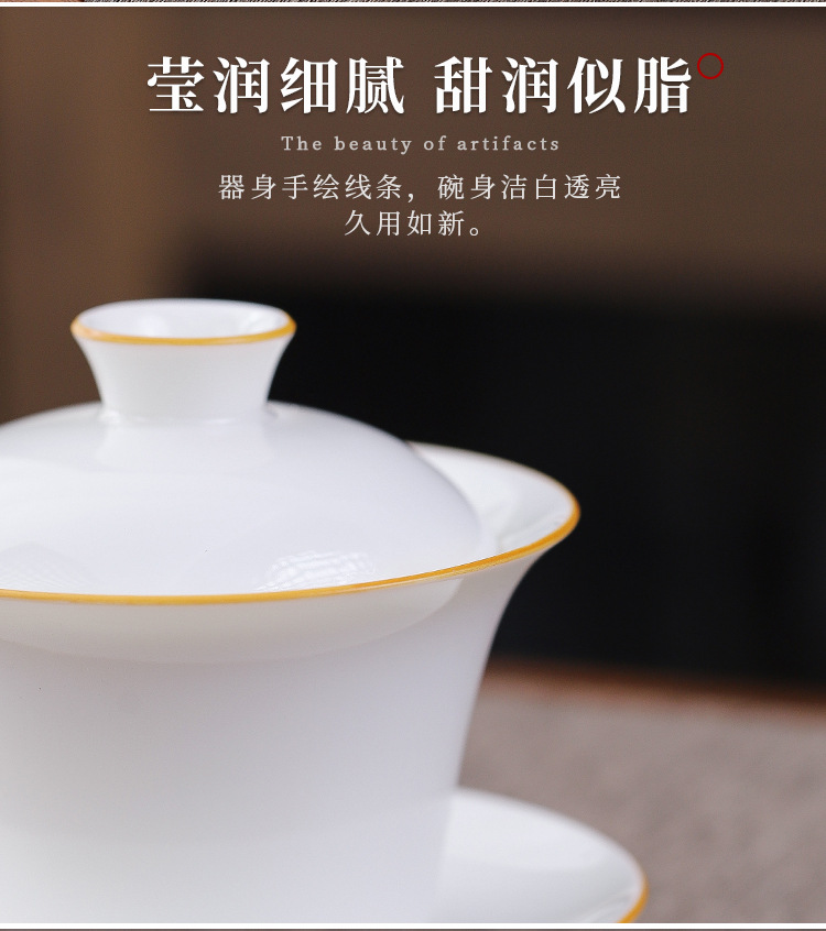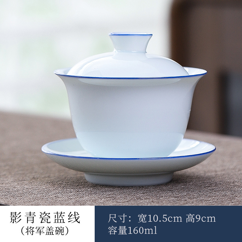 羊脂玉瓷盖碗 影青瓷手工紫线蓝线三才盖碗 德化纯白瓷敬茶泡茶碗