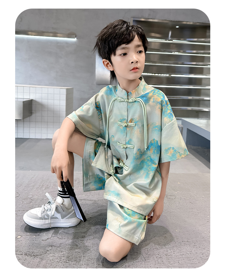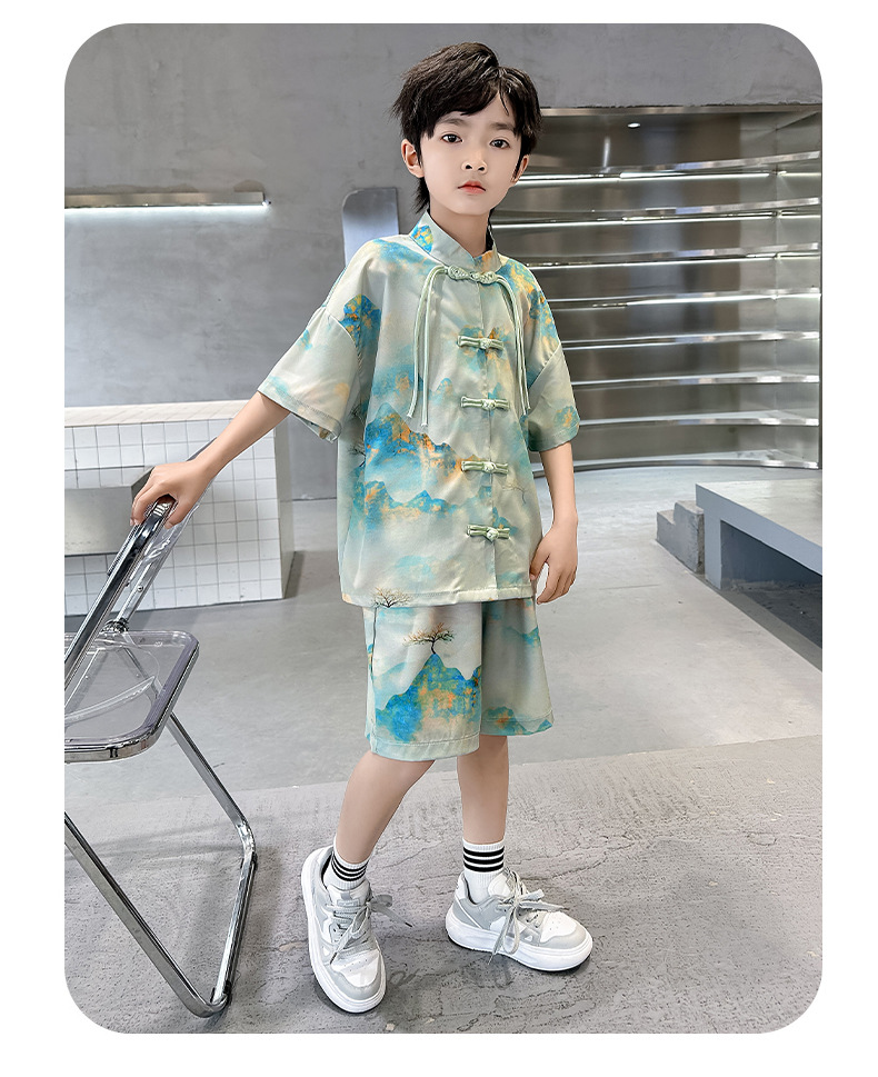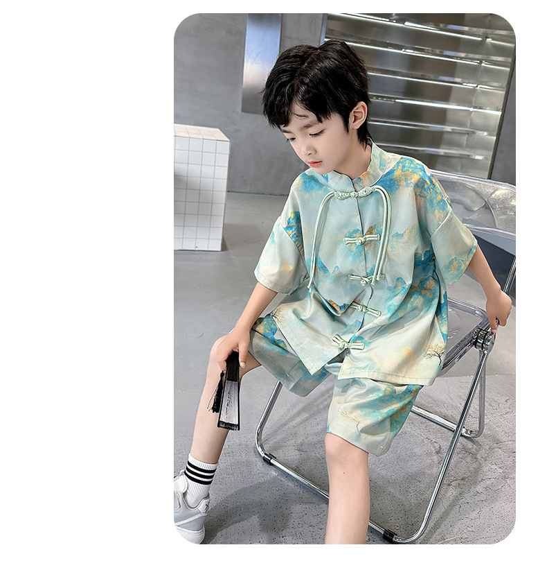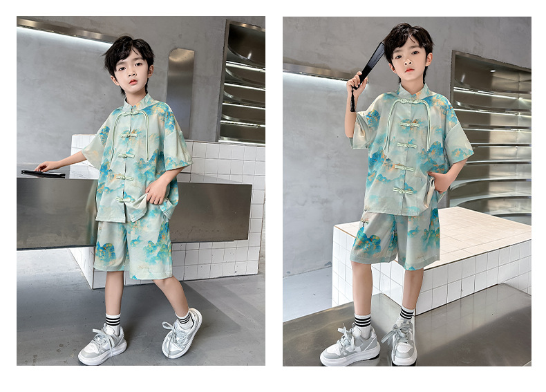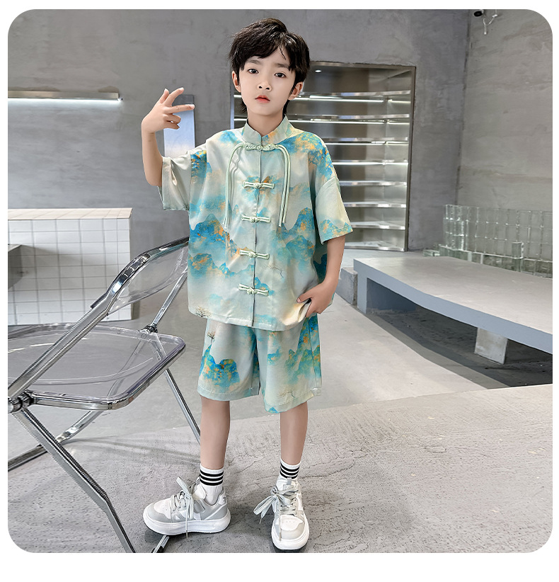 男童新中式汉服夏季潮款薄痞帅儿童短袖衬衫套装宝宝中国风唐宋装
