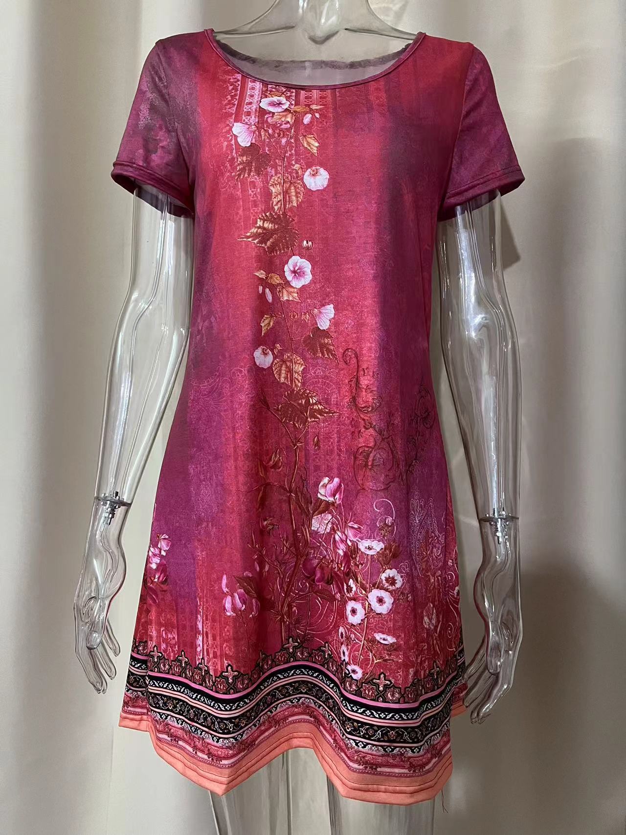 2023欧美女装亚马逊热销夏季新款宽松圆领民族风印花套头连衣裙