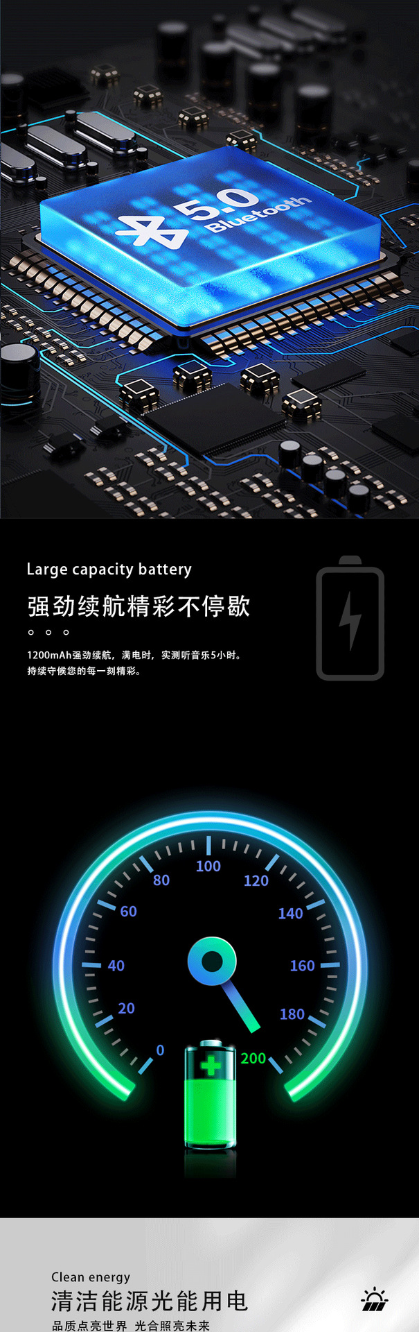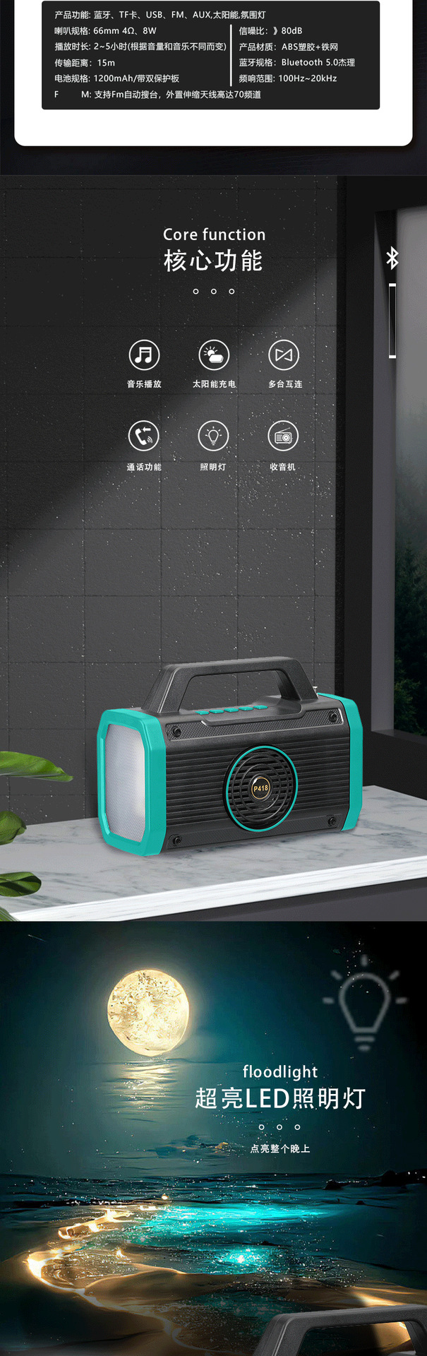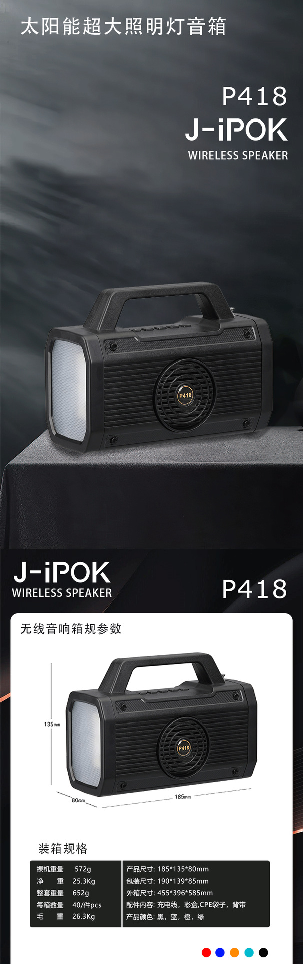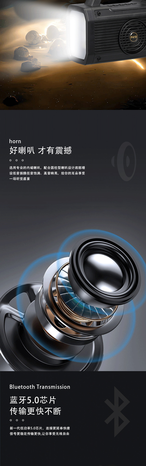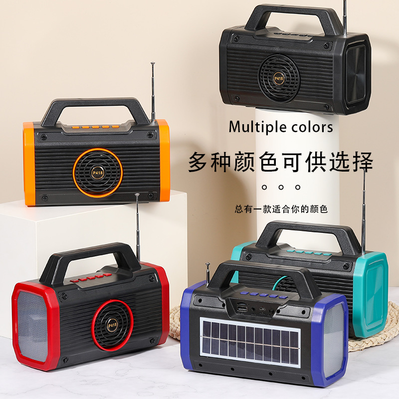 P418跨境爆款超长播放大容量智能蓝牙音箱太阳能手提式手电筒功能