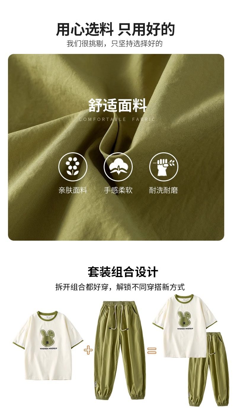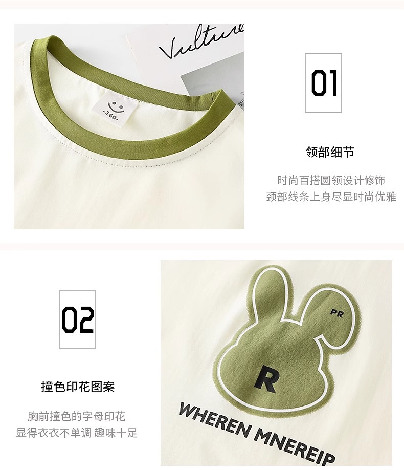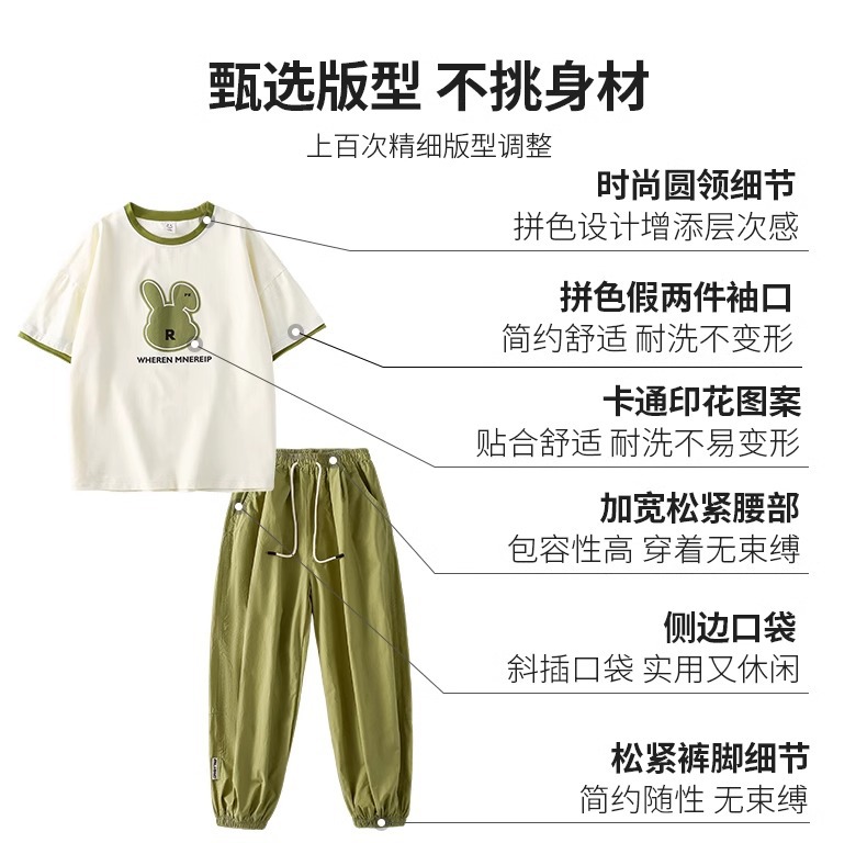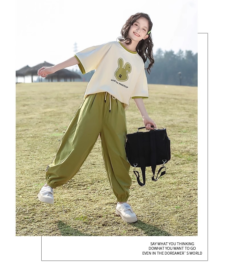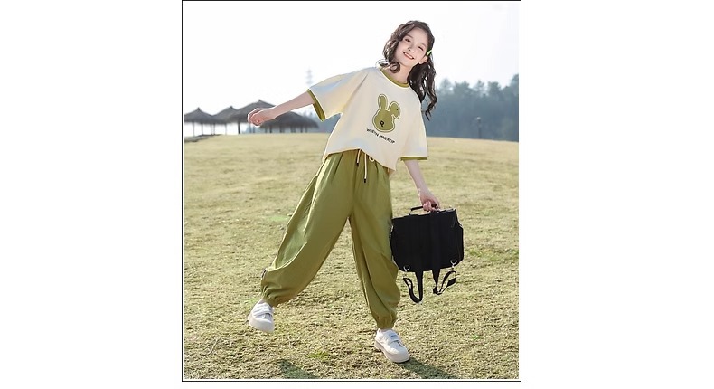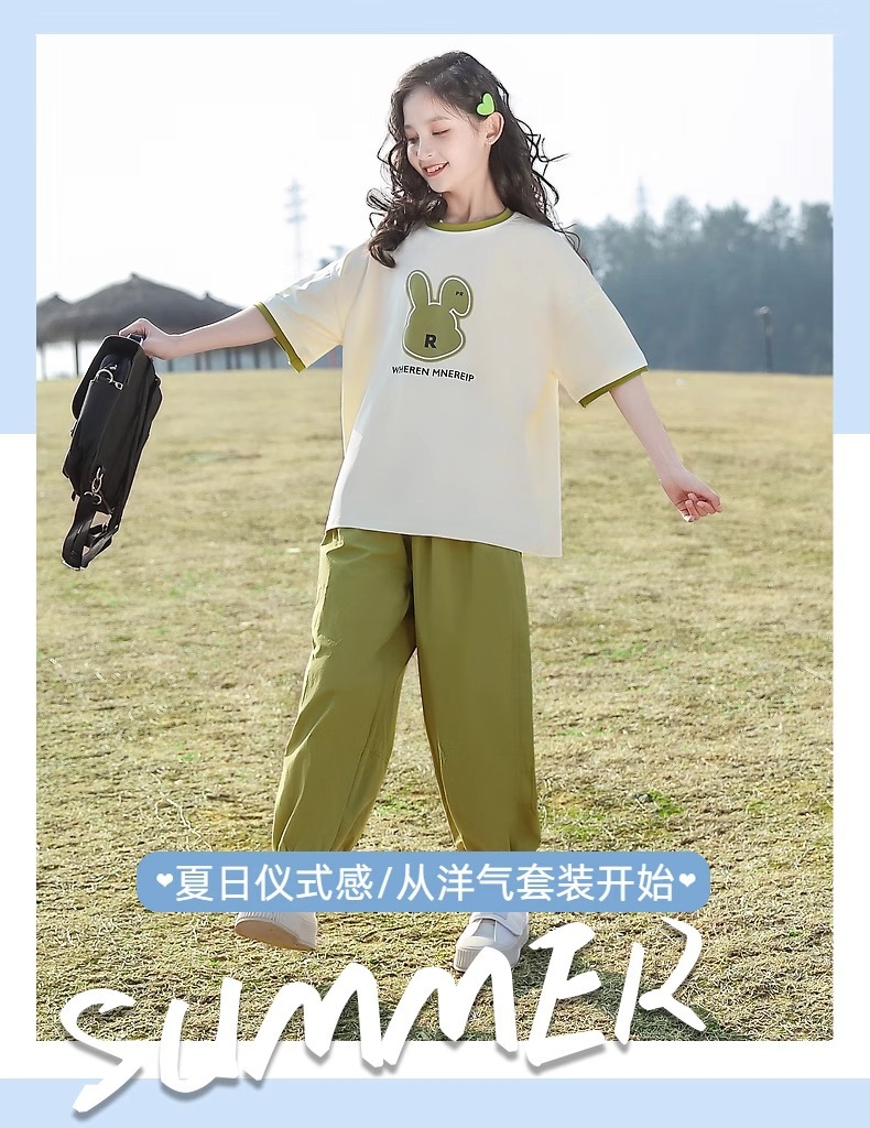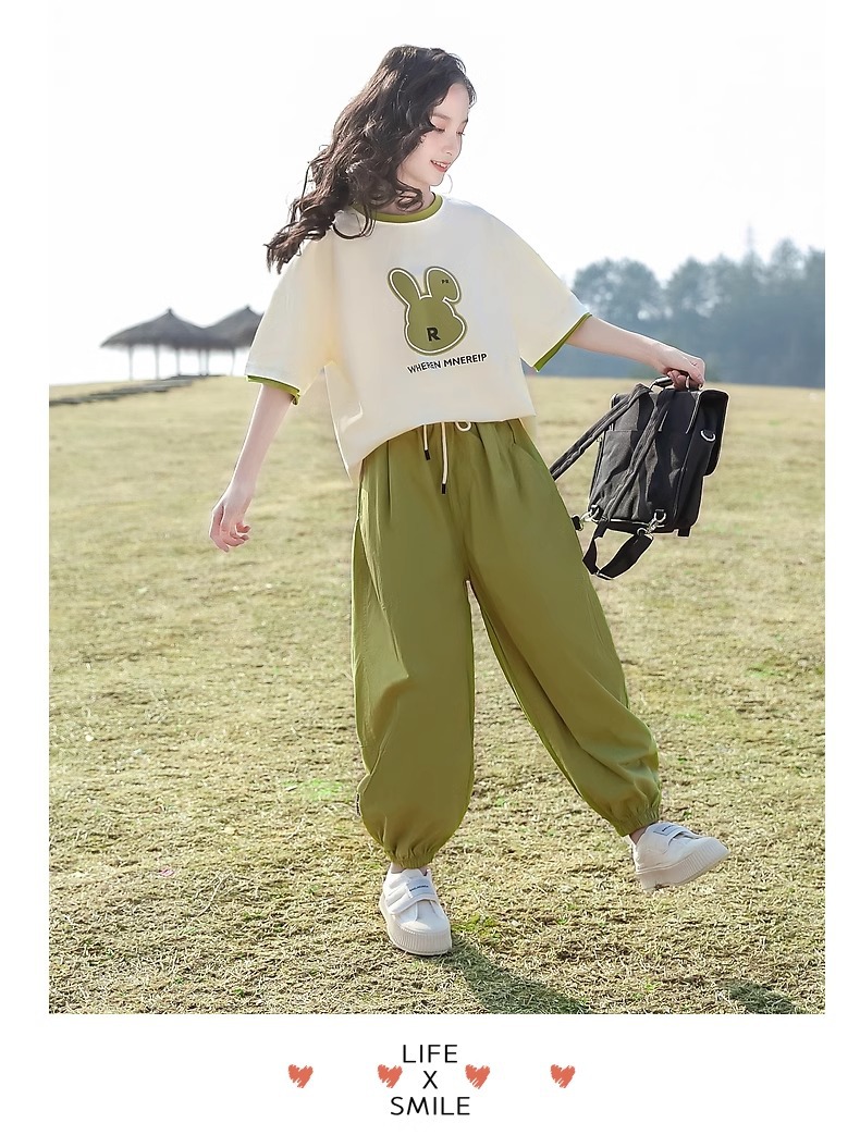 女童夏季套装2024新款休闲韩版短袖洋气绿色兔子潮酷阔腿裤两件套