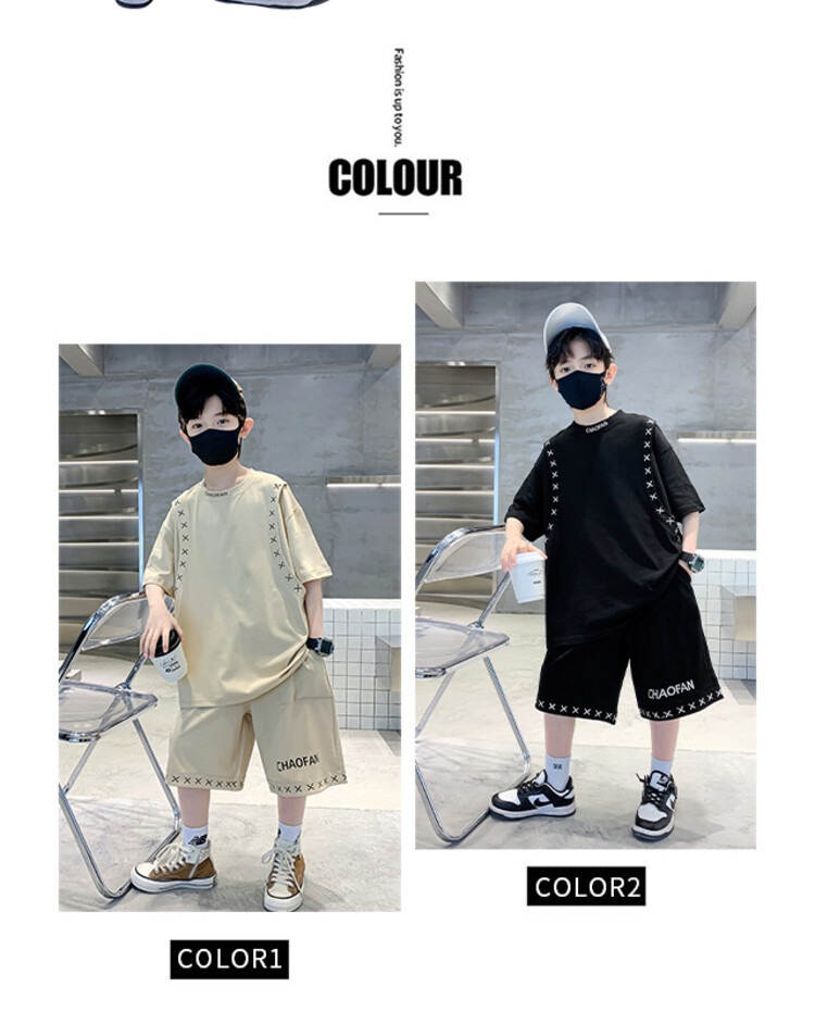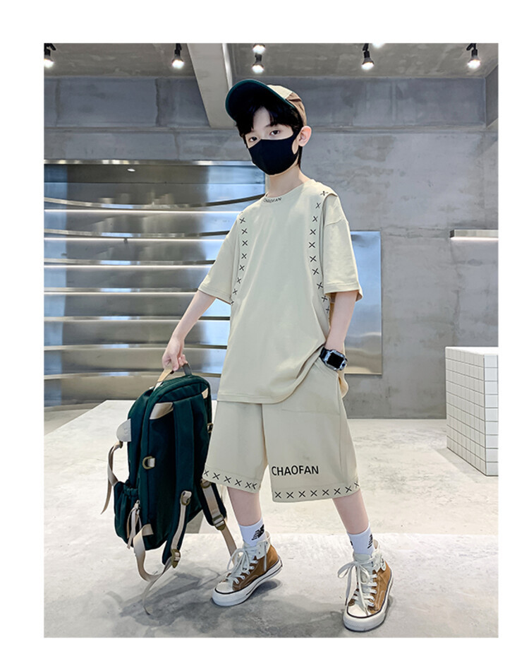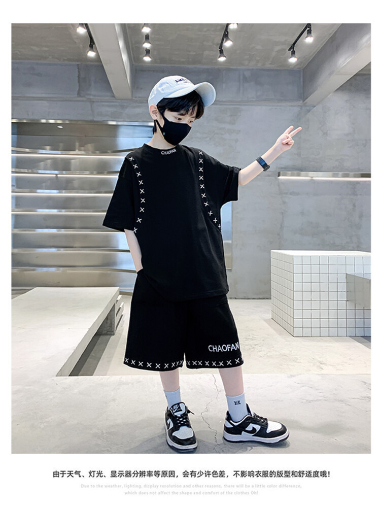 男童拼接袖短袖T恤套装2024夏季新款中大童儿童男孩洋气帅夏装潮