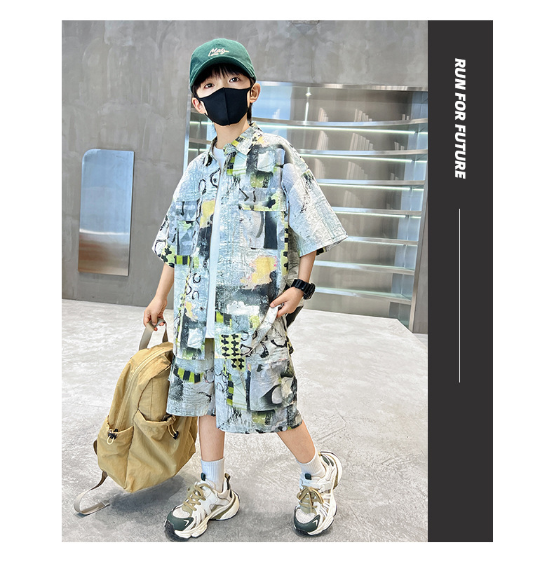 儿童港风衬衫套装2024新款中大童衬衣夏季帅气男短袖薄款度假衣服