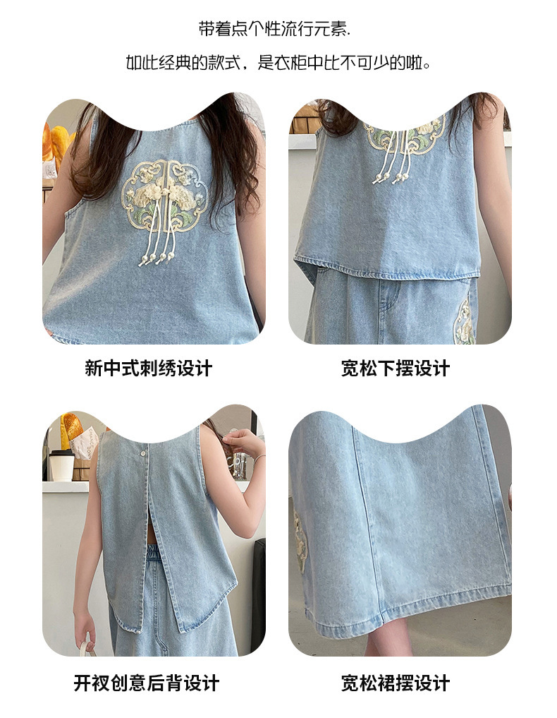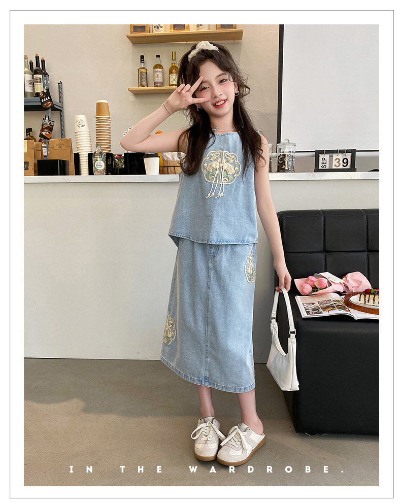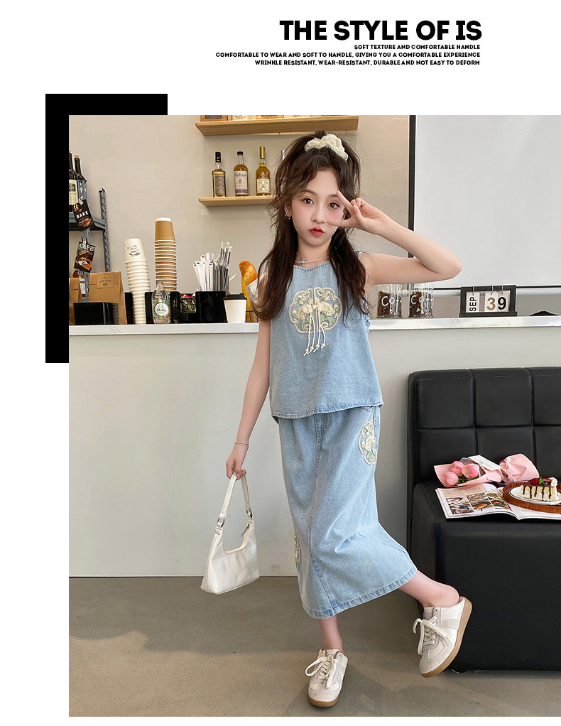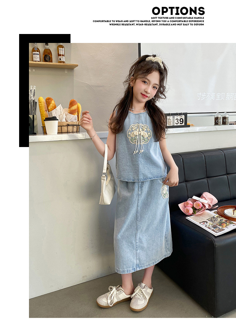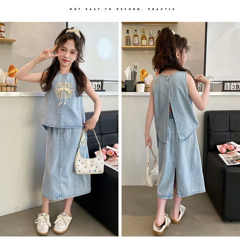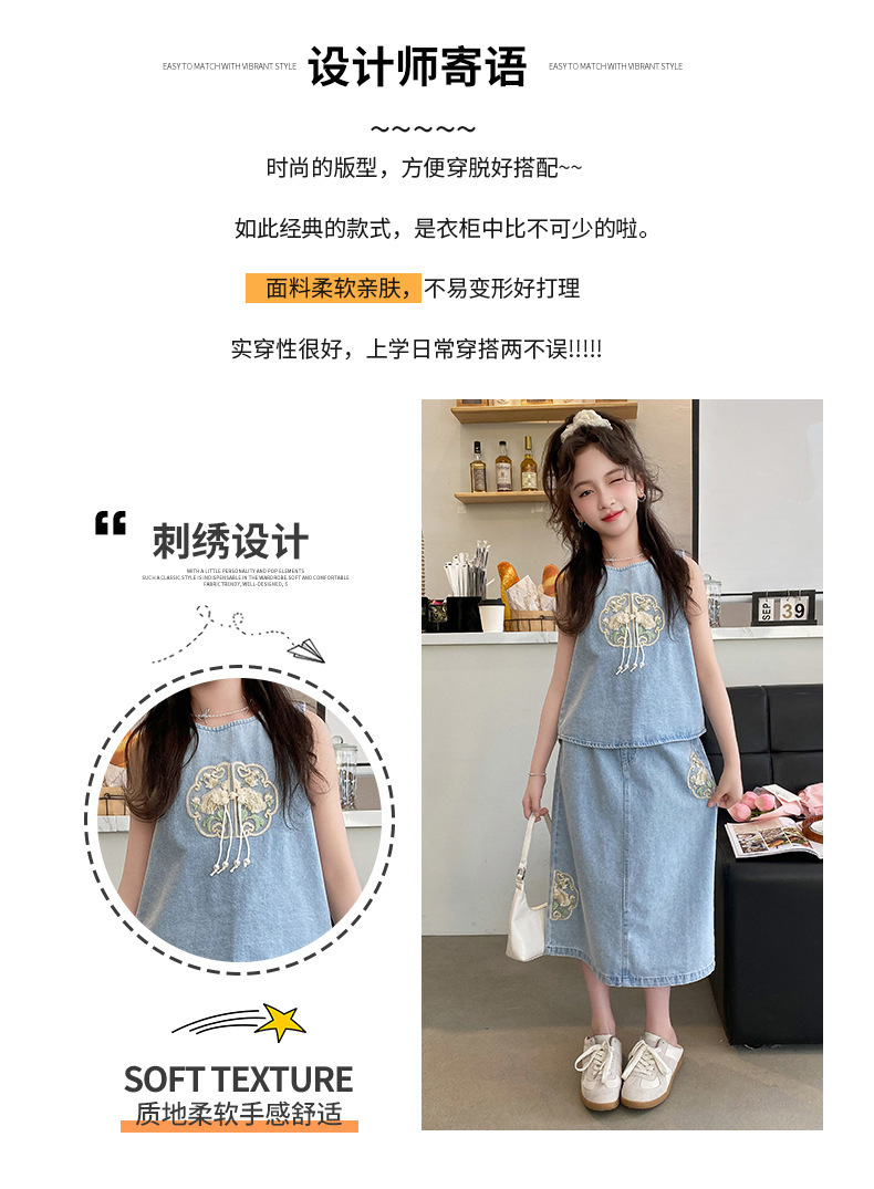 女童套装裙2024新款儿童国风新中式夏季牛仔裙连衣裙女孩两件套裙