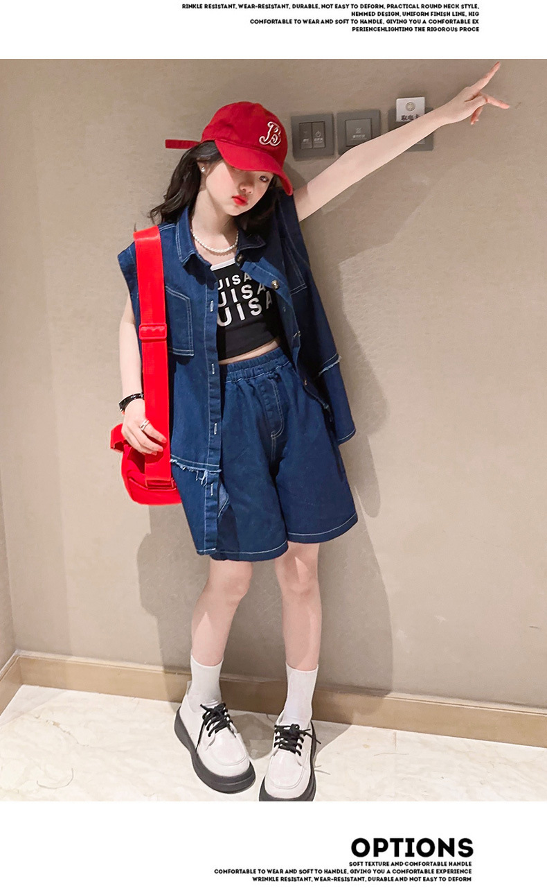 女童夏季牛仔马甲套装2024新款女大童潮酷牛仔短款两件套儿童夏装